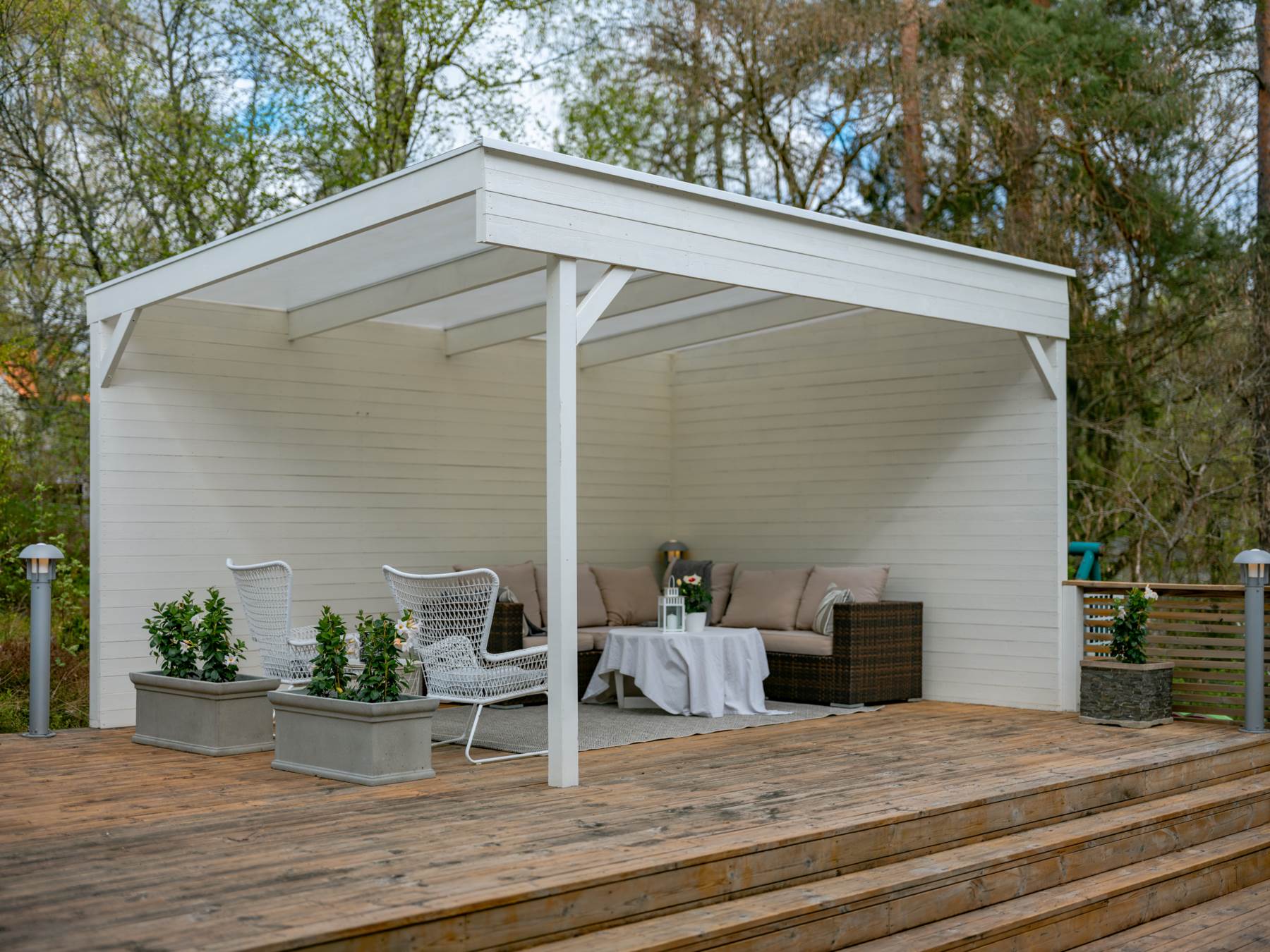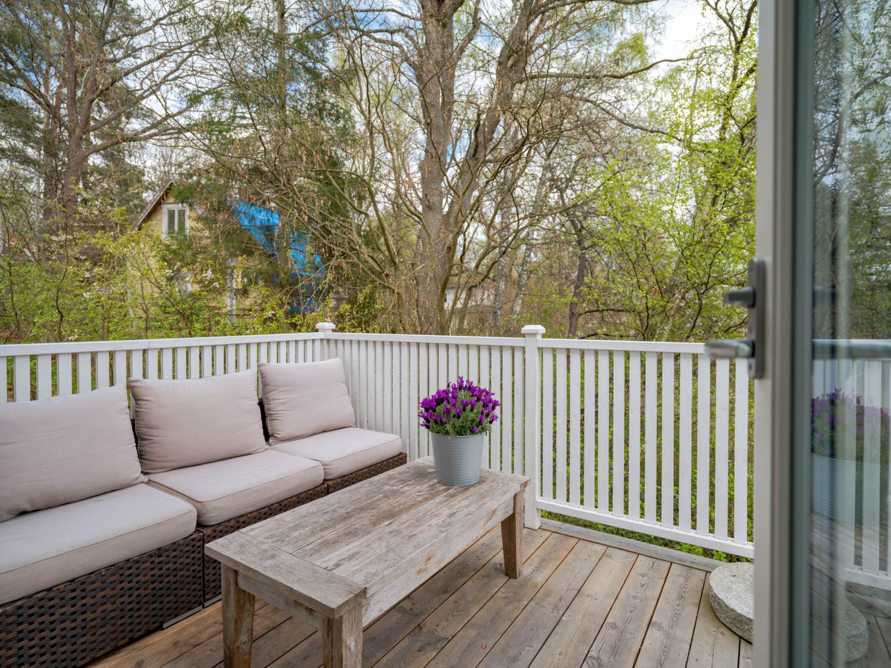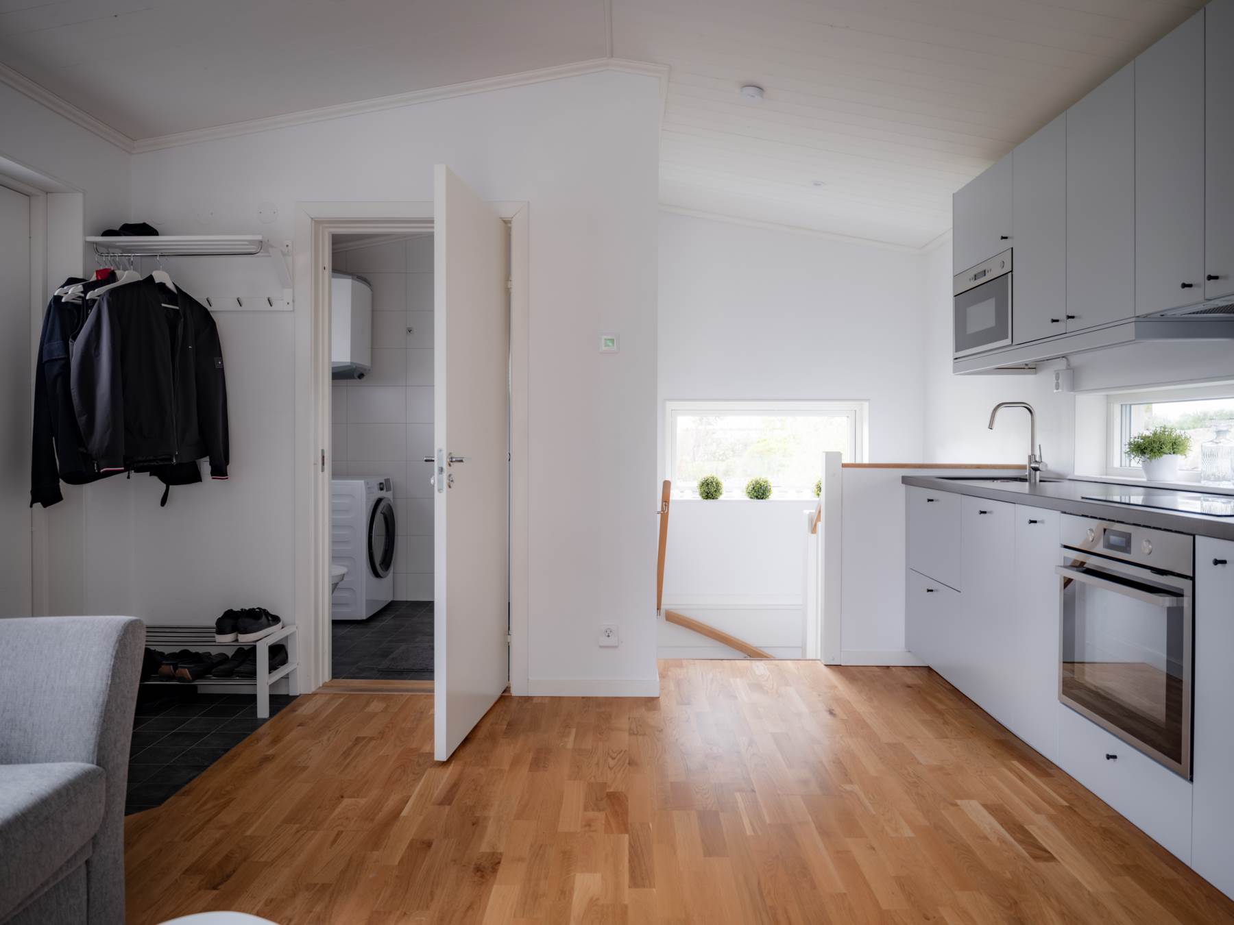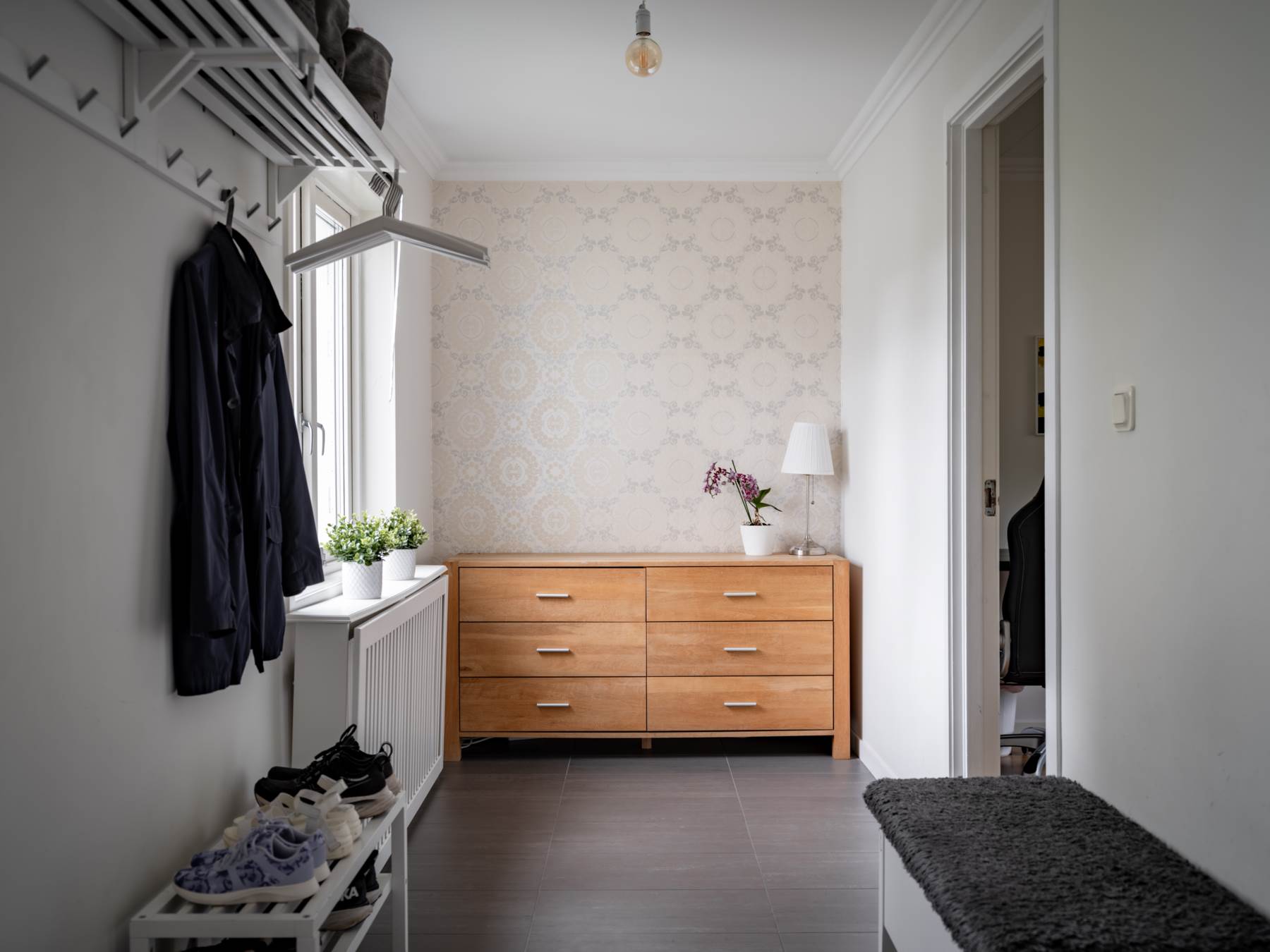Rymlig välkomnande hall med bra förvaring och fint ljusinsläpp från stora fönsterpartier, grått klinkergolv och vita väggar. Från hallen går det smidigt att ta sig ut på den stora altanen på baksidan av huset, som är totalt insynsskyddad. Här är det sol från tidig morgon till sen kväll, med en trevlig pergola och badtunna.