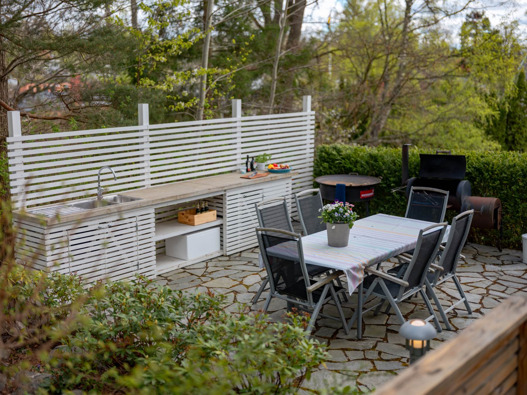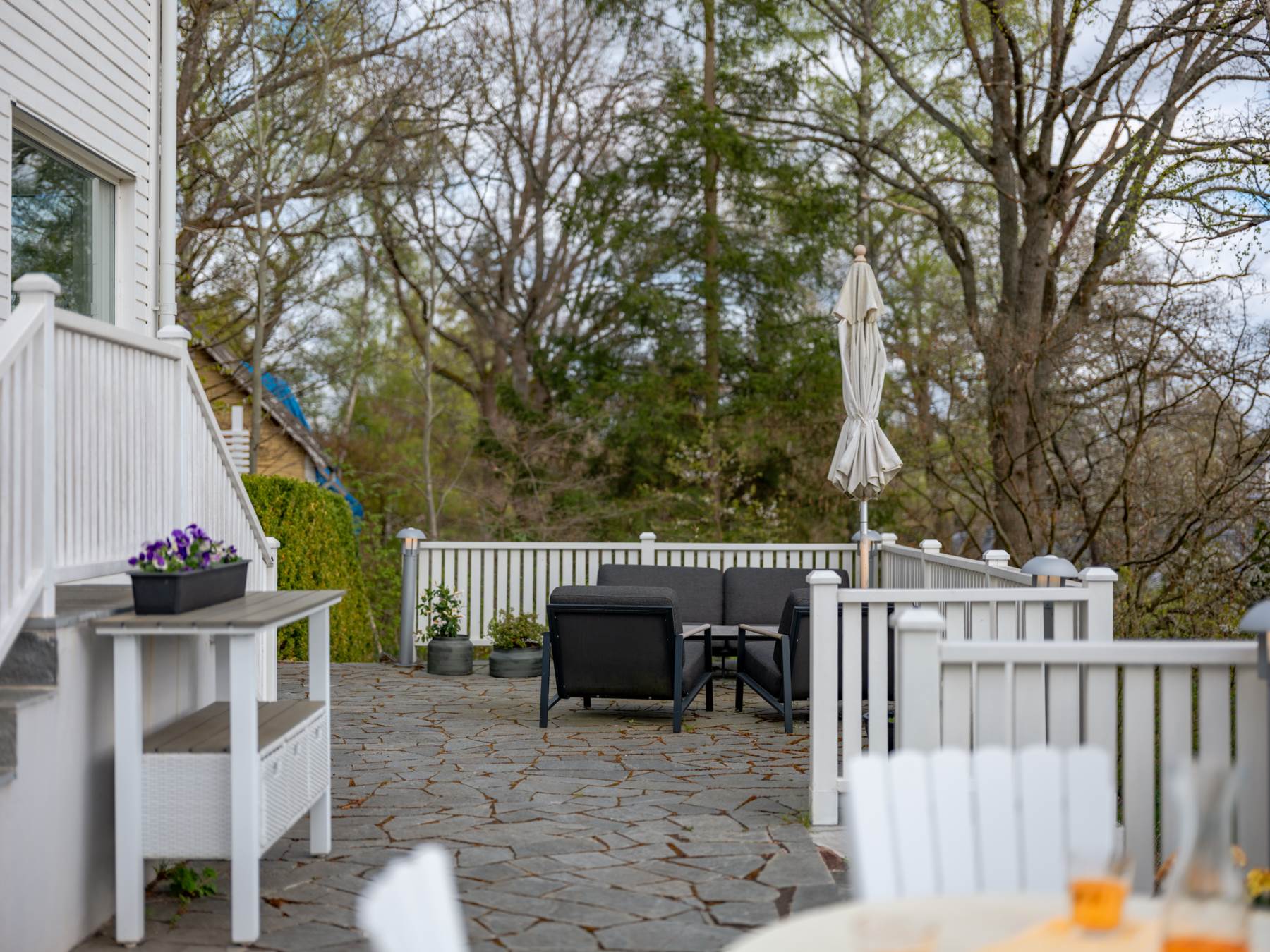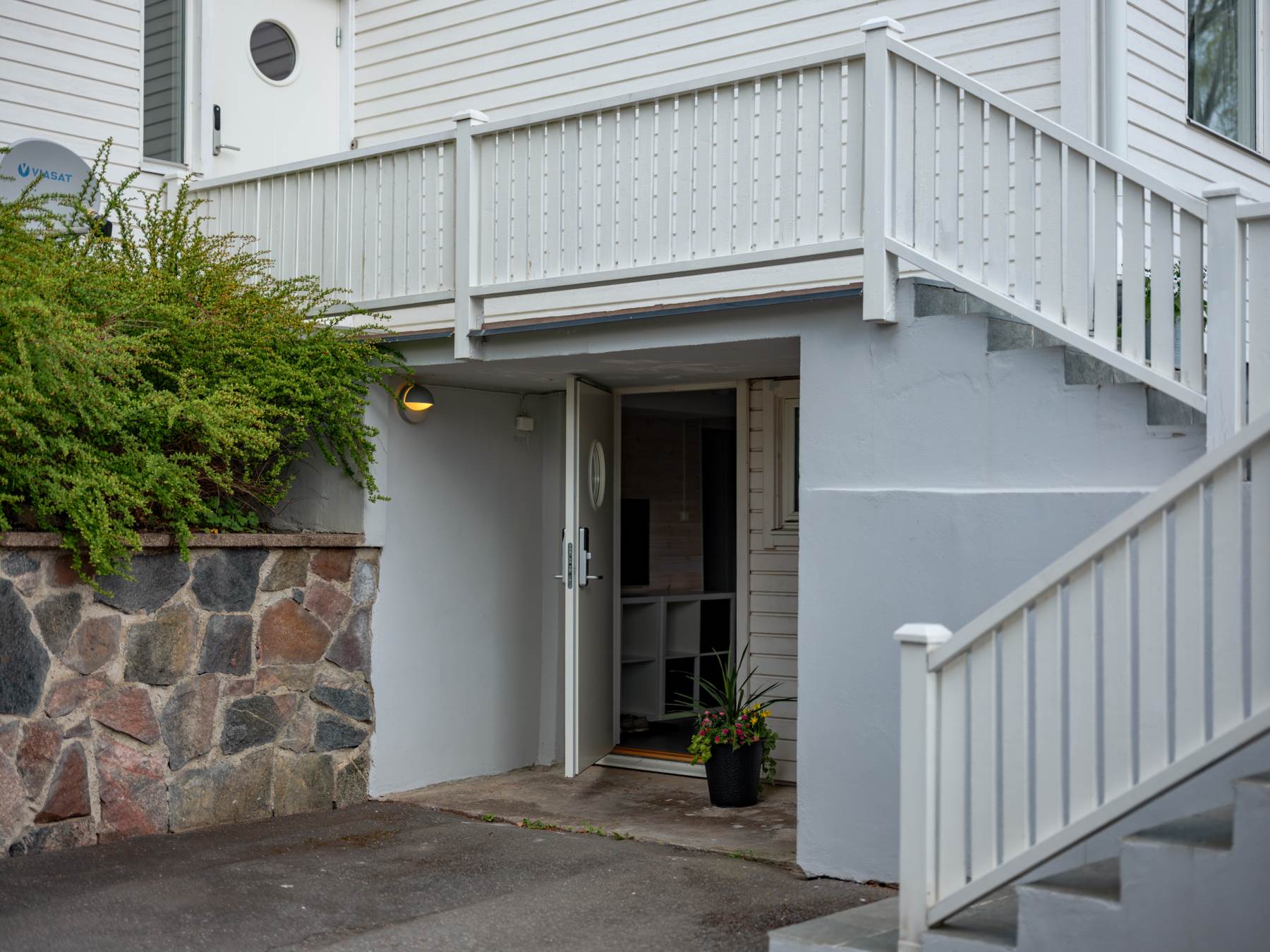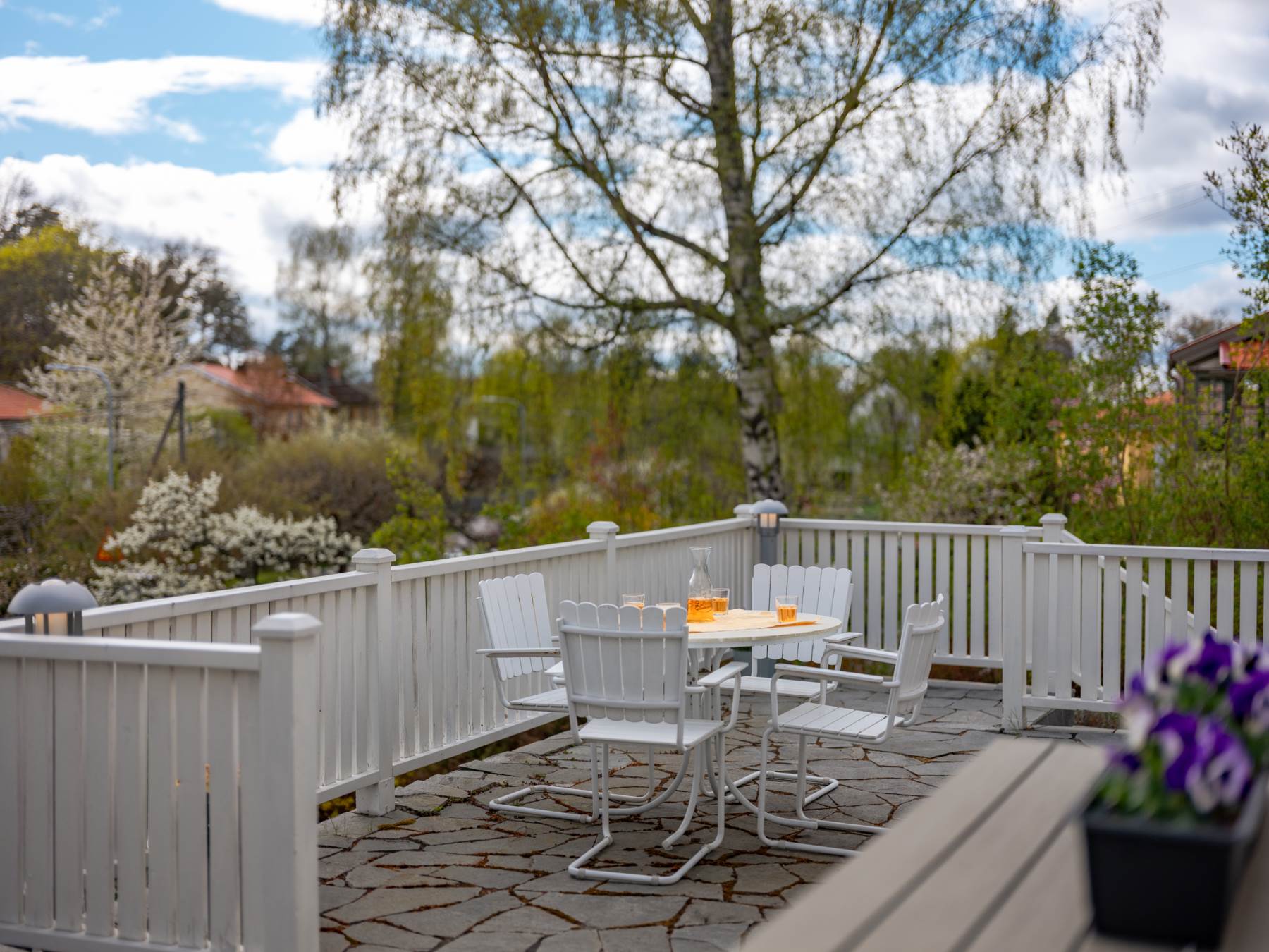 Rymlig välkomnande hall med bra förvaring och fint ljusinsläpp från stora fönsterpartier, grått klinkergolv och vita väggar. Från hallen går det smidigt att ta sig ut på den stora altanen på baksidan av huset, som är totalt insynsskyddad. Här är det sol från tidig morgon till sen kväll, med en trevlig pergola och badtunna.