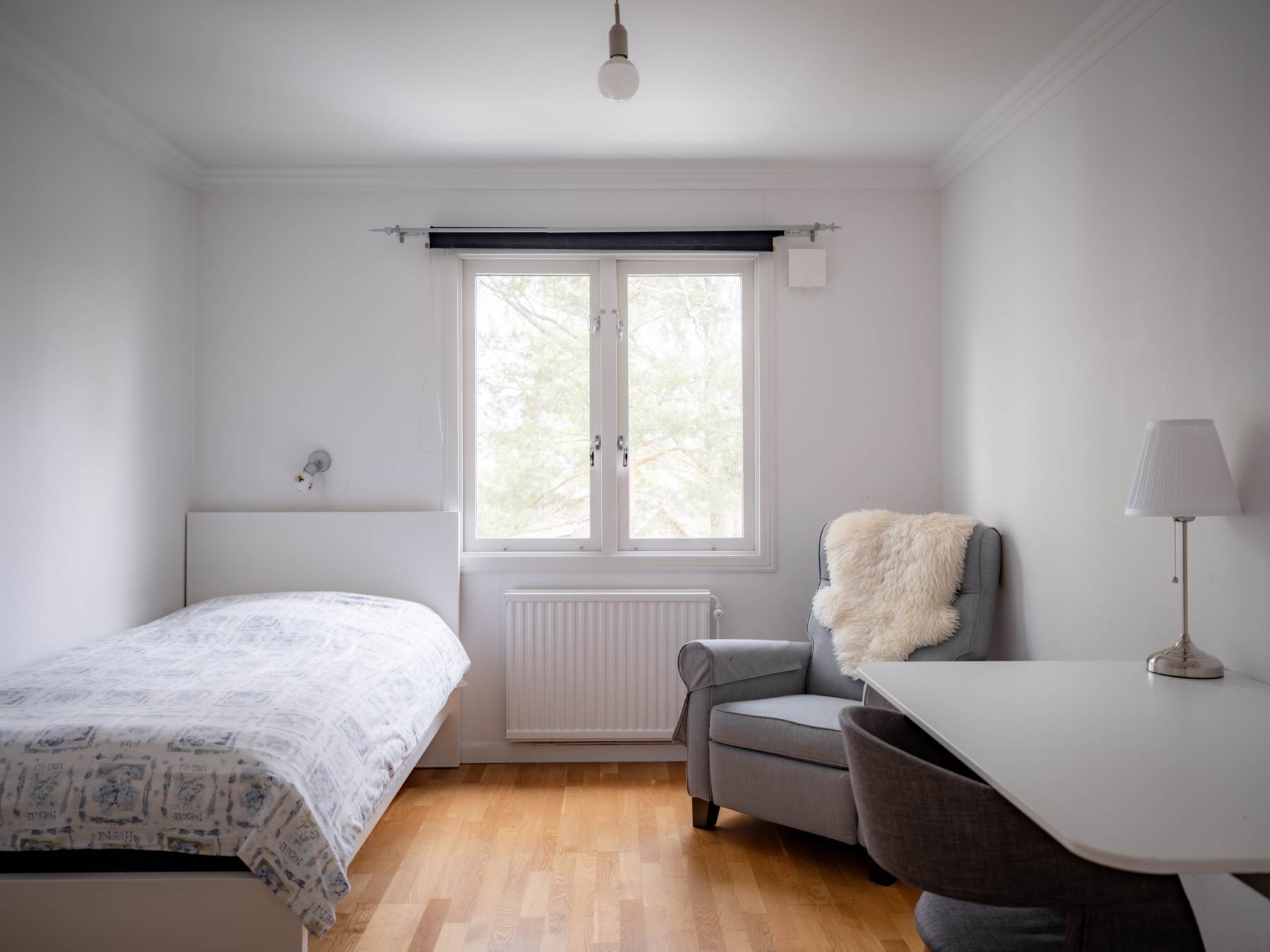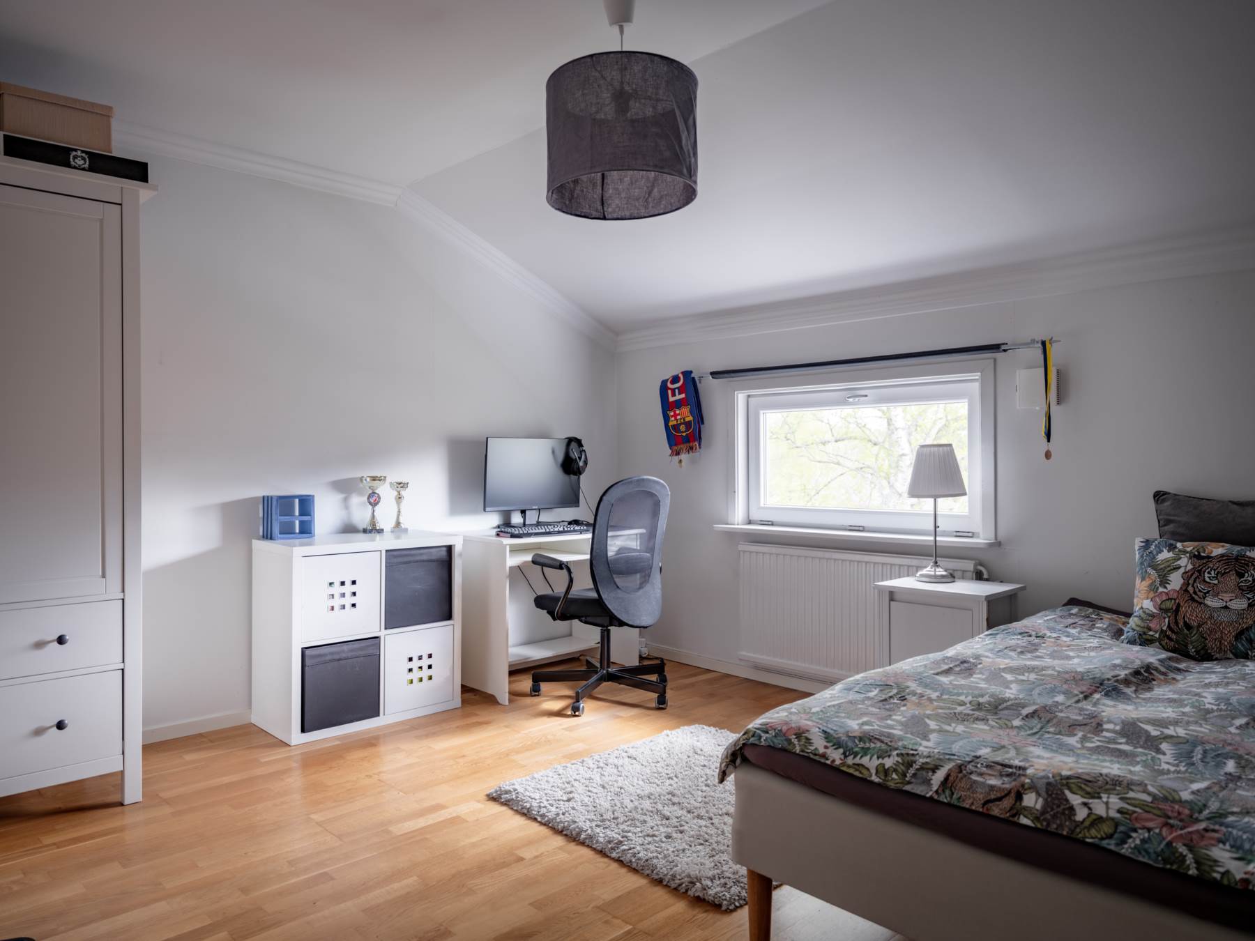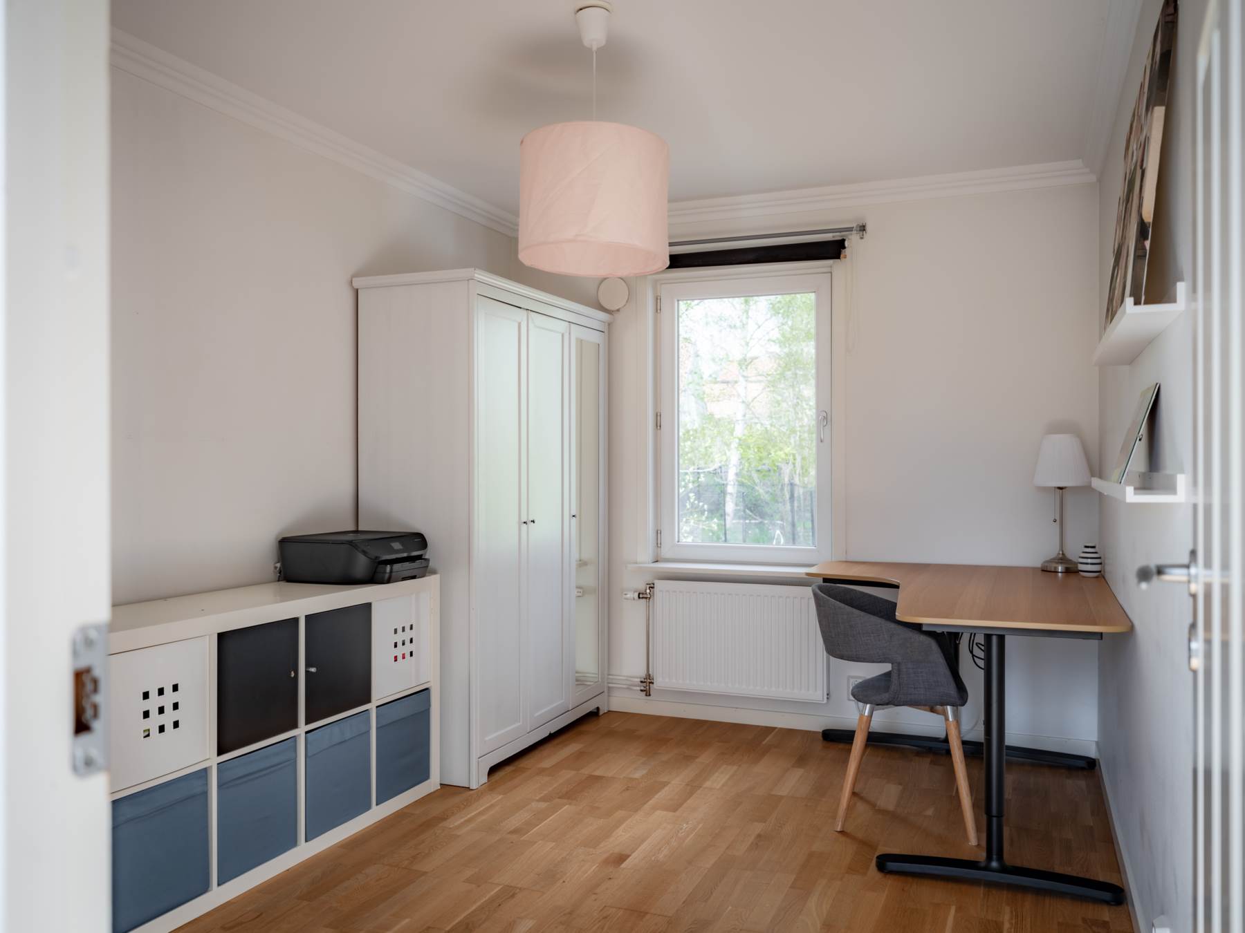 Plats för en stor säng, skrivbord och bra med förvaringsmöjligheter med inbyggd garderob. Fint ljusinsläpp från stora fönsterpartier, ekparkettgolv och vita väggar.