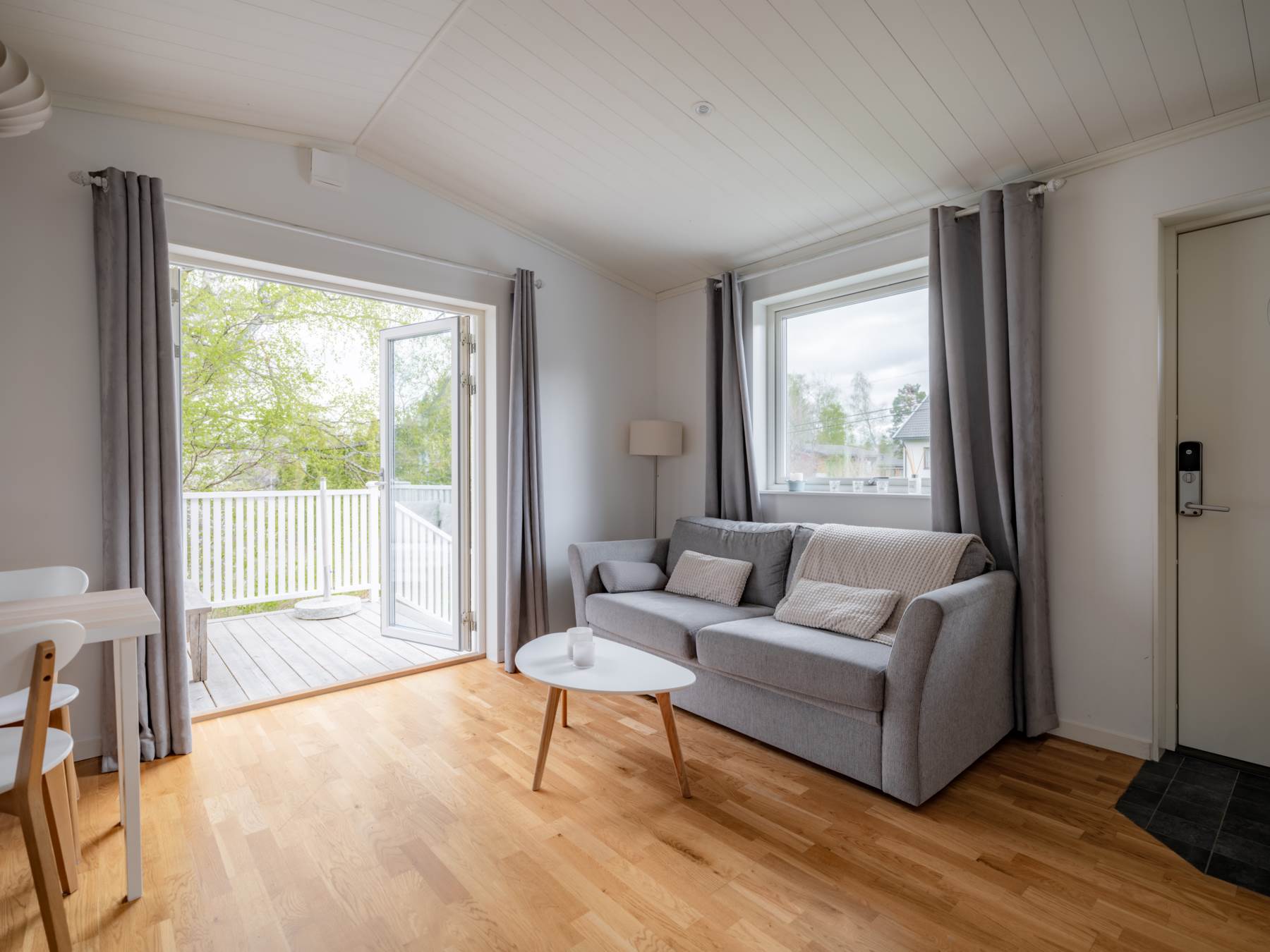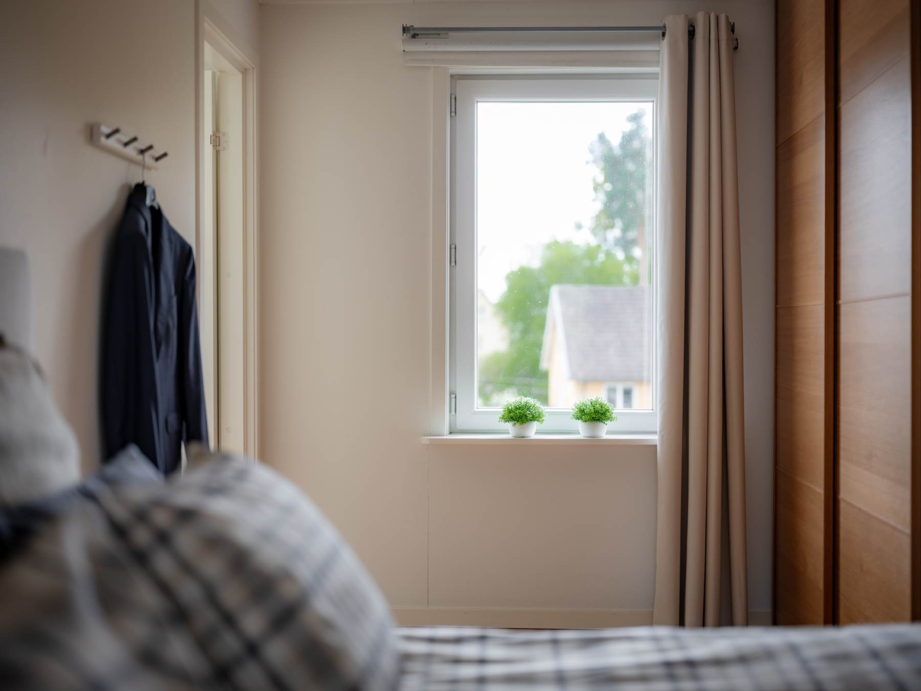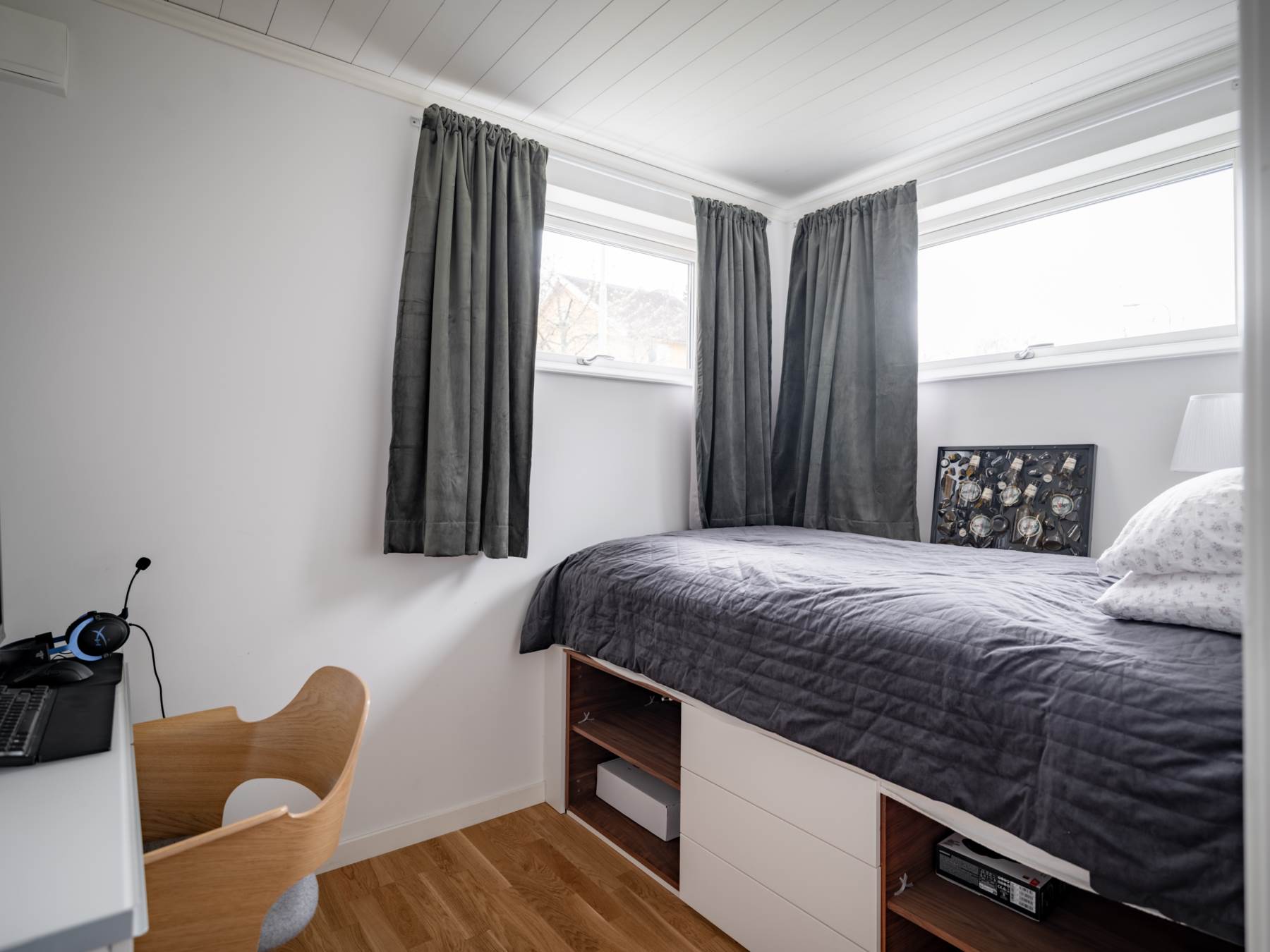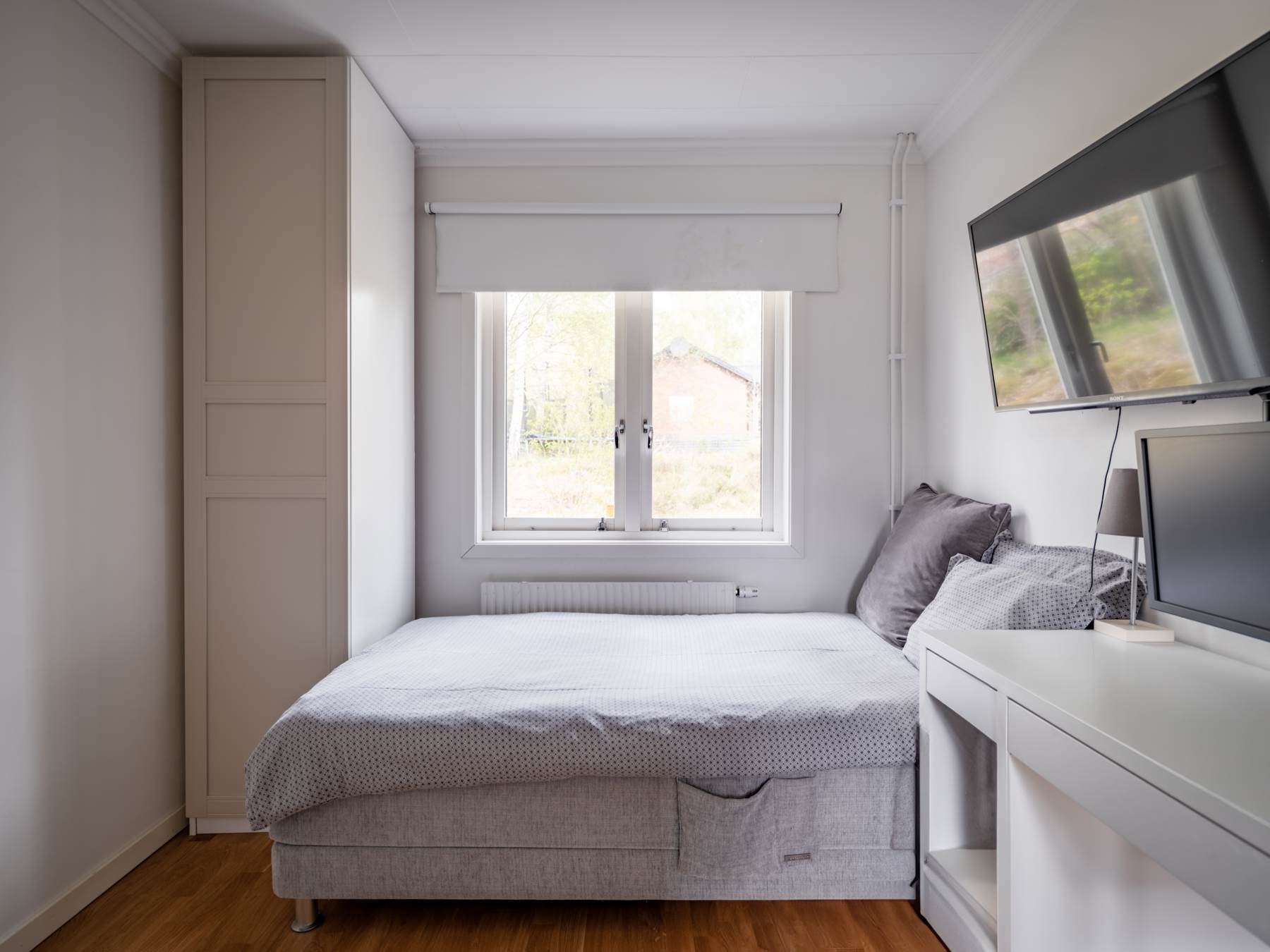 Plats för en stor säng, skrivbord och bra med förvaringsmöjligheter med inbyggd garderob. Fint ljusinsläpp från stora fönsterpartier, ekparkettgolv och vita väggar.