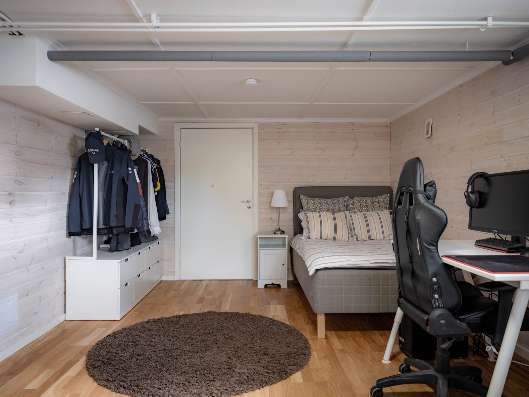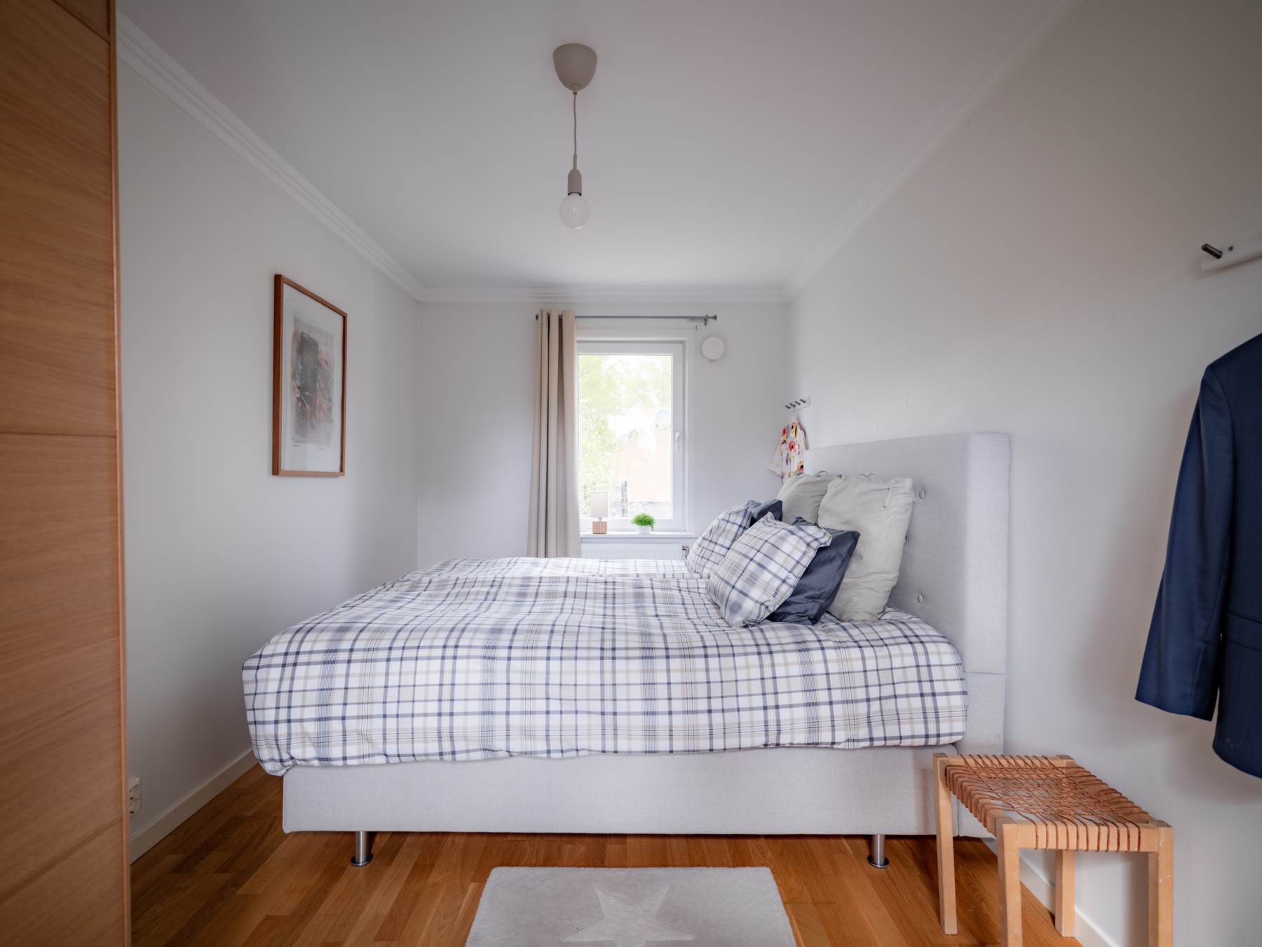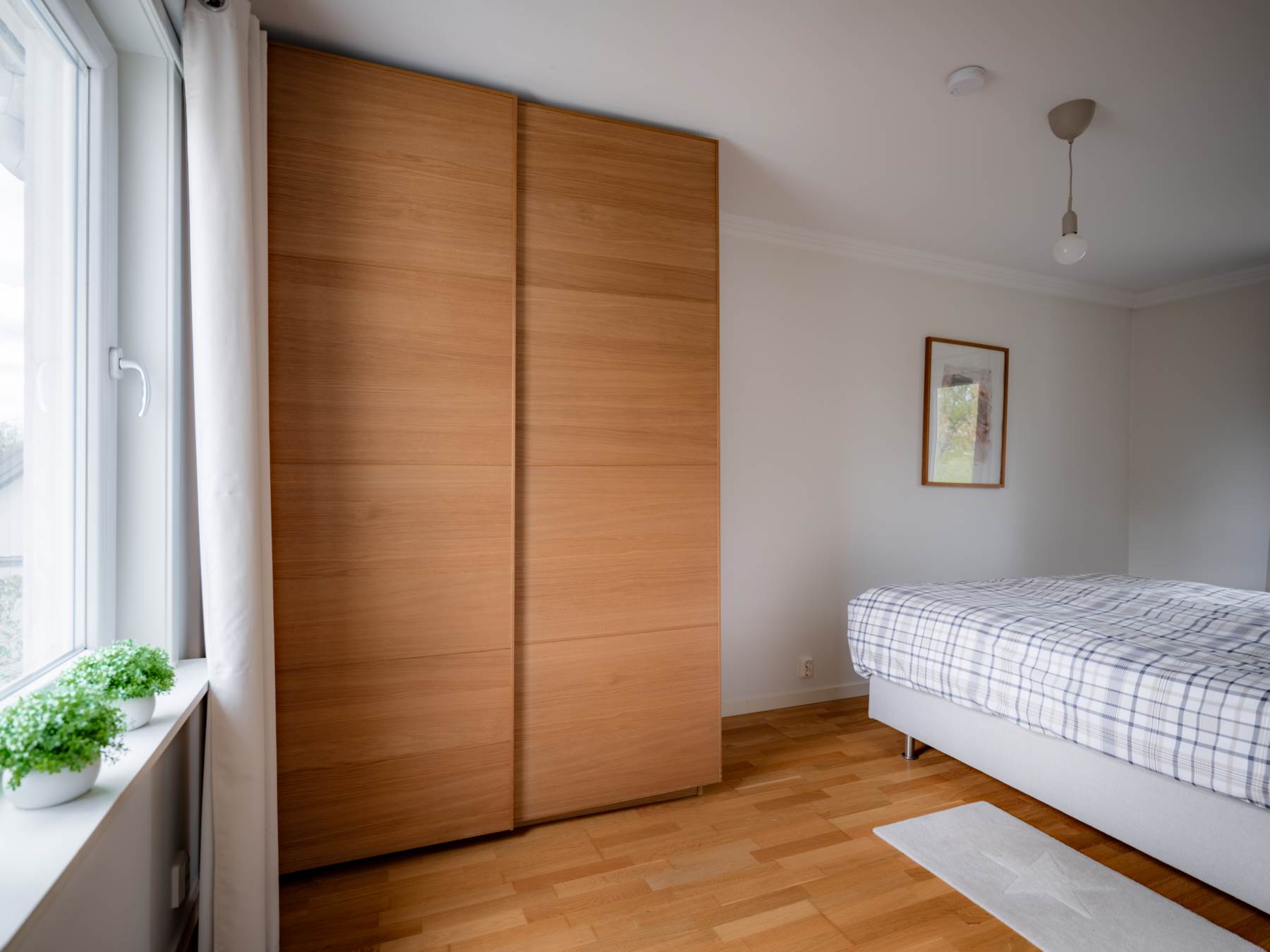 Praktiskt rymligt sovrum med plats för en stor säng och bra med förvaringsmöjligheter. Även plats för stort skrivbord. Egen ingång. Ekparkett golv, grått klinker och ljus kulör klär väggarna.