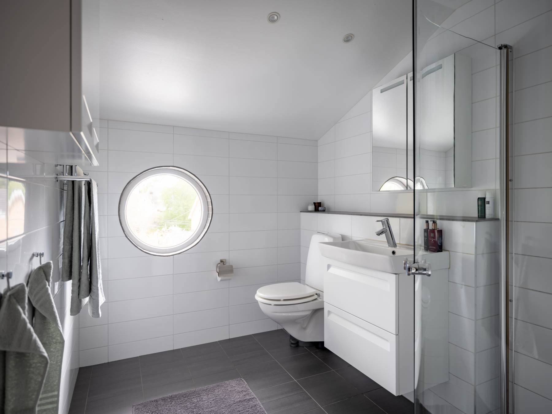Rymligt badrum med plats för wc, dusch och handfat med vit kommod som optimerar förvaringsmöjligheterna. Här finns det även plats för badrumsskåp med spegel, grått klinkergolv, vita väggar och golvvärme.