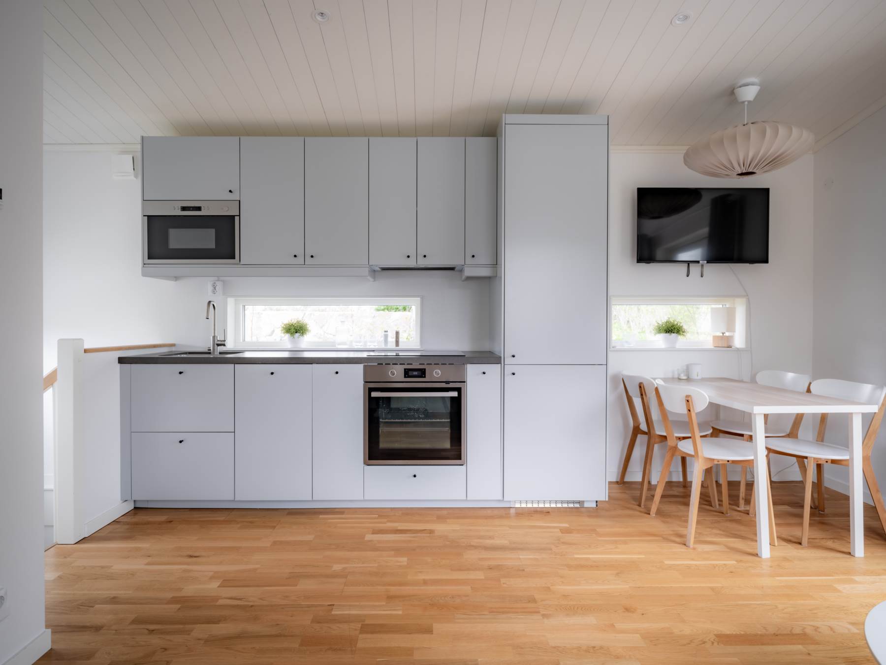 Rymligt kök med bänkskiva i mörk sten från Bror Turner. Vita skåpluckor och vitt kakel, vitvaror från bland annat Siemens och fullt utrustat kök. Här är det access till trevlig matsal med plats för ett flertal stora sällskap. Fint ljusinsläpp från stora fönsterpartier, mörkt ekparkett golv och vita väggar.