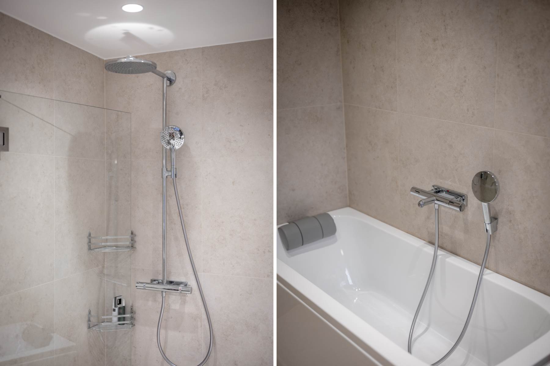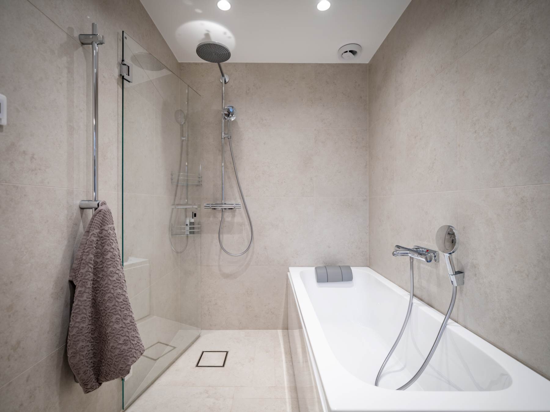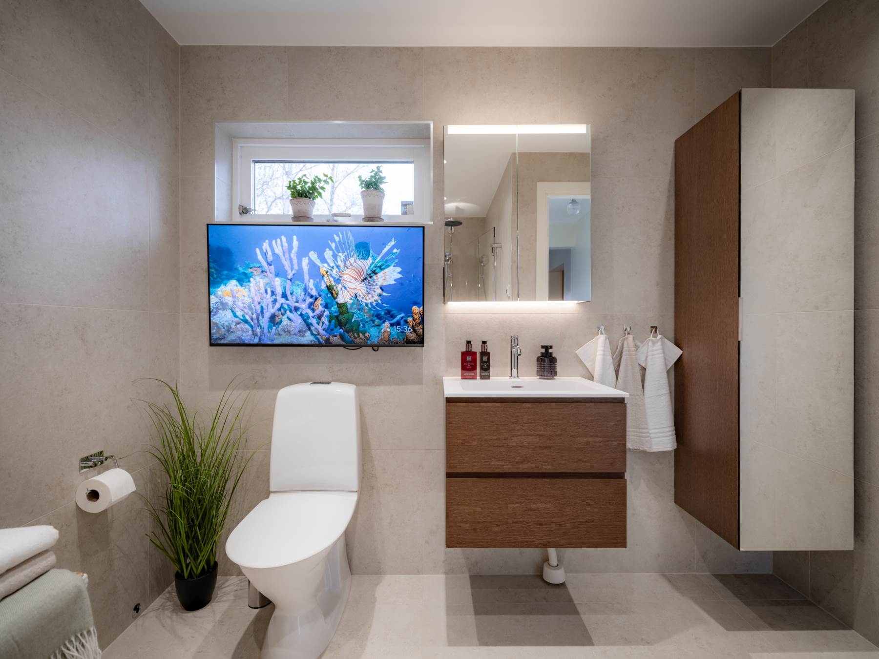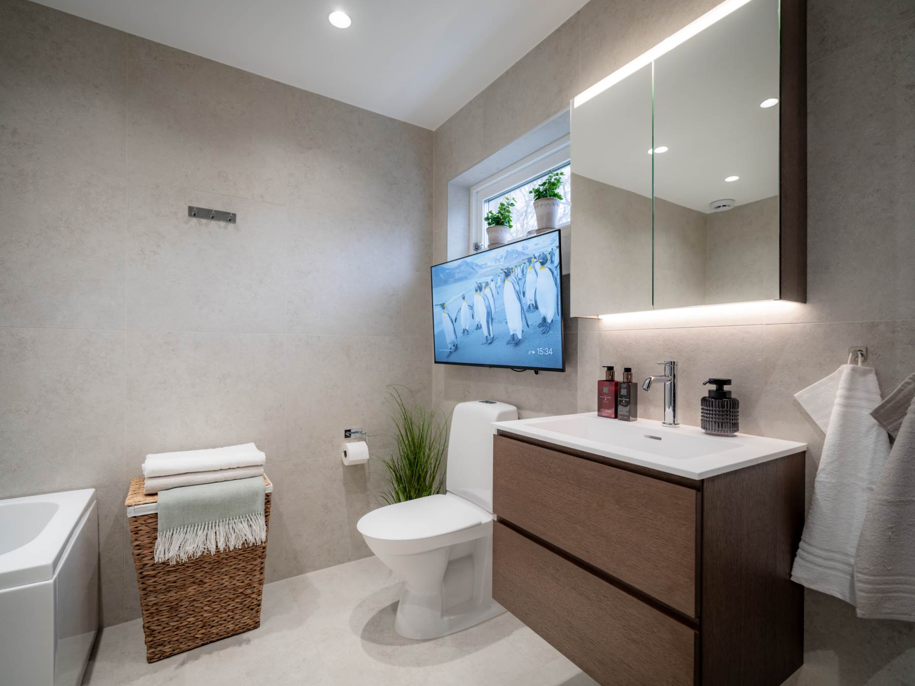 Rymligt nyrenoverat badrum med plats för wc, badkar, dusch, handfat och tv. Modernt ljust klinker och kakel. Inredning dark oak.