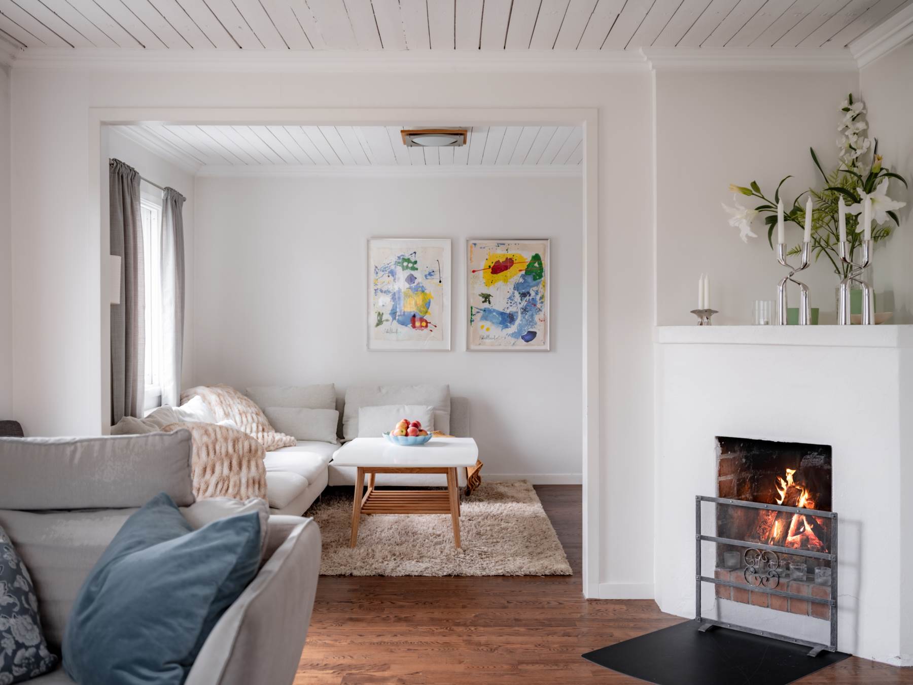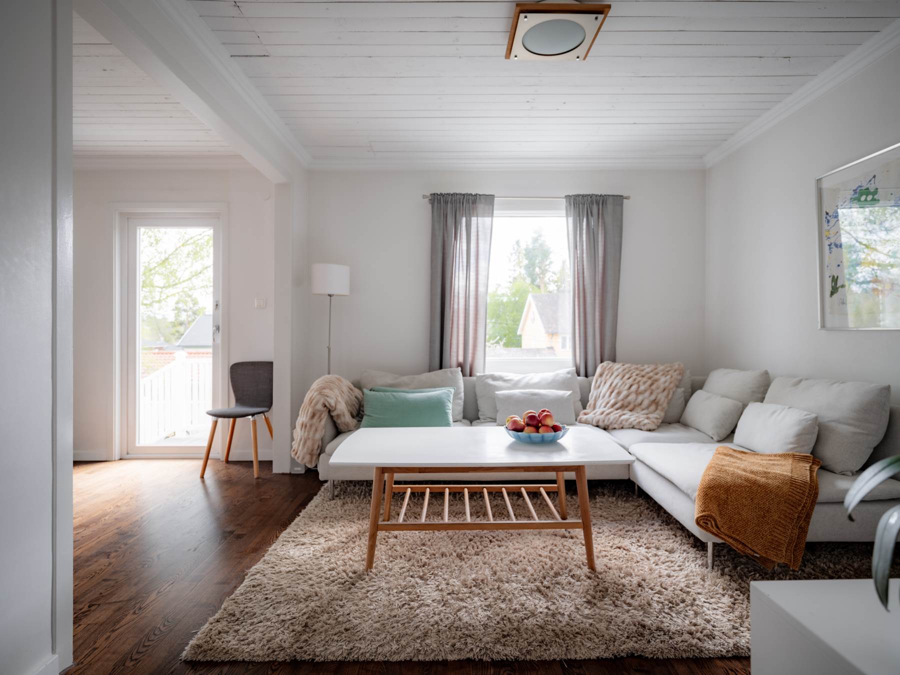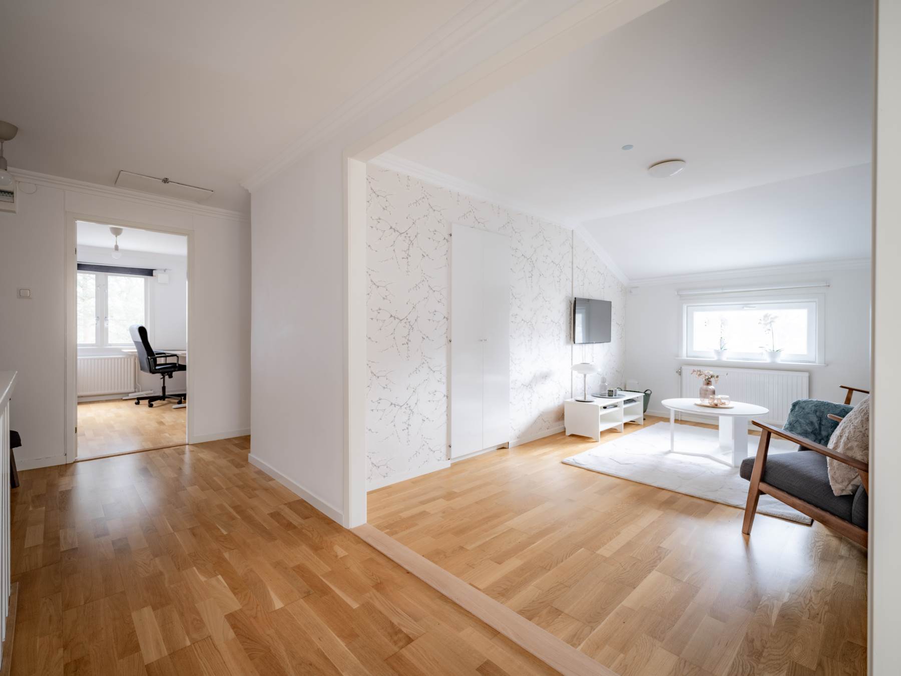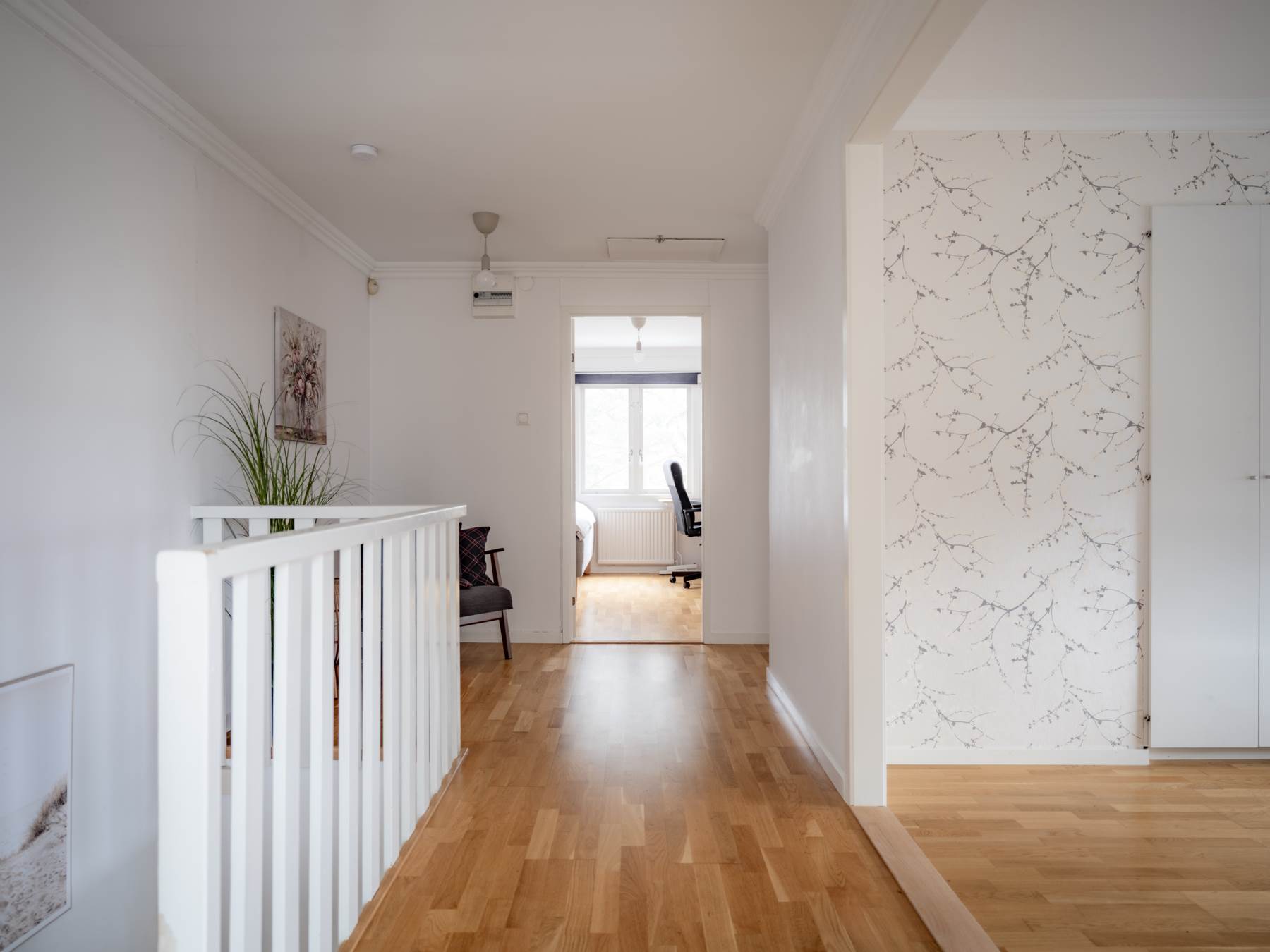 Vacker vitmålad trappa leder dig upp till plan 1 där du möts av ett härligt ljust allrum med fantastiskt ljusflöde.