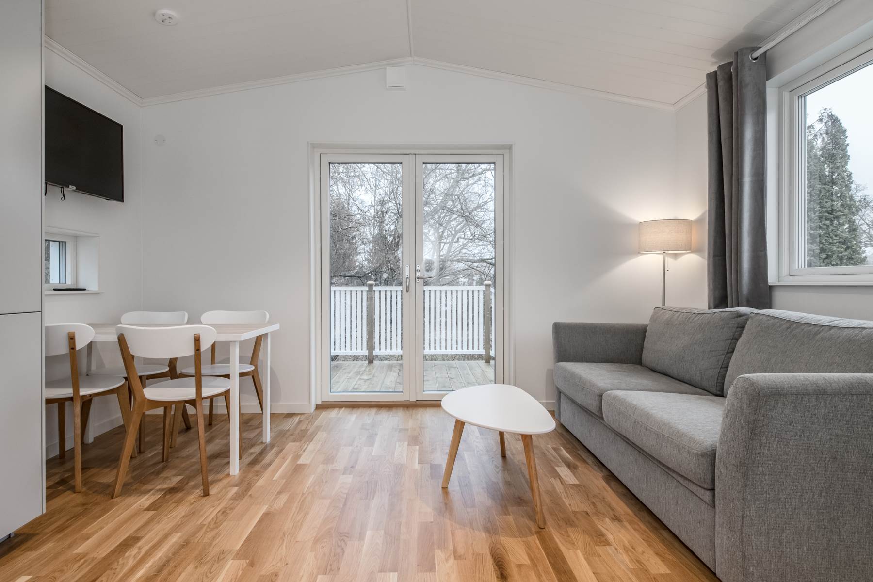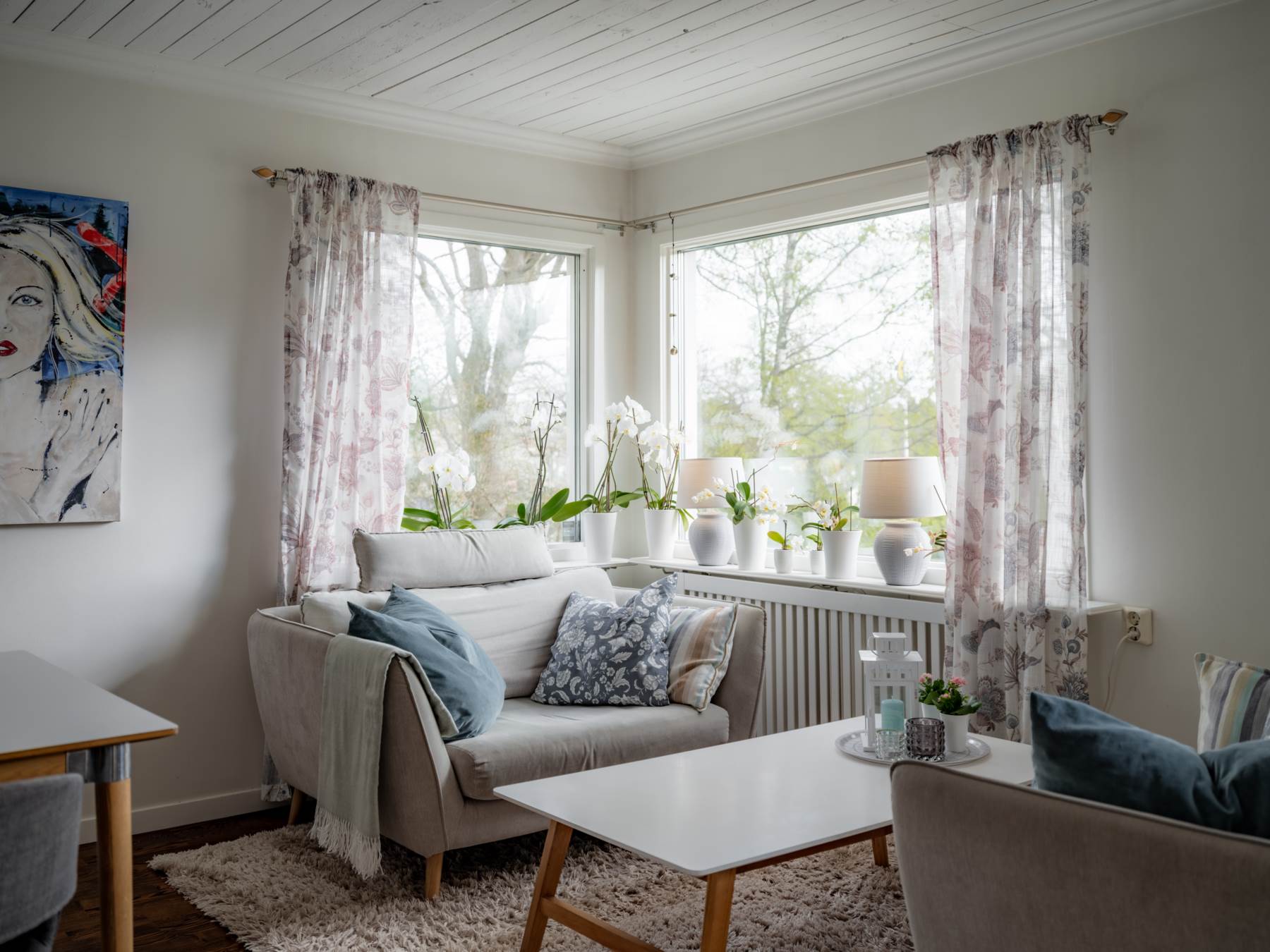 Trevligt vardagsrum i öppen planlösning med plats för stort möbelarrangemang. Fint ljusinsläpp från stora fönsterpartier, mörkt parkettgolv och vita väggar.