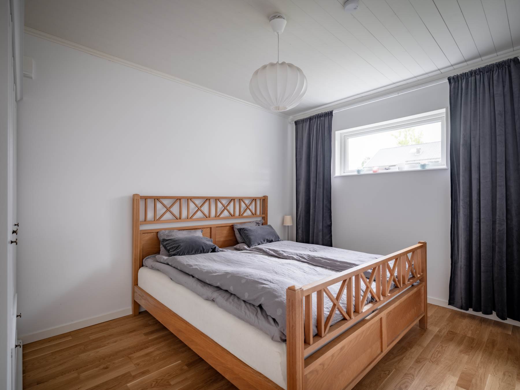 Plats för en stor säng, skrivbord och bra med förvaringsmöjligheter. Detta rum upplevs som rymligt och med fint ljusinsläpp från fönsterpartier, ekparkettgolv och vita väggar.