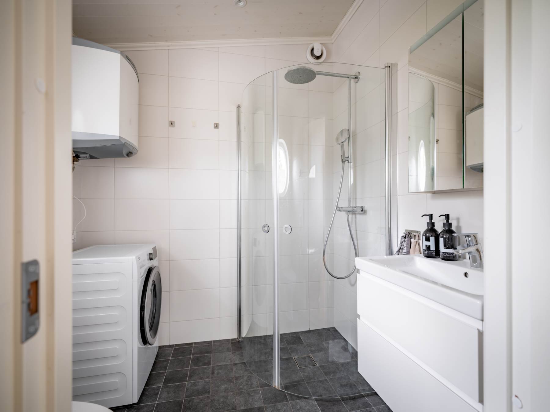Praktisk tvättstuga med bra förvaring och avhängningsmöjligheter. Torktumlare och tvättmaskin från Cylinda och Bosch, bänkskiva i vit laminat, terrakottafärgat klinker och vita väggar. Mycket goda förvaringsmöjligheter.