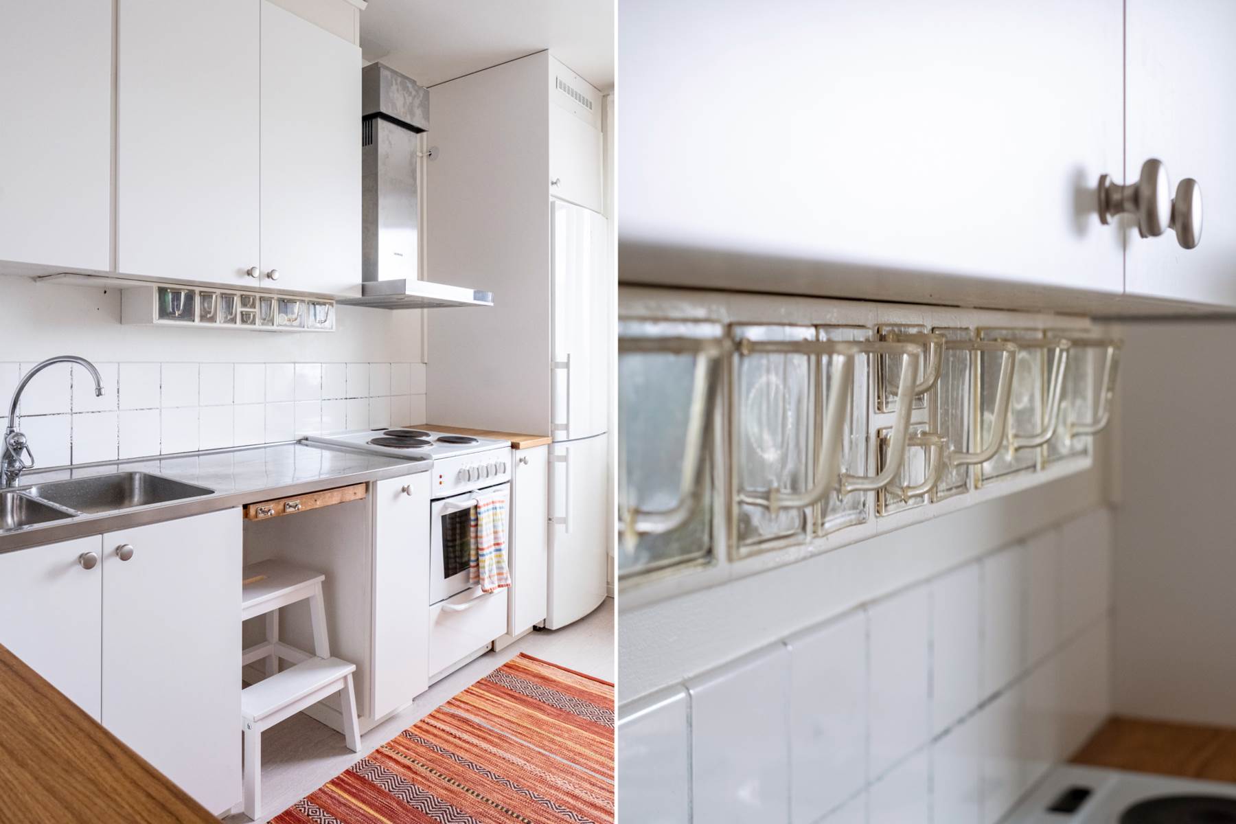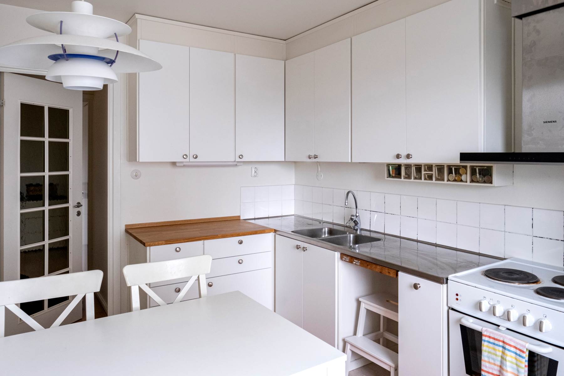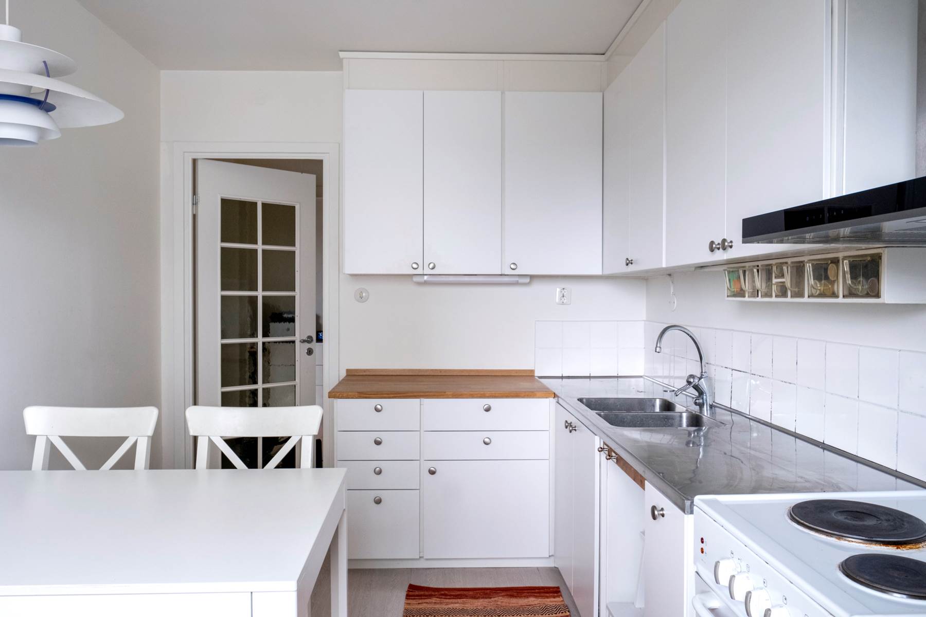 Hemtrevligt kök med gott om förvaringsplats i skåp och lådor. Bra matplats för flertalet personer och ett stort fönster ger ett fint ljusinsläpp. Den maskinella utrustningen består av: spis, fläkt samt kyl och frys.