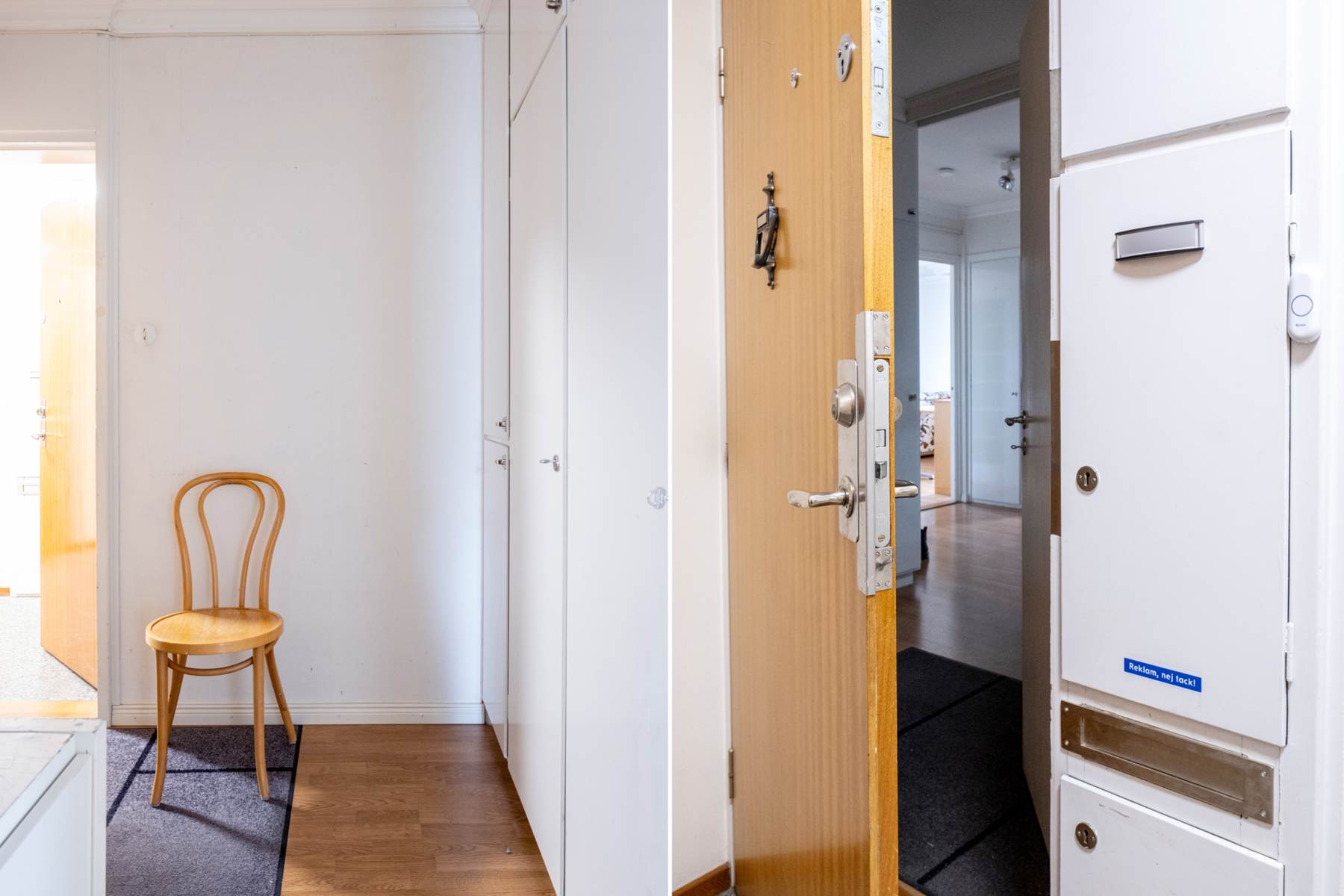 Välkomnande entréhall med gott om plats för avhängning av ytterkläder och skor. Laminatgolv samt väggar i ljus ton. I direkt anslutning till hallen finns en rymlig klädkammare som erbjuder extra förvaringsplats. I den inre möblerbara hallen finns gott om plats för t ex en arbetsplats.