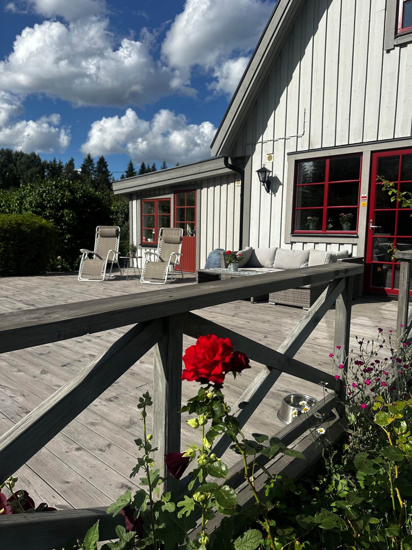 Huset erbjuder en fin yttre och inre hall som nås via vackra röda dubbeldörrar. Hallen erbjuder förvaring av dina ytterkläder och skor. Innanför hallen finner du ett nyrenoverat lantligt kök med grå skåpinredning och en trevlig köksö med infälld vinkyl. En vedspis finns intill som bidrar till charm! Intill köket har du en trevlig matplats med en kakelugn i ena hörnet. Matbordet har du framför fönster och altandörr. Om sommaren dukar du såklart upp måltiderna utomhus på den tilltagna altanen. Vidare in i huset finns ett rymligt vardagsrum med ytterligare en vacker kakelugn, och plats för familjens soffhörna och tv-plats. Från vardagsrummet når du ett underbart uterum med vackra fönster som byggdes in år 2010 och har en luftvärmepump installerad. Ett rum som är idealiskt för alla säsonger! På entréplanet har du även en tvättstuga och toalett. Via trappa upp till övervåningen når du en övre möblerbar hall med utgång till balkong. Härifrån kan du se ner till sjön. Det övre planet har fyra tilltagna sovrum och ett badrum med bastu. Huset har utbytta fönster - till isolerglasfönster med fin röd spröjs. Taket är nylagt 2024. Detta tillsammans med bergvärmen och eldstäderna får du en energieffektiv och trivsam miljö året runt.