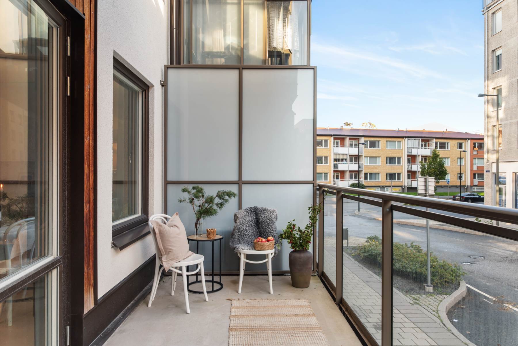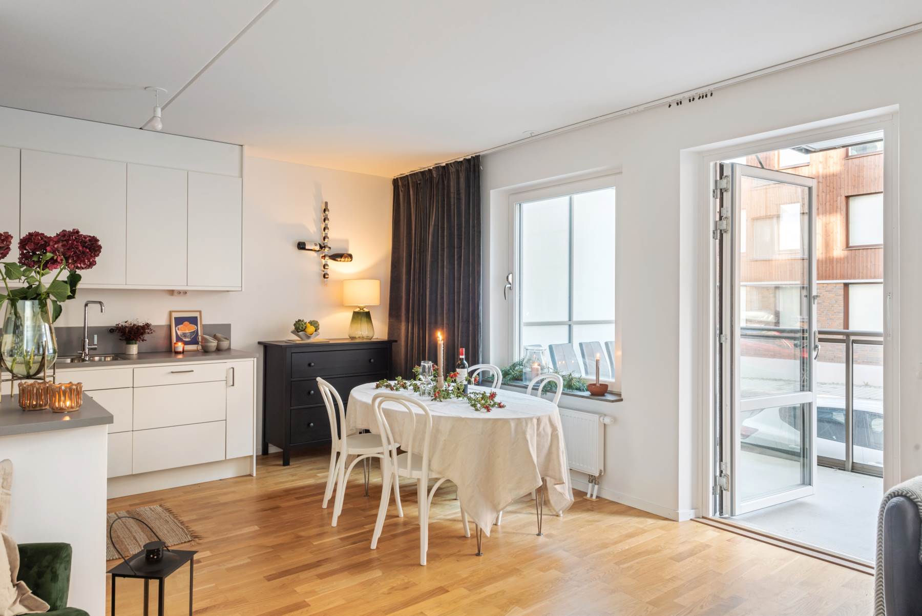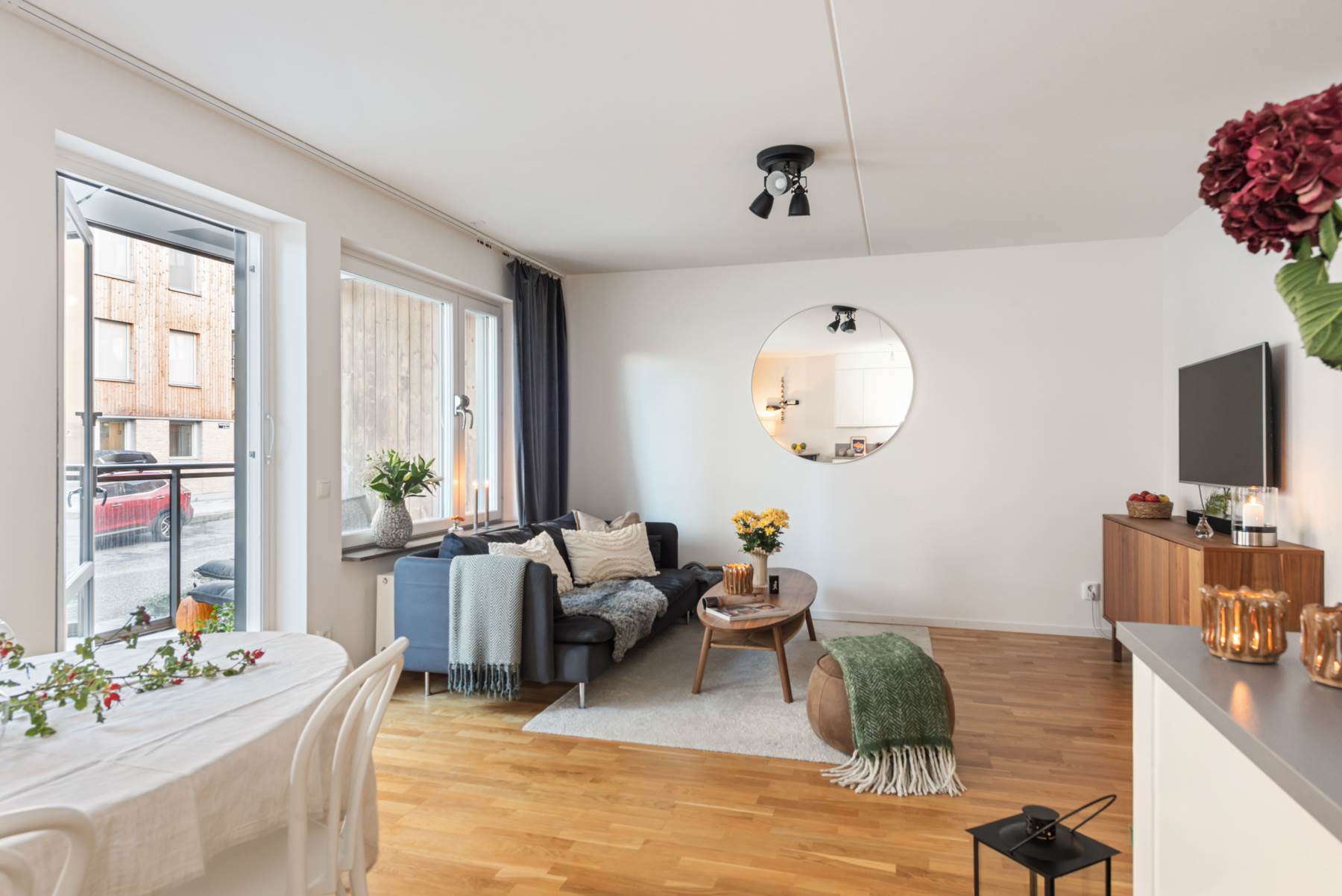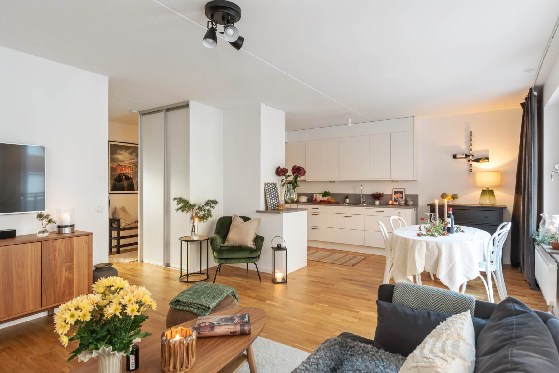 Bostaden erbjuder en mycket välplanerad planlösning där varje kvadratmeter används optimalt. Kök och vardagsrum ligger i en halvt öppen planlösning, perfekt avvägt för att köket ska få vara just ett kök, medan soffgrupp och matplats hittar sin naturliga plats i det ljusa vardagsrummet. Härifrån når du även balkongen, där flera boende i föreningen valt att glasa in för att kunna njuta av den större delen av året.
