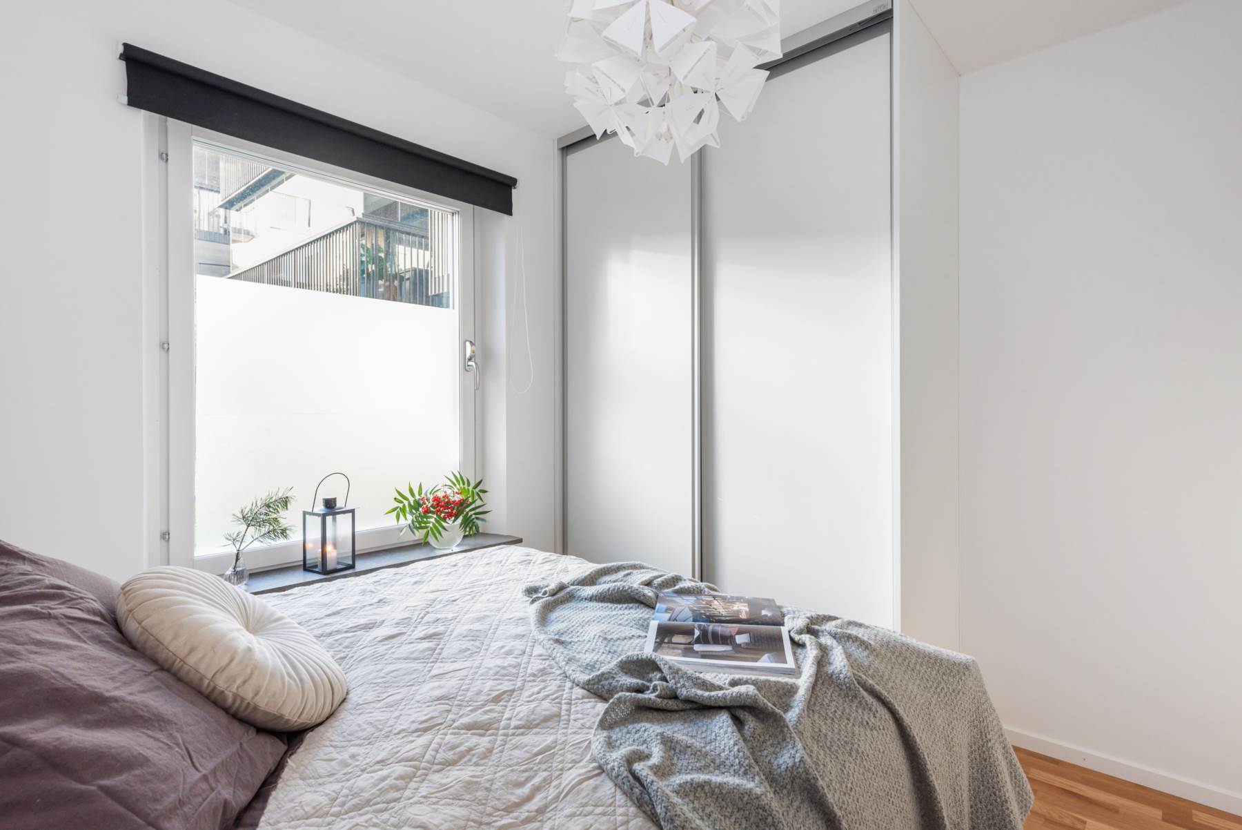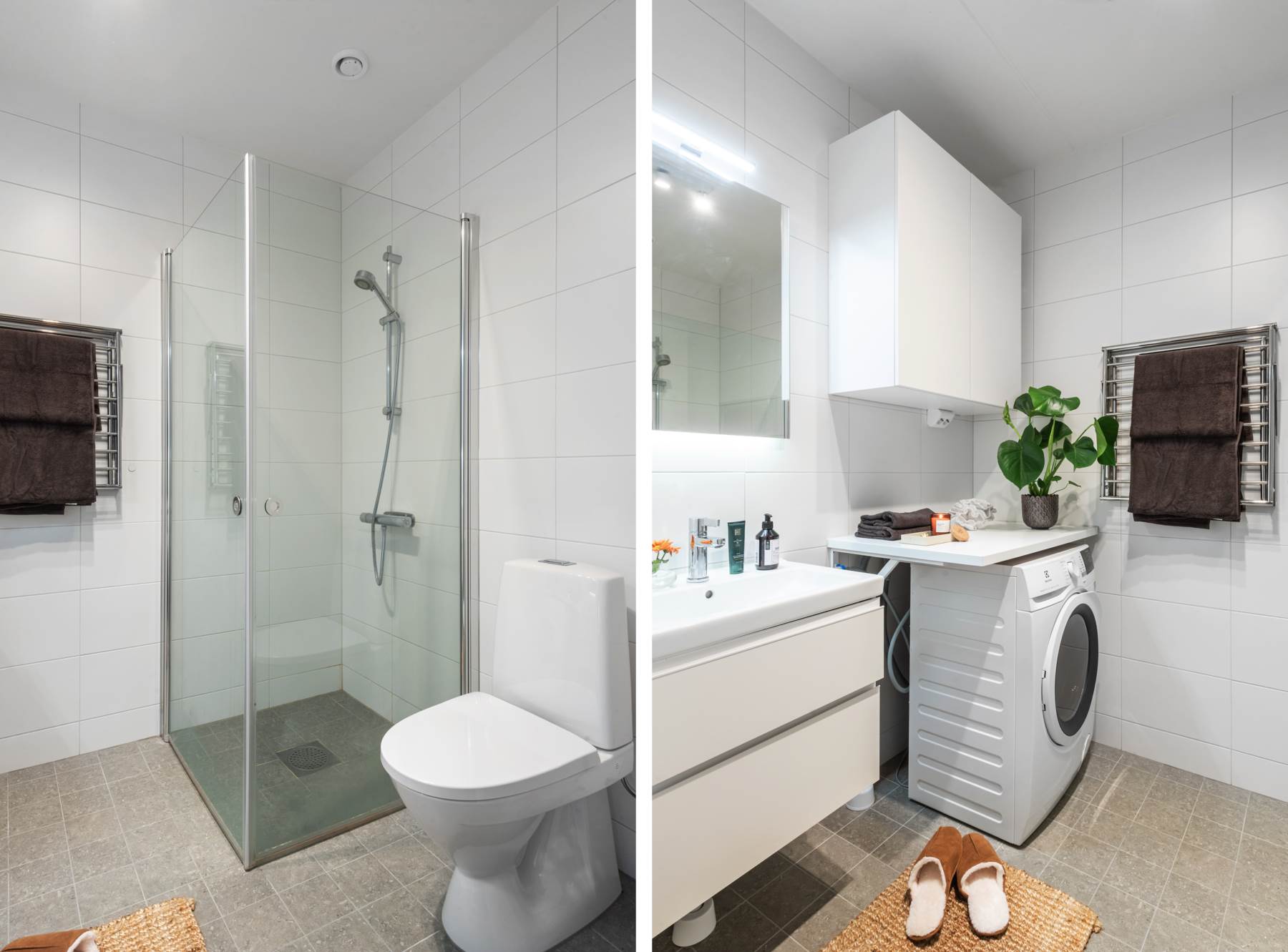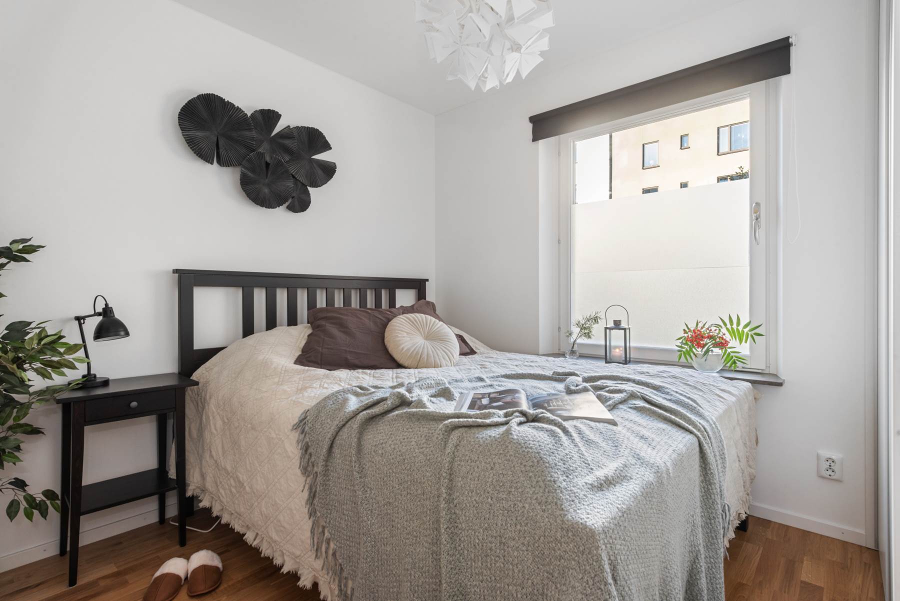Duschrummet är helkaklat i stilrent utförande och följer de senaste trenderna, ljust, fräscht och luftigt. Sovrummet är rymligt med gott om förvaring, och hela bostaden genomsyras av ett harmoniskt ljusflöde tack vare fönsterpartierna.