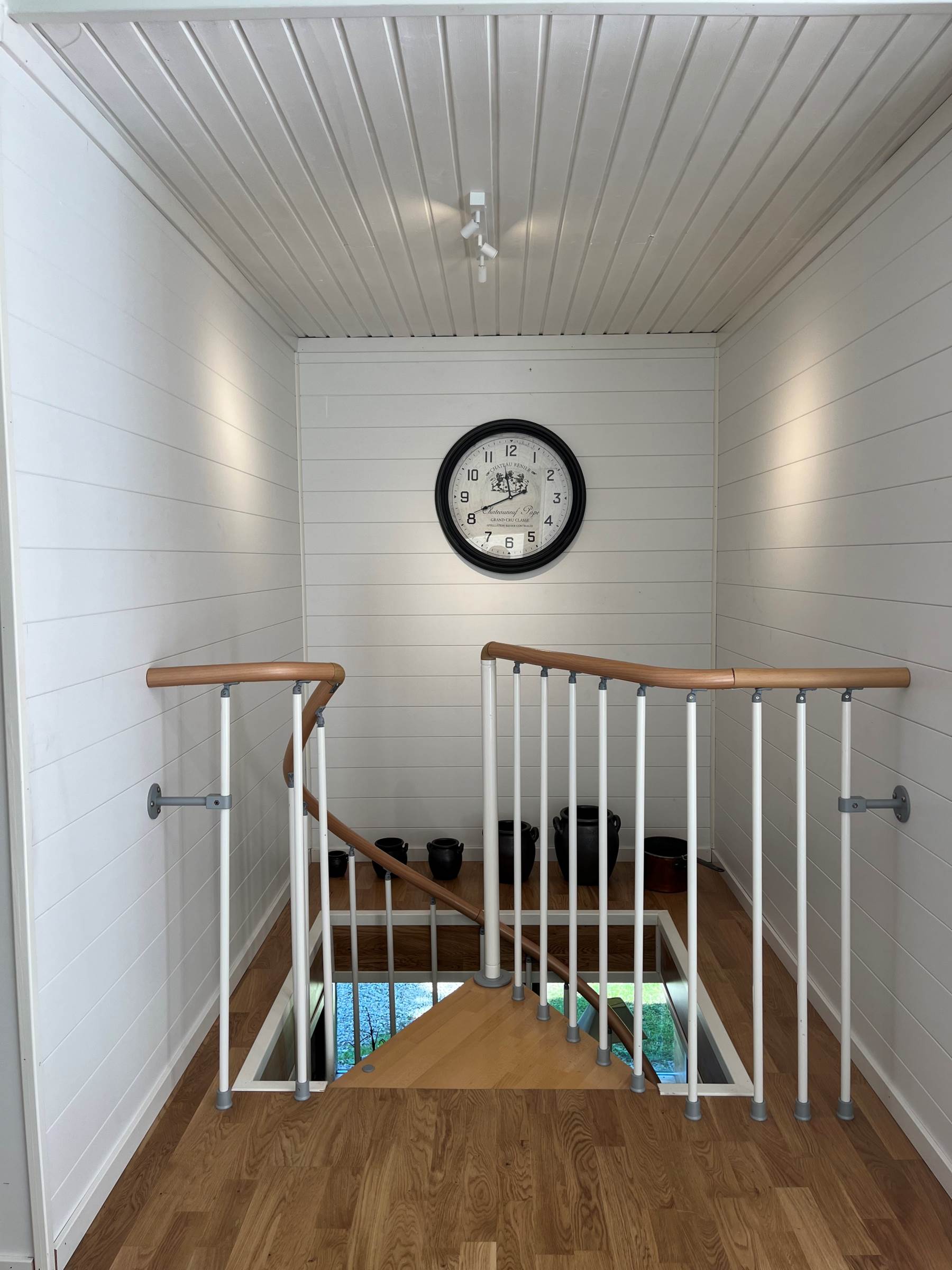 På övre plan finner du ett rogivande sovrum i norrläge samt ett fräscht, badrummet har renoverats och gjorts större med dusch och toalett. Den nybyggda trappan – ett smycke i sig – förbinder våningsplanen och skapar ett öppet, harmoniskt flöde genom huset. På nedervåningen möts du av en mysig loungedel och två ytterligare rum, perfekt för kontor eller extra sängplatser som de idag har som funktion. – med egen entré ut mot baksidan, vilket ger både praktiska möjligheter och en känsla av avskildhet.