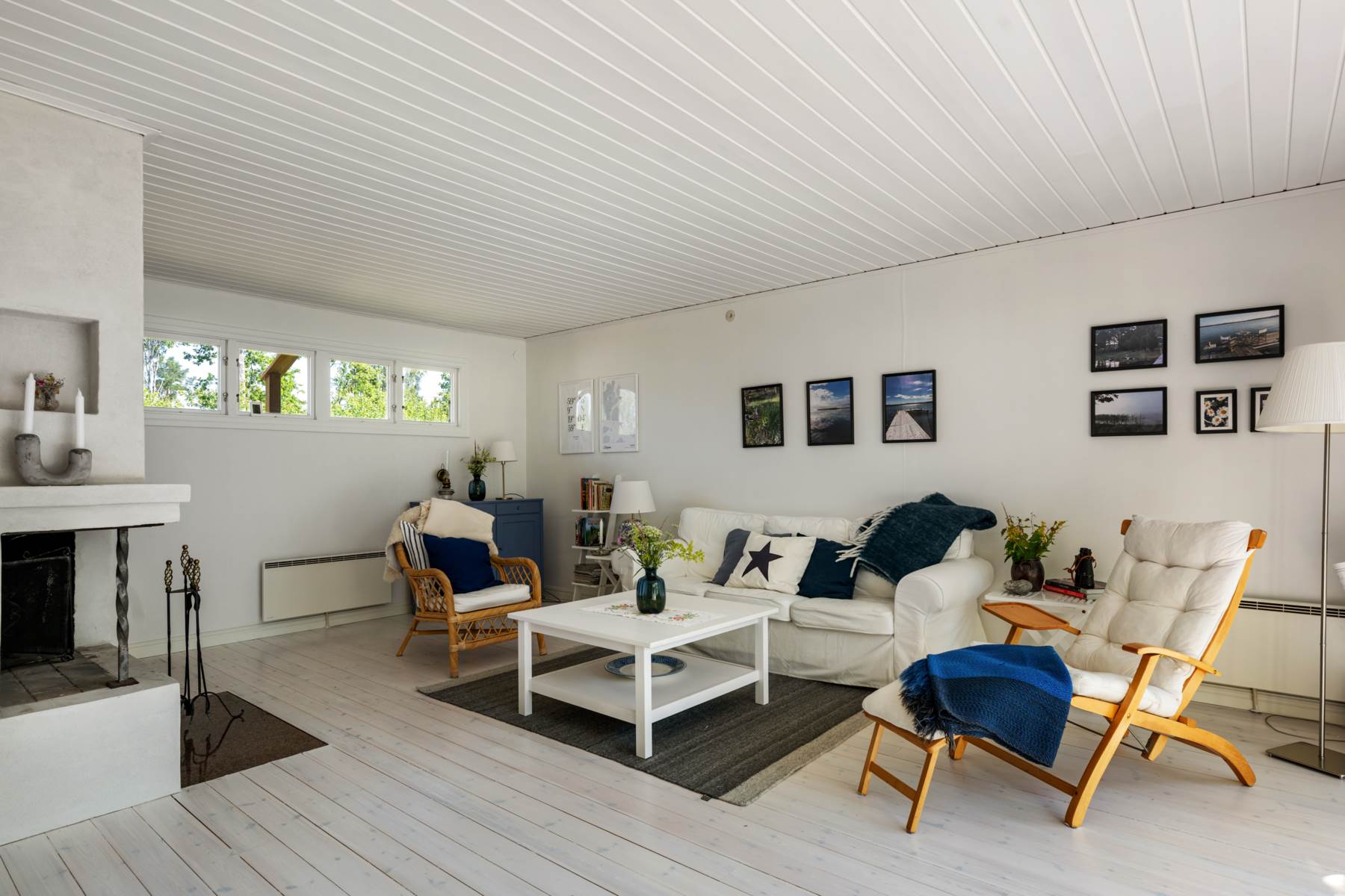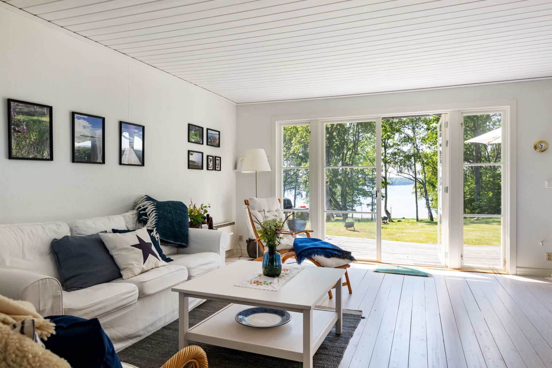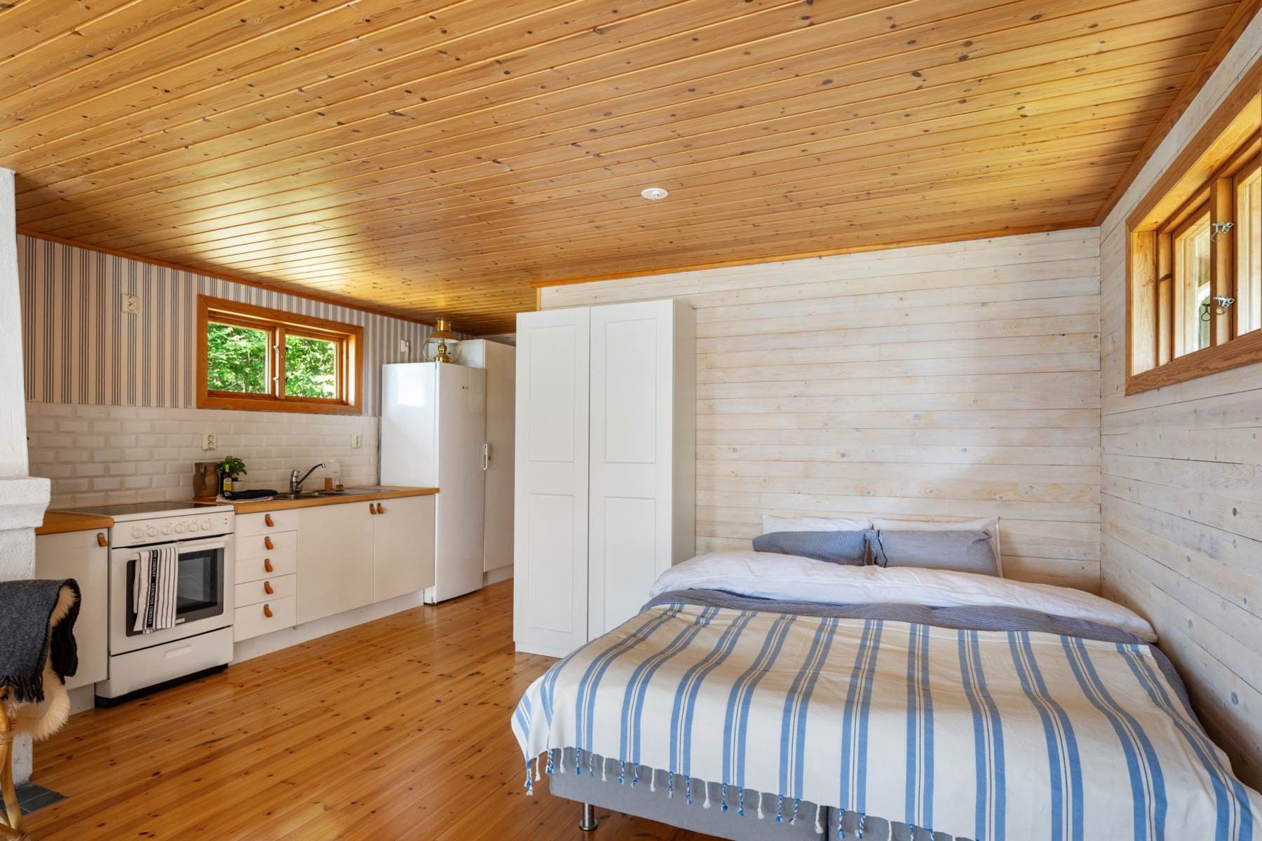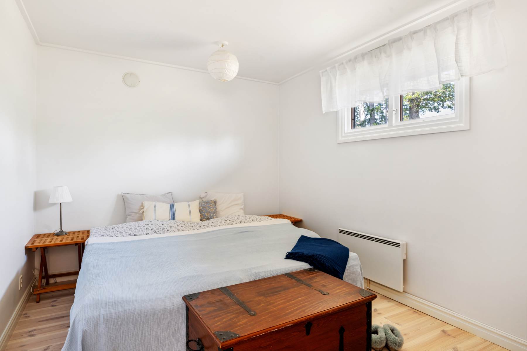 Huvudhuset vilar högst upp och har en öppen planlösning med smakfull ljus färgsättning. Här finner ni en öppen spis och stort fönsterparti med bubbeldörr till altanen med fint söderläge och vy ner mot stranden. Två sovrum samt ett toarum. Huset har hel källare med god takhöjd. Källaren kan man utveckla efter eget tycke, här finns även husets duschrum. Nere vid stranden vilar det trivsamma gästhuset om ca 40 kvm, även detta hus har en öppen planlösning och stora fönsterpartier med havet som kuliss. Huset har duschrum med separett, köksdel samt öppen spis. Entré sker via en rymlig takförsedd veranda, fantastisk belägen inte långt från bryggan och strandkanten. På tomten finns också en friggebod med två bäddar.
