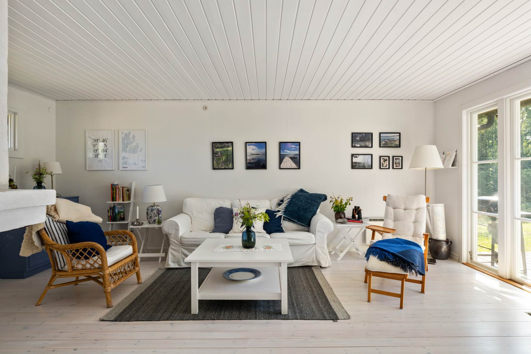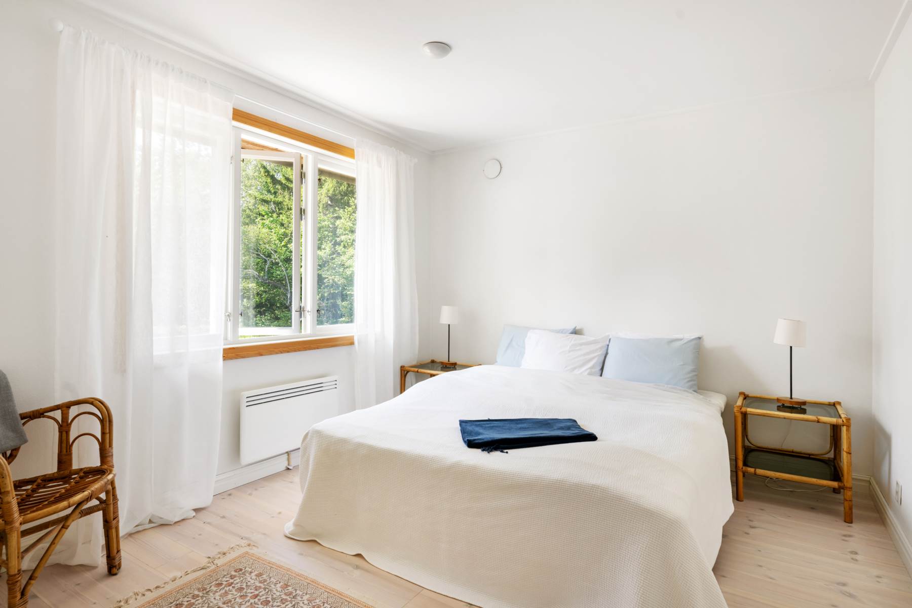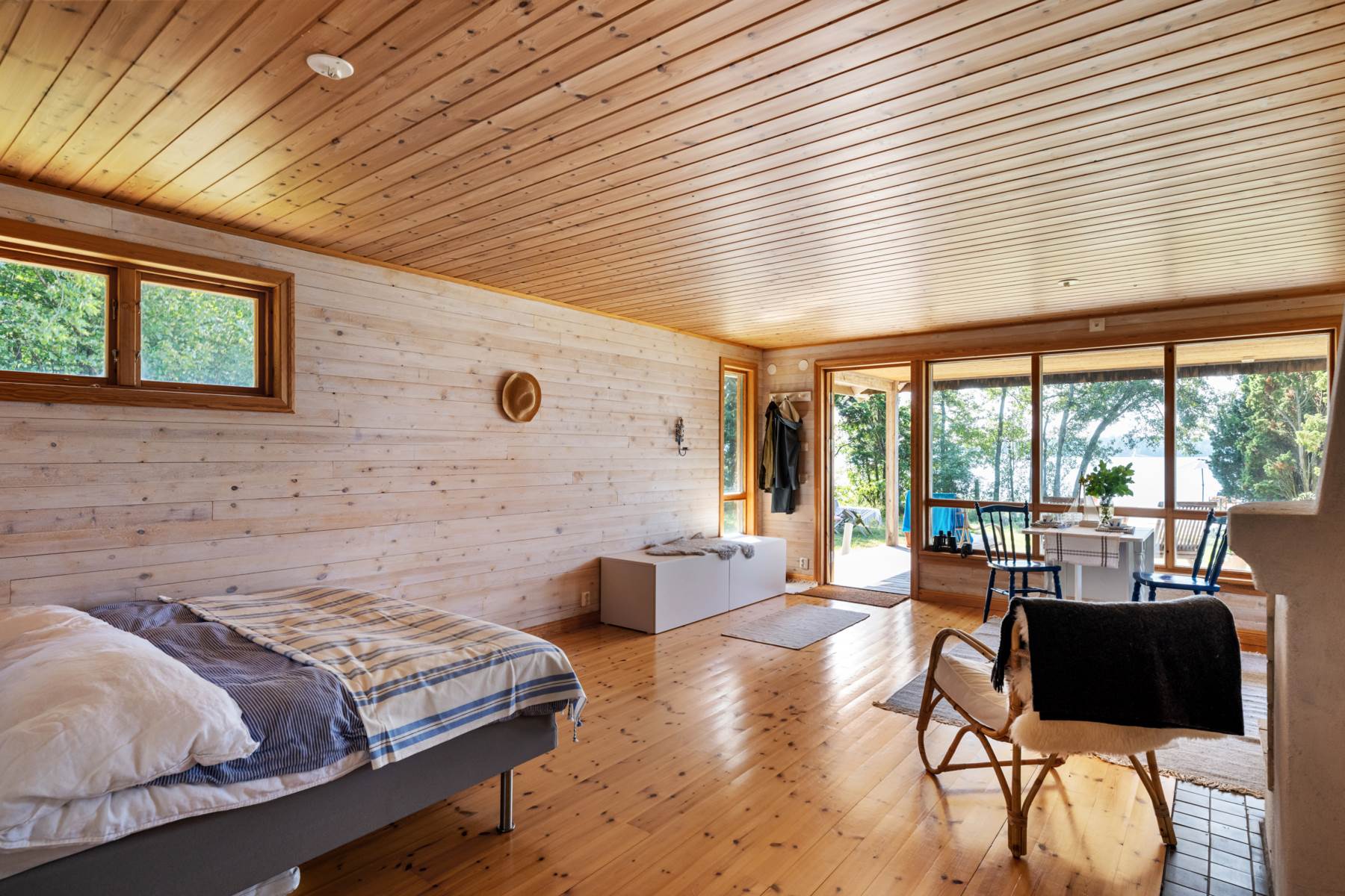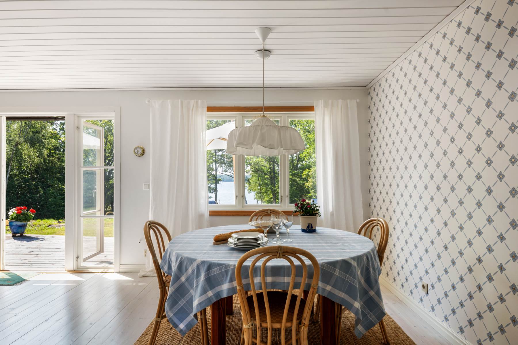 Huvudhuset vilar högst upp och har en öppen planlösning med smakfull ljus färgsättning. Här finner ni en öppen spis och stort fönsterparti med bubbeldörr till altanen med fint söderläge och vy ner mot stranden. Två sovrum samt ett toarum. Huset har hel källare med god takhöjd. Källaren kan man utveckla efter eget tycke, här finns även husets duschrum. Nere vid stranden vilar det trivsamma gästhuset om ca 40 kvm, även detta hus har en öppen planlösning och stora fönsterpartier med havet som kuliss. Huset har duschrum med separett, köksdel samt öppen spis. Entré sker via en rymlig takförsedd veranda, fantastisk belägen inte långt från bryggan och strandkanten. På tomten finns också en friggebod med två bäddar.