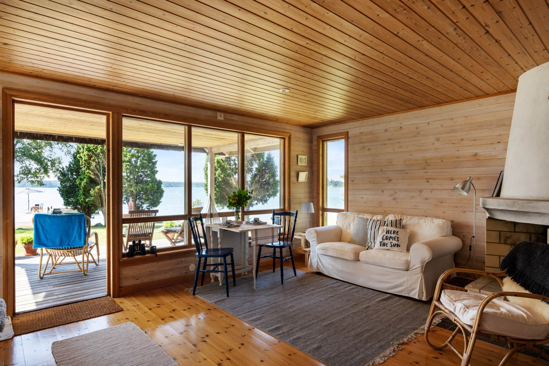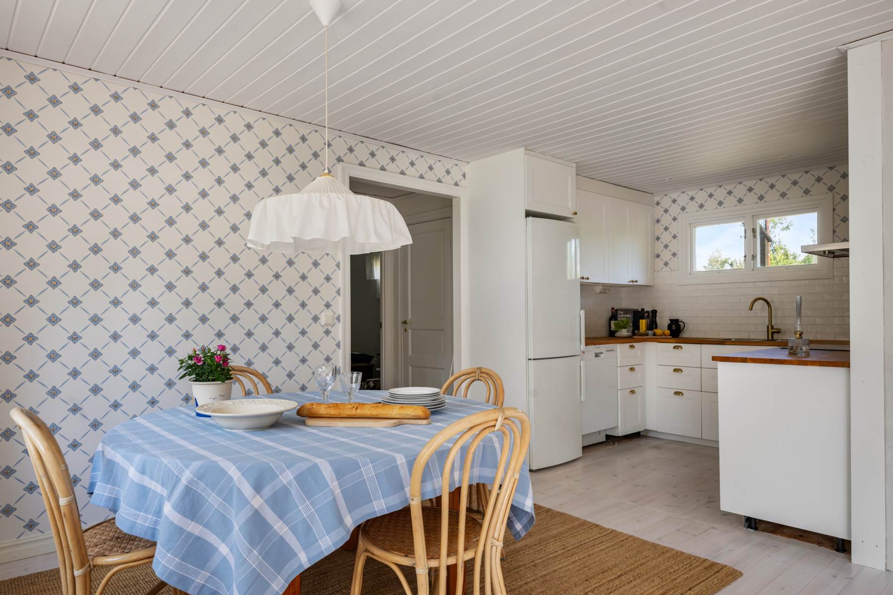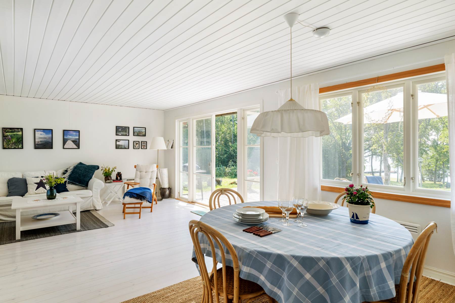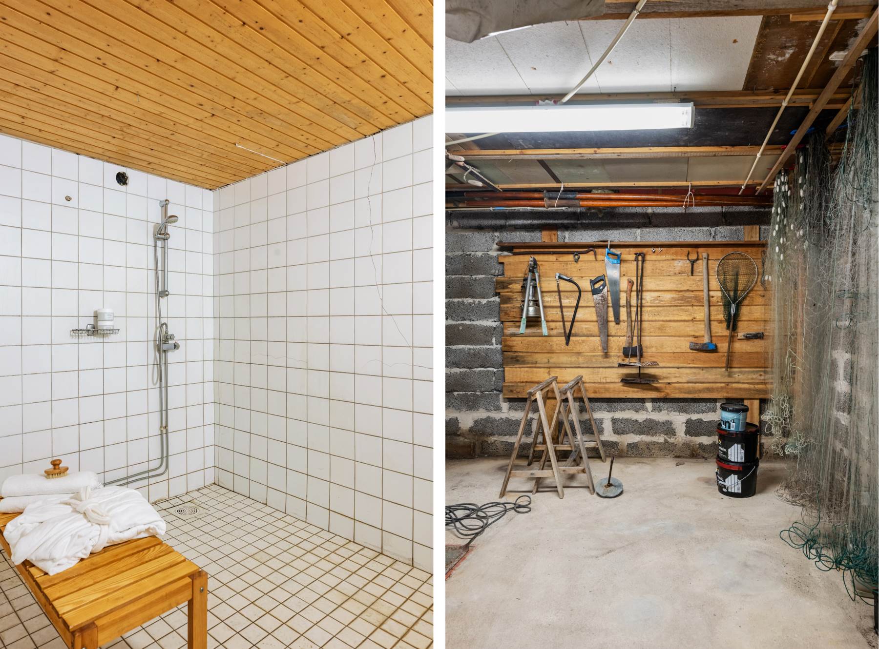 Huvudhuset vilar högst upp och har en öppen planlösning med smakfull ljus färgsättning. Här finner ni en öppen spis och stort fönsterparti med bubbeldörr till altanen med fint söderläge och vy ner mot stranden. Två sovrum samt ett toarum. Huset har hel källare med god takhöjd. Källaren kan man utveckla efter eget tycke, här finns även husets duschrum. Nere vid stranden vilar det trivsamma gästhuset om ca 40 kvm, även detta hus har en öppen planlösning och stora fönsterpartier med havet som kuliss. Huset har duschrum med separett, köksdel samt öppen spis. Entré sker via en rymlig takförsedd veranda, fantastisk belägen inte långt från bryggan och strandkanten. På tomten finns också en friggebod med två bäddar.