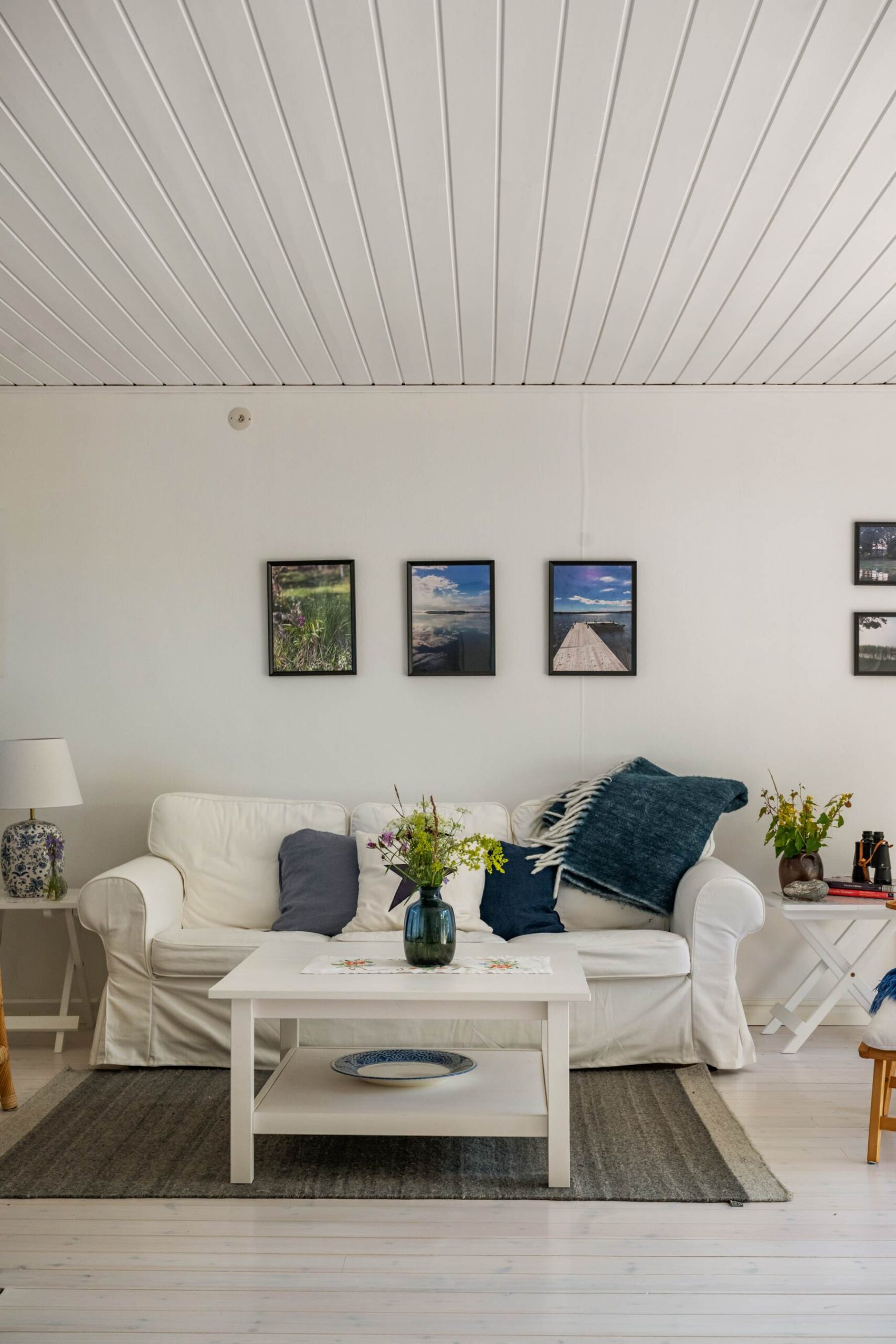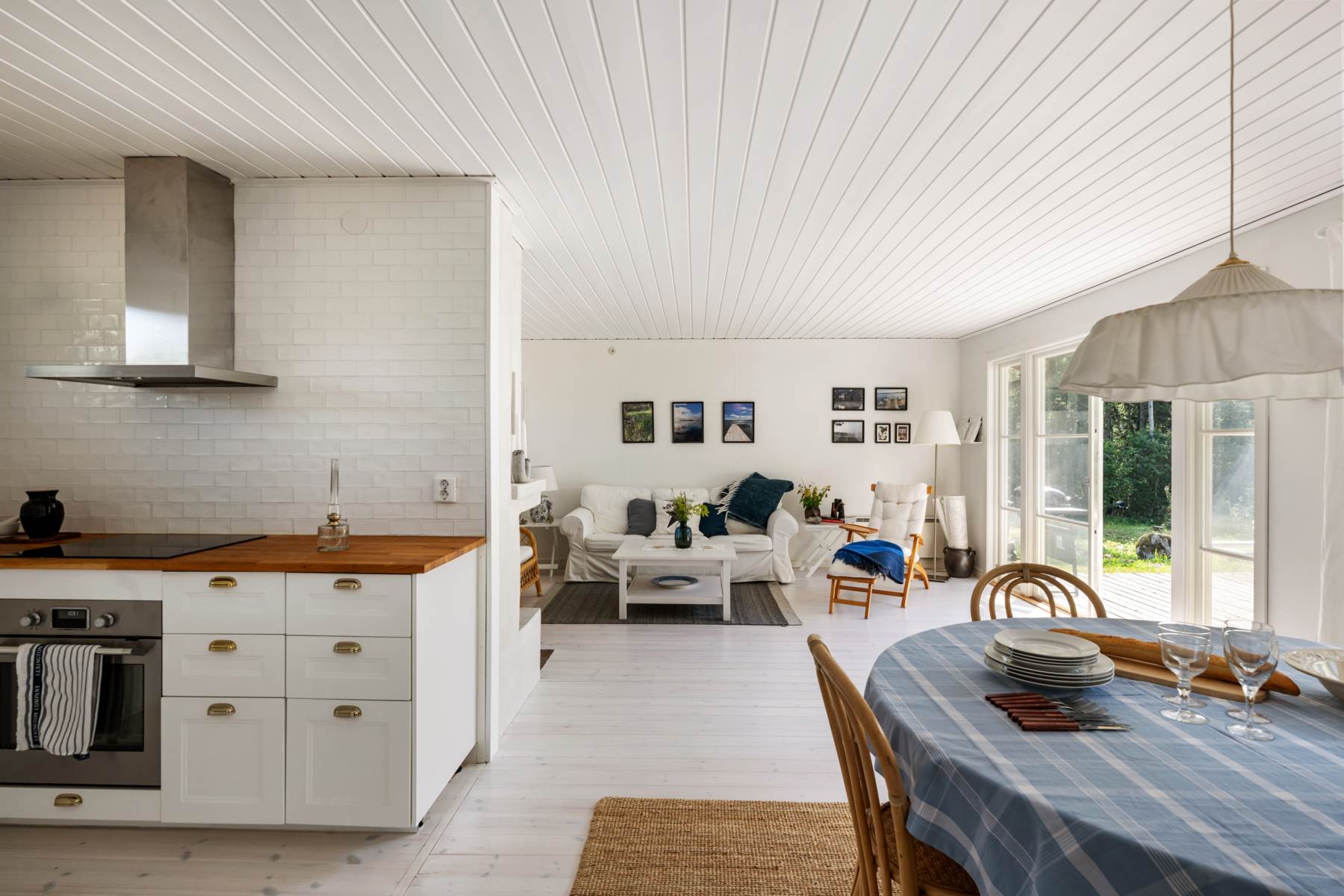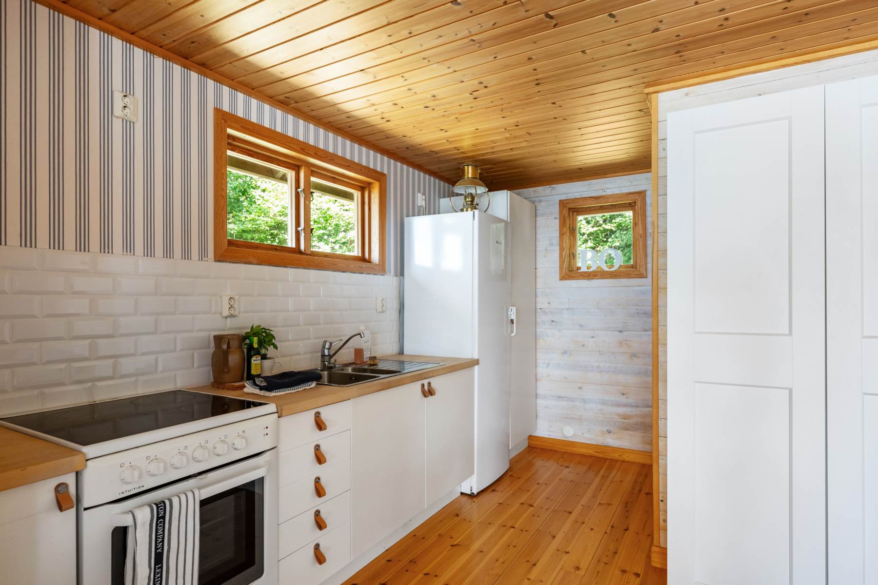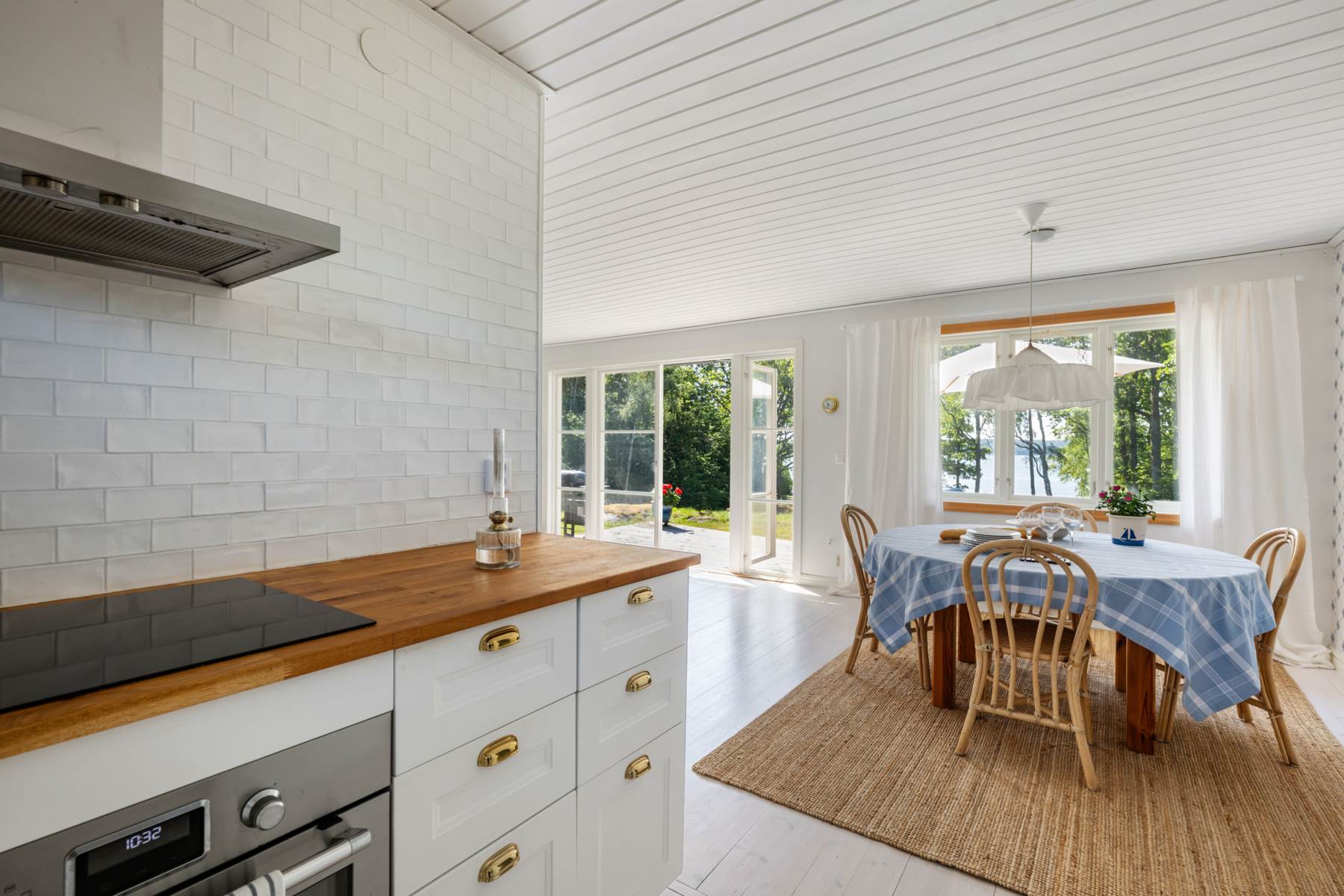 Huvudhuset vilar högst upp och har en öppen planlösning med smakfull ljus färgsättning. Här finner ni en öppen spis och stort fönsterparti med bubbeldörr till altanen med fint söderläge och vy ner mot stranden. Två sovrum samt ett toarum. Huset har hel källare med god takhöjd. Källaren kan man utveckla efter eget tycke, här finns även husets duschrum. Nere vid stranden vilar det trivsamma gästhuset om ca 40 kvm, även detta hus har en öppen planlösning och stora fönsterpartier med havet som kuliss. Huset har duschrum med separett, köksdel samt öppen spis. Entré sker via en rymlig takförsedd veranda, fantastisk belägen inte långt från bryggan och strandkanten. På tomten finns också en friggebod med två bäddar.