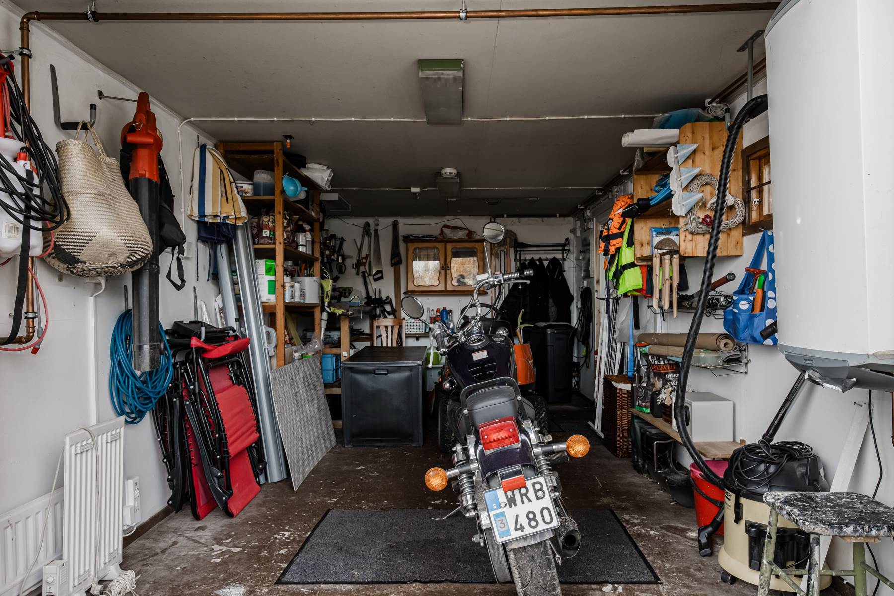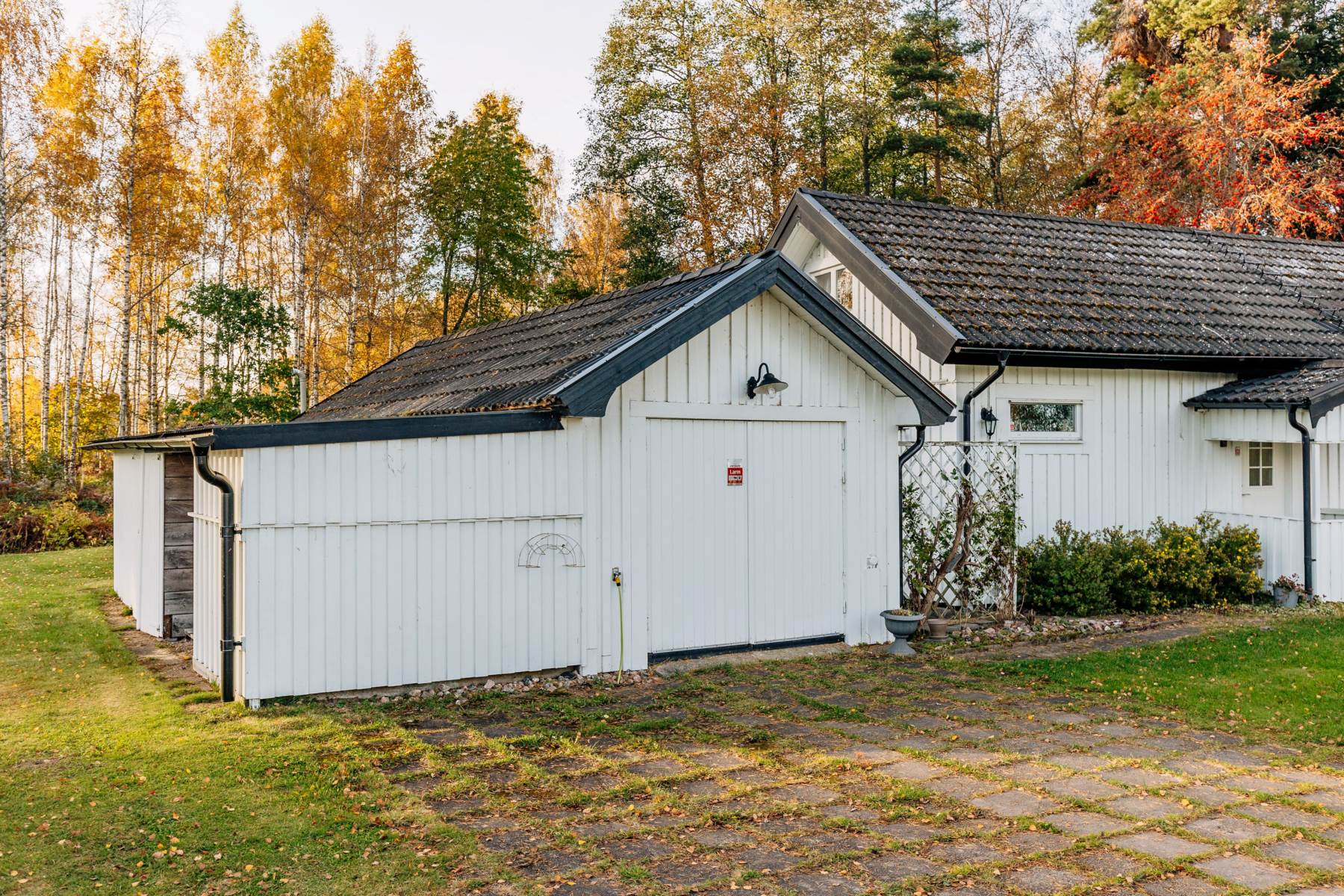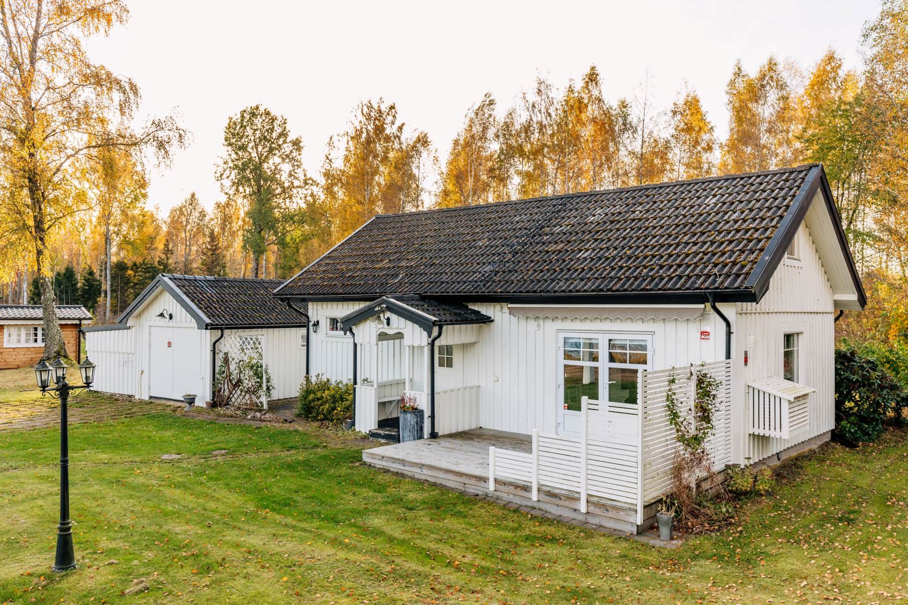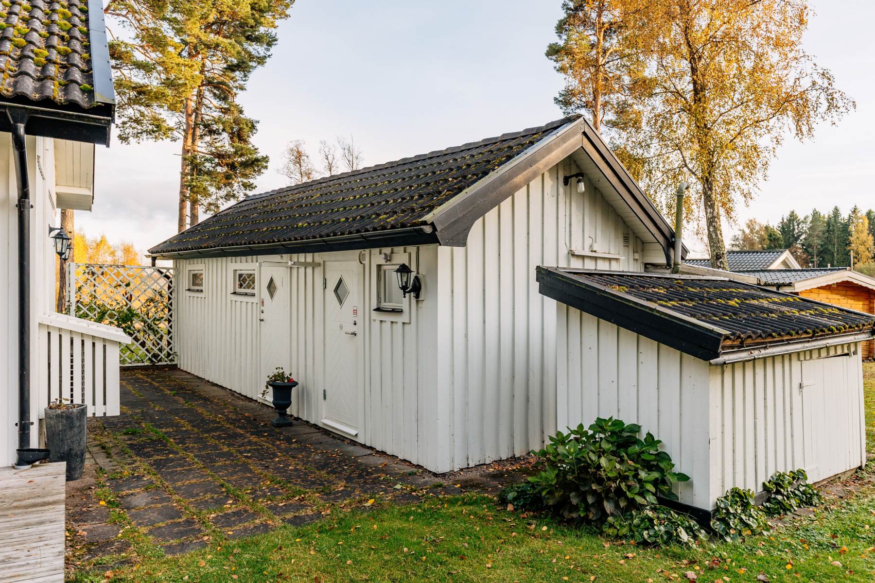 Utöver stugan finns en byggnad med garage, förråd samt badrum.
