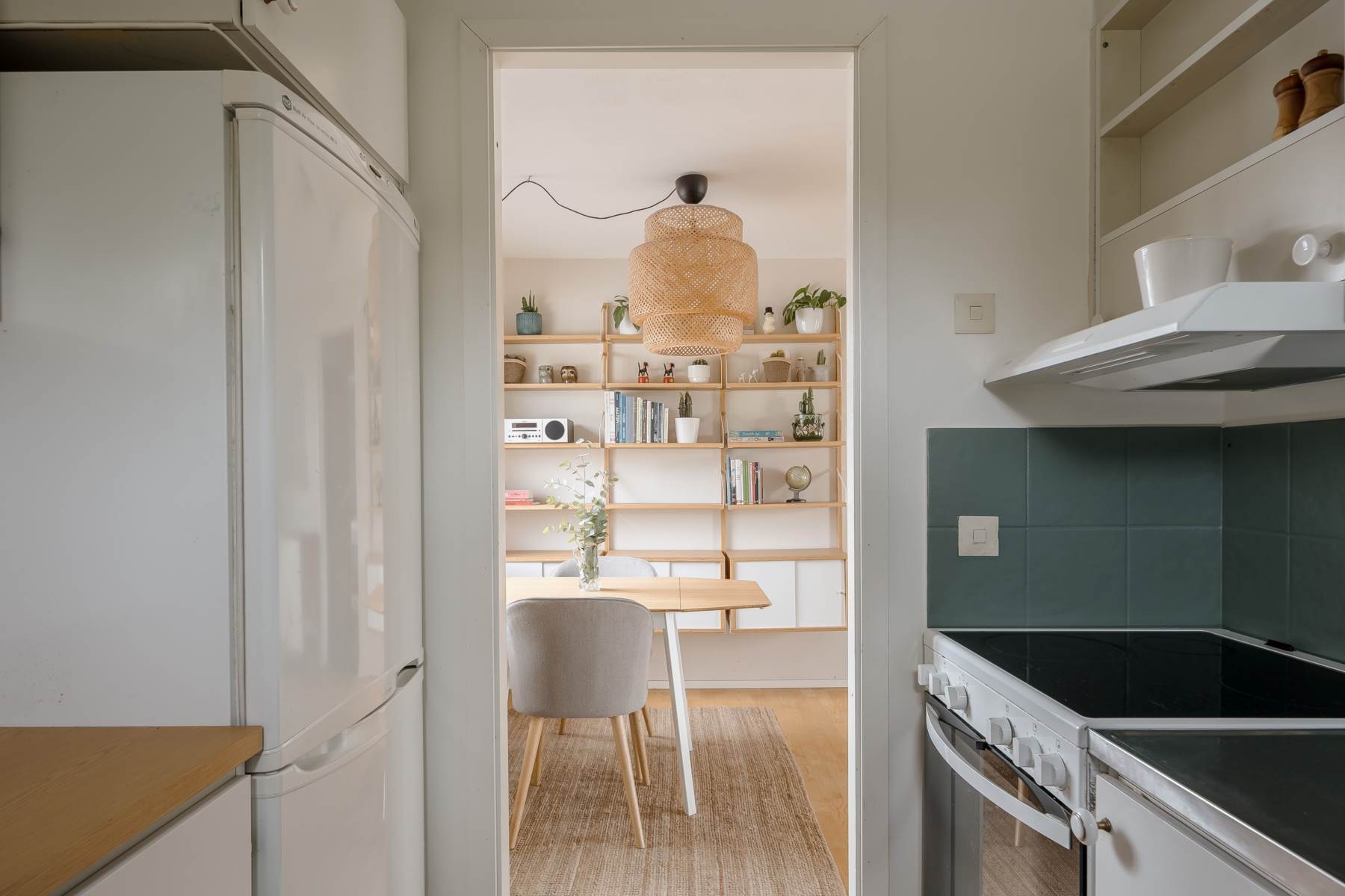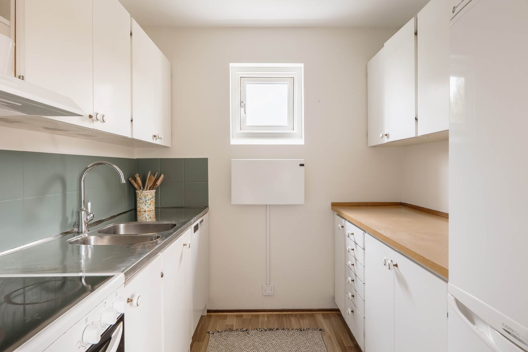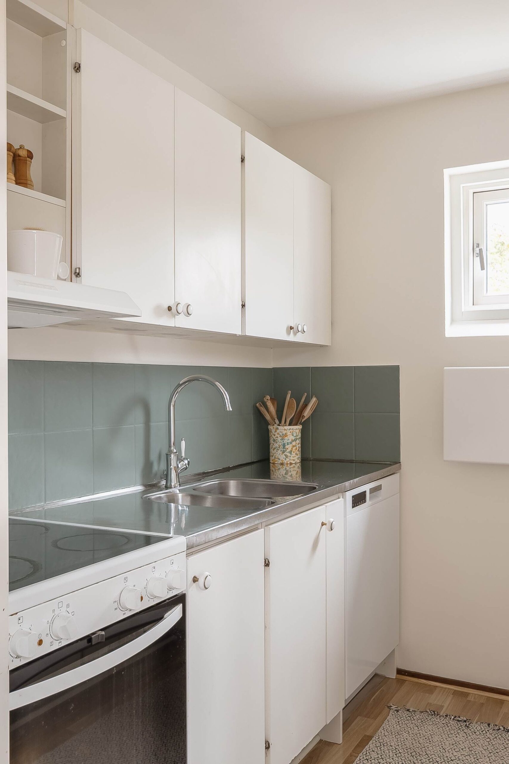 Från vardagsrummet nås kök och matplats vid fönster. Köket består av vita snickeriluckor, bänkskiva i rostfri stål samt arbetsyta i laminat. Ovan bänk sitter stänkskydd i form av kakel. Utrustat med kyl/frys, diskmaskin, spis, ugn samt fläkt.