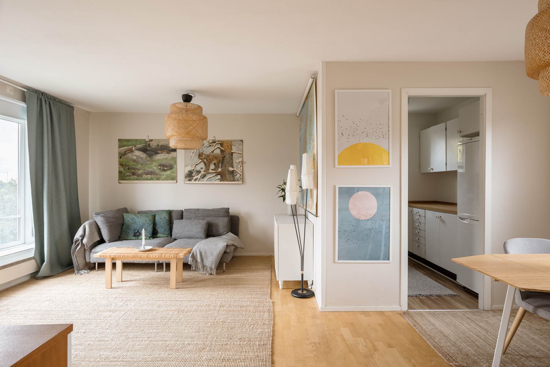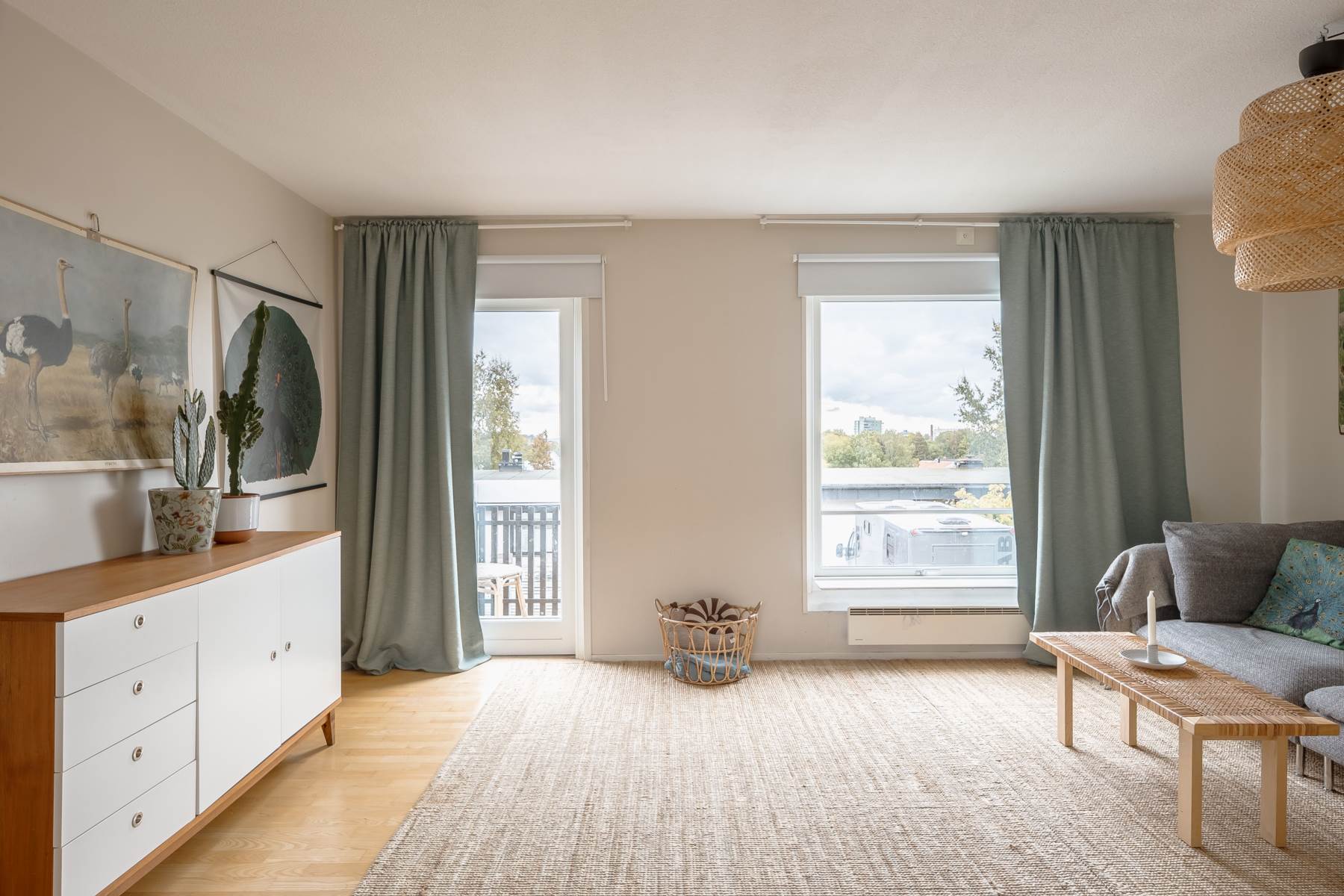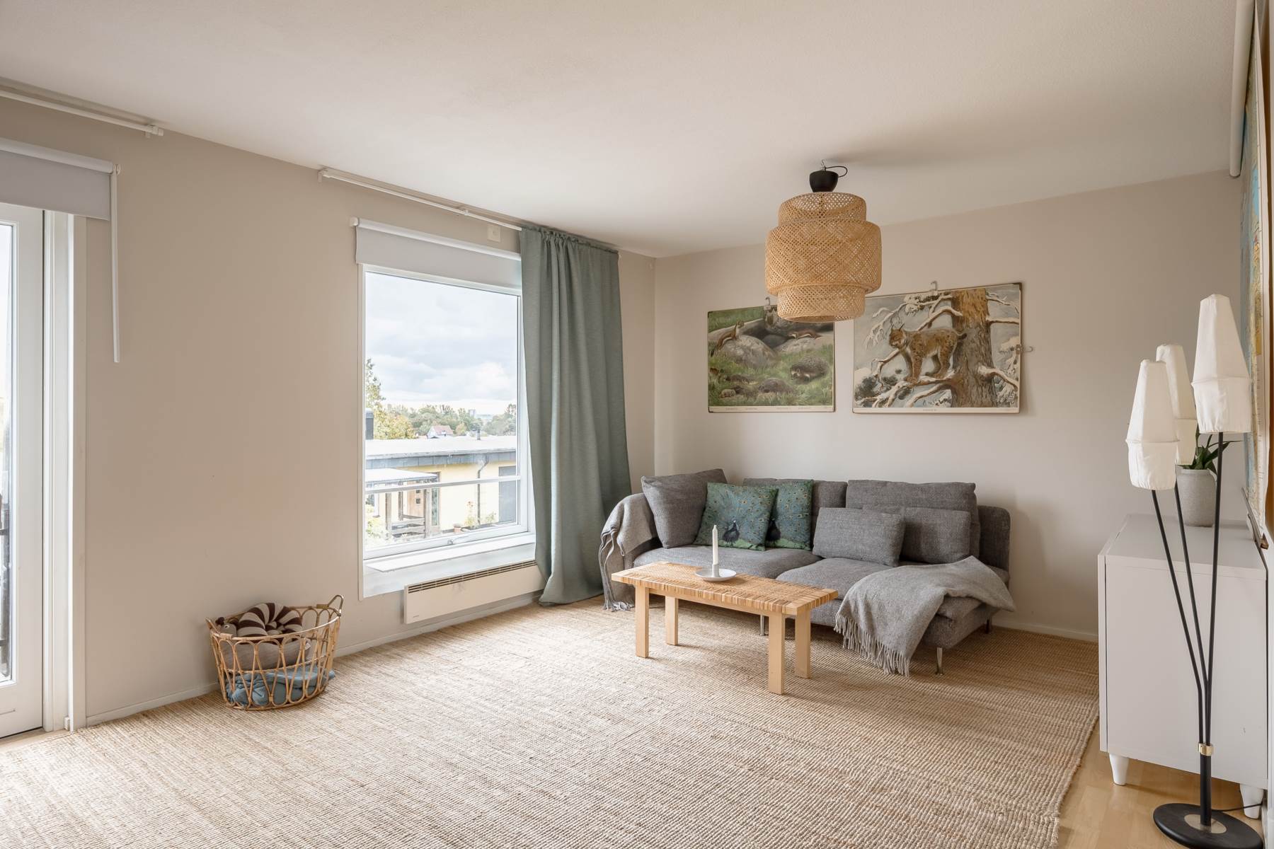 Luftigt vardagsrum med utgång till balkong. Här finns gott om plats för soffmöblemang. Gott om ljusinsläpp via stort fönster. På golvet ligger stavparkett i ask.