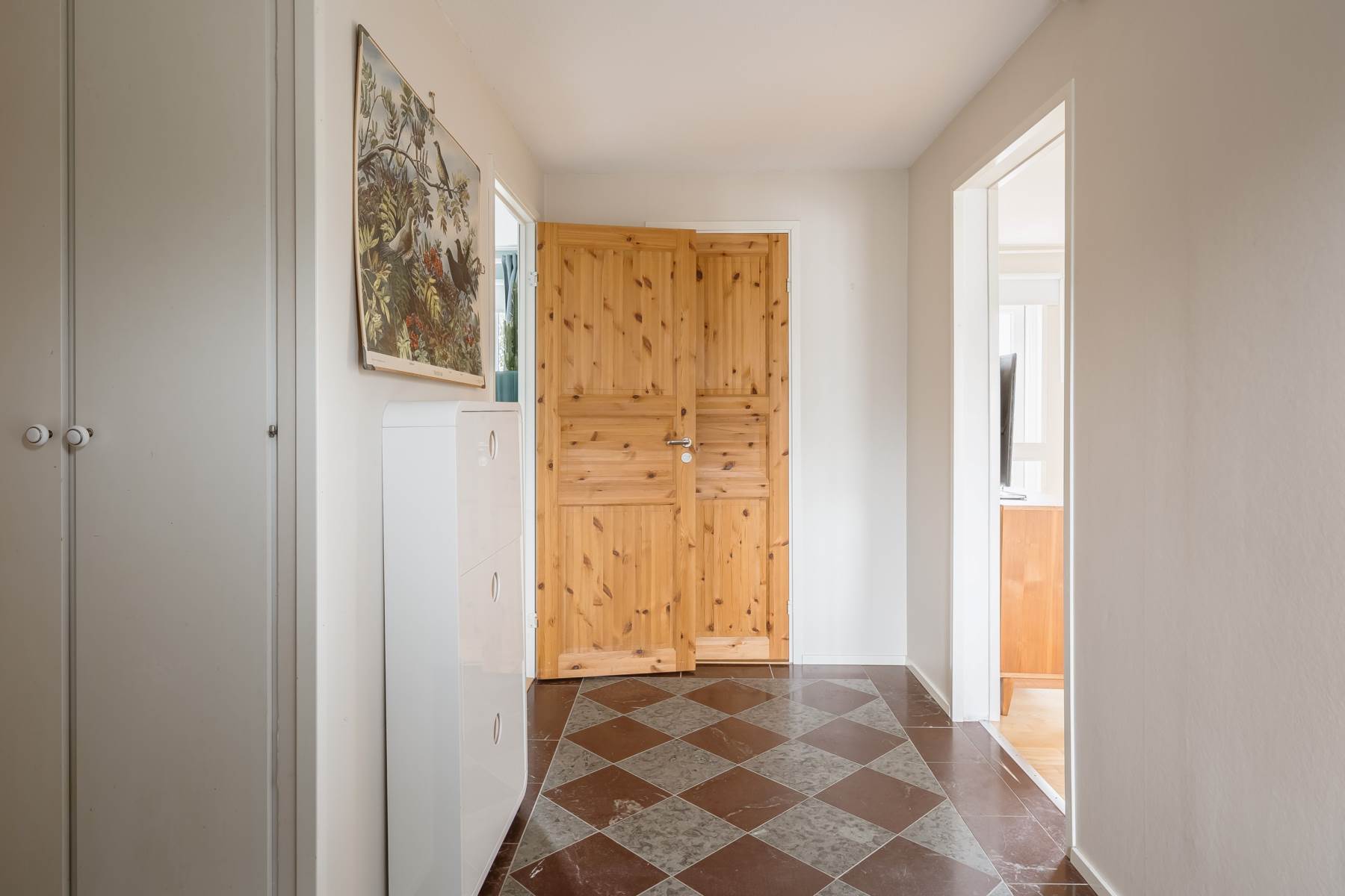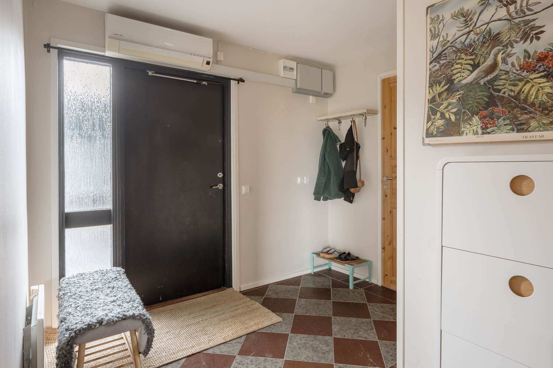 Välkommen in i denna trevliga bostad via en hall med praktisk kalksten samt ljusa väggar. Gott om plats för avhängning av kläder och här finns även en garderob och linneskåp samt golvvärme. Luftvärmepumpen ger värme när det behövs och svalkande AC vid behov.