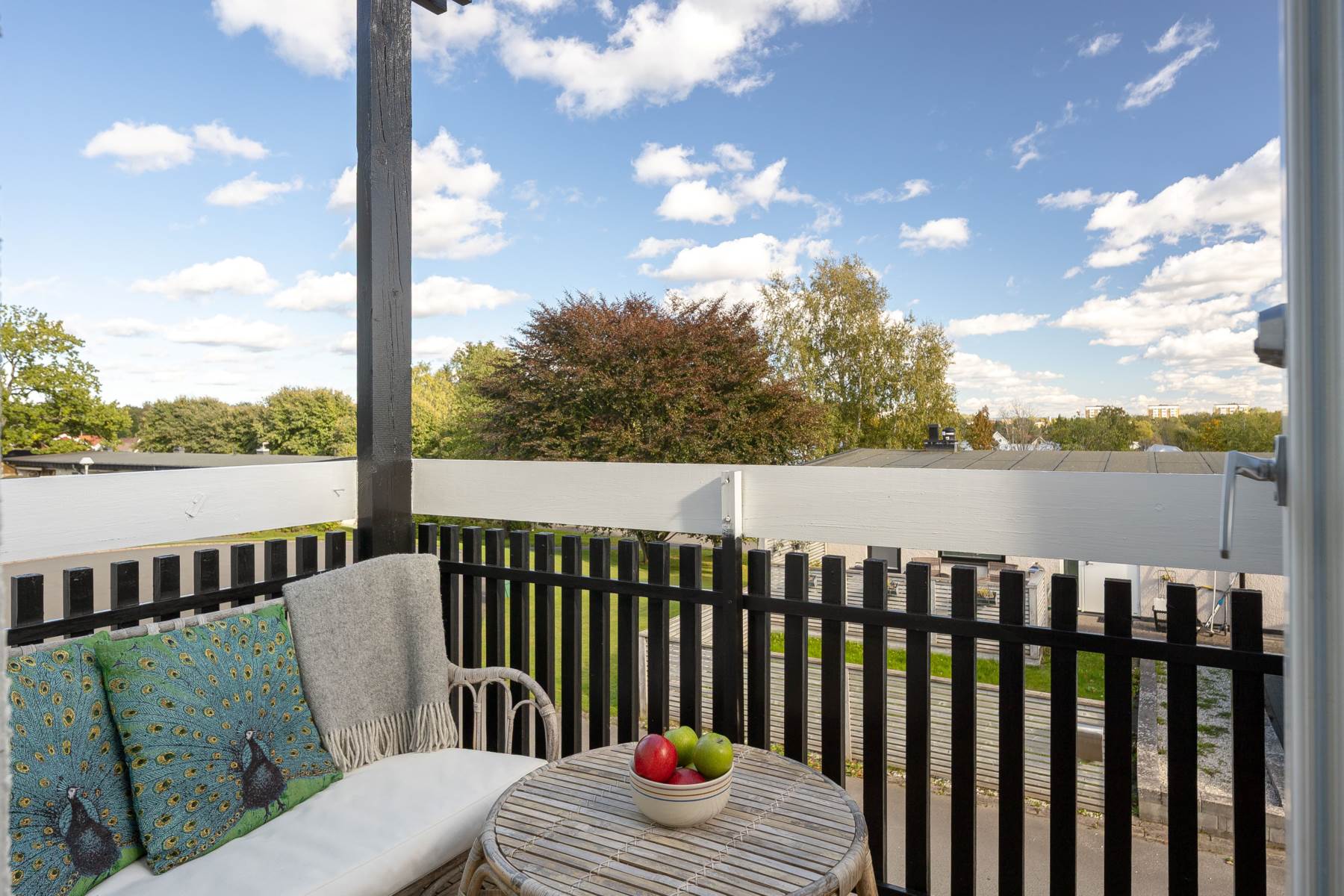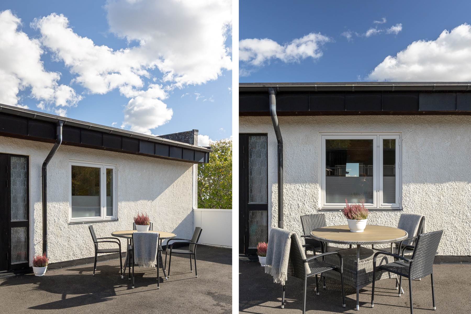 Balkong med morgonsol och uteplats med em./-kvällssol.
