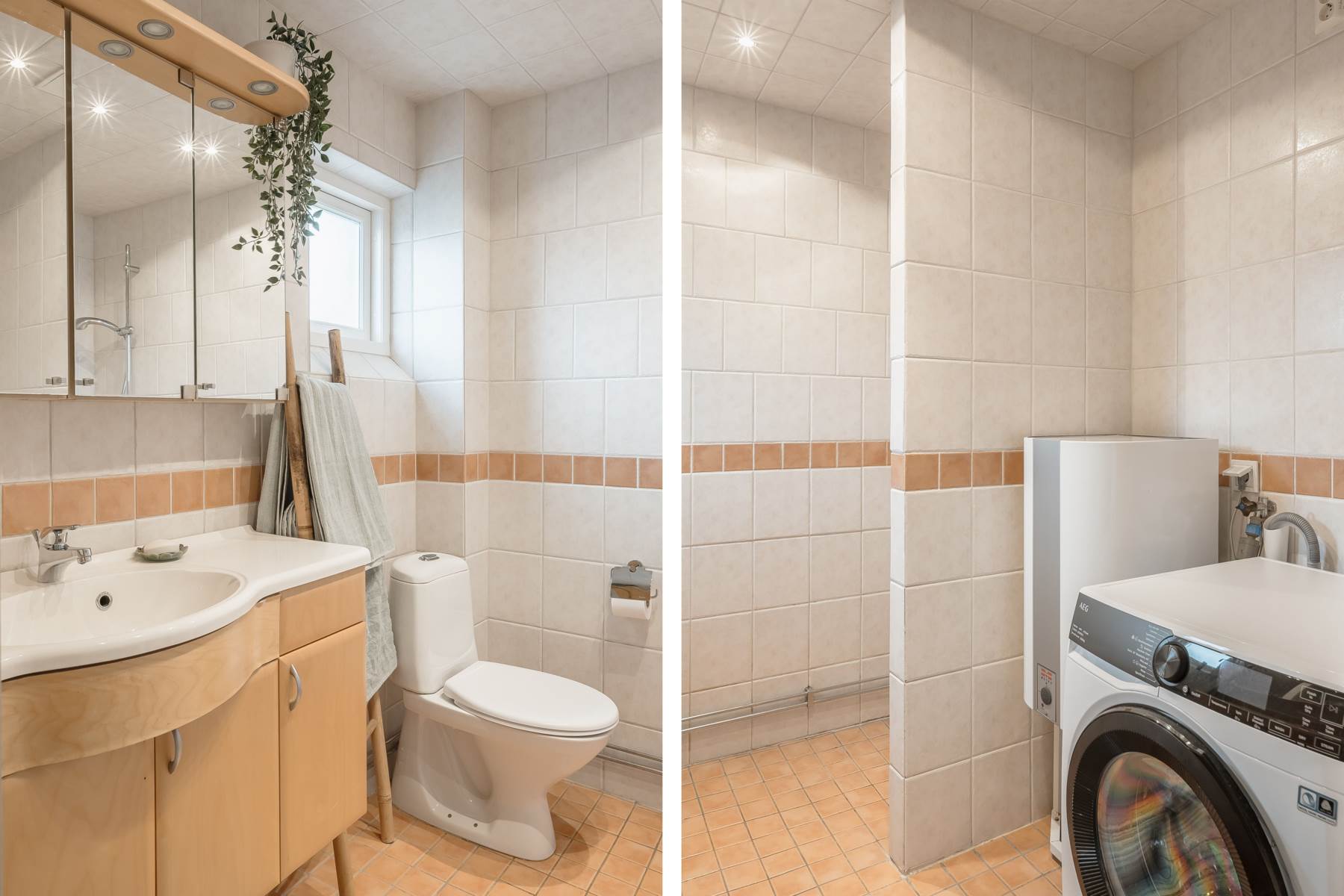 Till vänster om hallen nås det helkaklade badrummet. Utrustat med wc, dusch, handfat med väl tilltagen kommod, spegelskåp, kombinerad tvättmaskin/ torktumlare samt fönster för vädring.