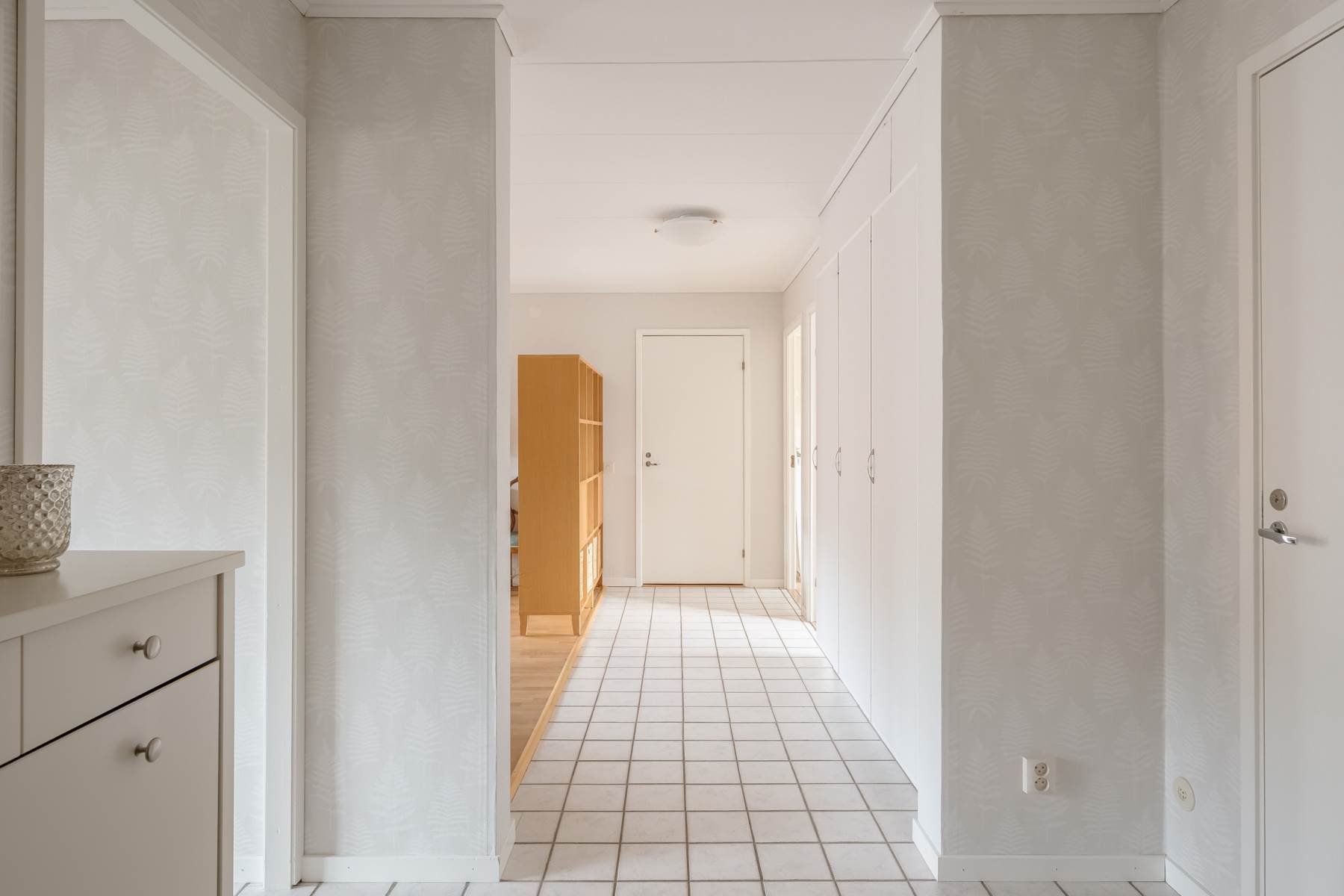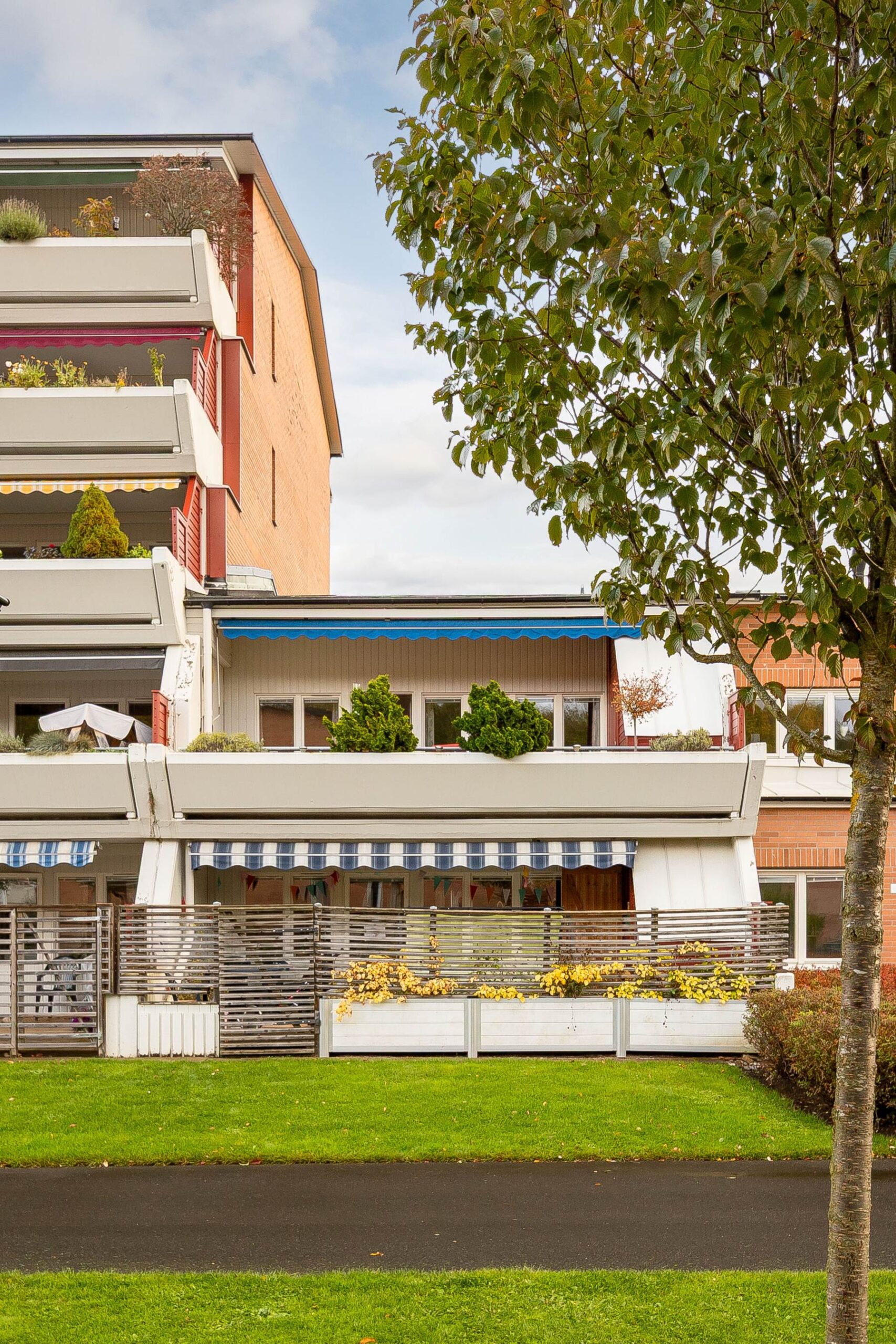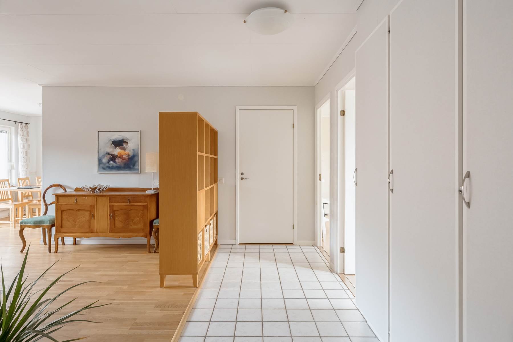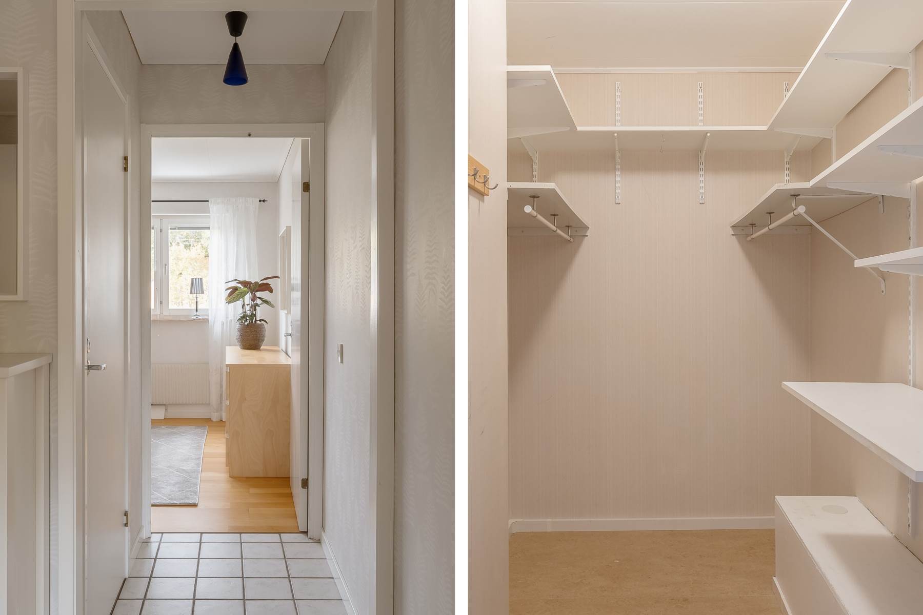 Rumsbeskrivning Terrass: Stor och inbjudande terrass med gott om plats för både sociala ytor och solstolar – perfekt för umgänge, middagar och avkoppling i solen. Här finns även ett praktiskt förråd med extra förvaringsmöjligheter. Vardagsrum och kök: Lägenhetens hjärta består av ett ljust vardagsrum i öppen planlösning mot köket. Här finns plats för en matplats för sex personer samt en trivsam soffgrupp. Vardagsrummet har vacker ekparkett och tapetserade väggar. Köket har vita snickerier, kakel ovanför diskbänken och laminatbänkskiva. Utrustningen består av kyl och frys i fullhöjd, diskmaskin, inbyggd mikrovågsugn, spis med ugn samt spisfläkt. Gott om både arbetsyta och förvaring. Sovrum 1: Rofyllt sovrum med ekparkett, tapetserade väggar och stor garderob som ramar in sängen – garderoben i ek kan medfölja vid köp. Här finns gott om plats för förvaring och en harmonisk sovmiljö. Hall: Välkomnande hall med klinkergolv och tapetserade väggar. Här finns tre platsbyggda garderober samt ytterligare en fristående garderob – utmärkt för ordning och reda. Klädkammare: Rymlig klädkammare med plastmatta på golv och tapetserade väggar. Kan enkelt göras om till en framtida walk-in-closet. Badrum/tvättstuga (äldre ytskikt): Praktiskt badrum med tvättmaskin, arbetsbänk, wc-stol, handfat, förvaringsskåp och dusch. Väggarna är tapetserade och golvet har plastmatta – redo för den som vill sätta sin egen prägel vid en framtida renovering. Sovrum 2: Mysigt sovrum med laminatgolv, tapetserade väggar och fönsterbräda i marmor. Här finns plats för både säng och skrivbord – perfekt som barnrum, kontor eller gästrum. Sovrum 3: Något större än sovrum 2, med laminatgolv, tapetserade väggar och ett charmigt burspråk med marmorskiva. Ett ljust och luftigt rum som lämpar sig väl som master bedroom eller tonårsrum. Renoverat badrum: Fräscht och modernt badrum med handdukstork, väggskåp, spegelskåp, wc-stol och dusch med glasväggar.