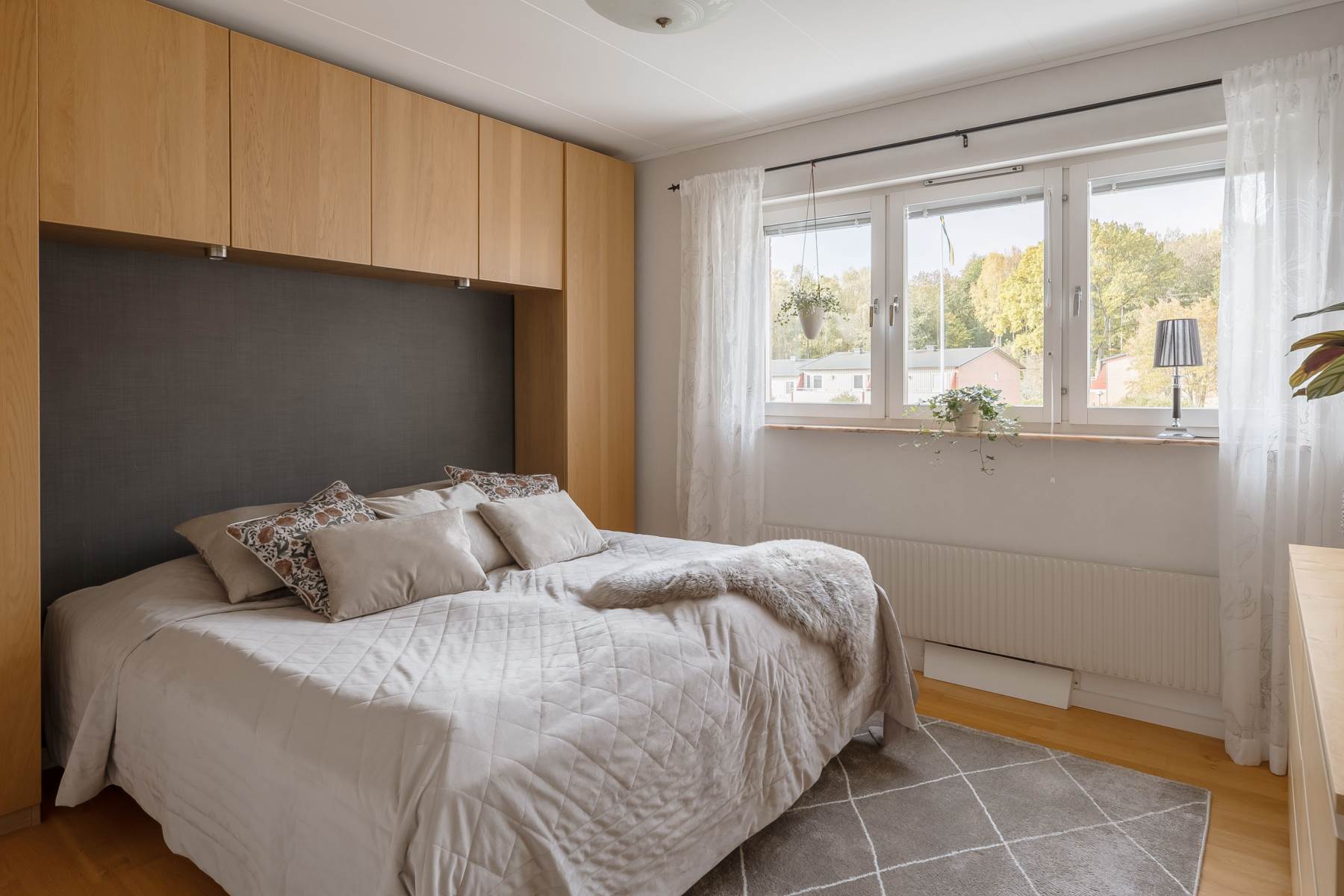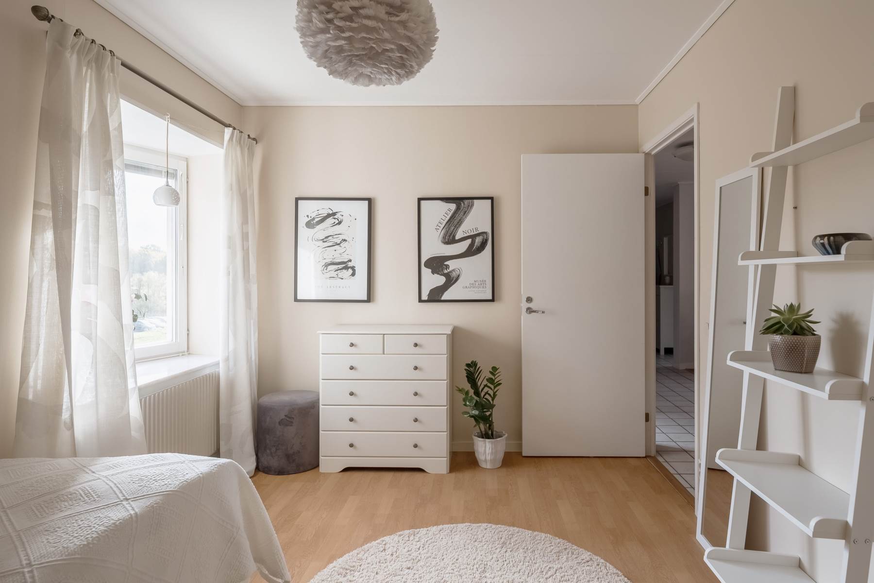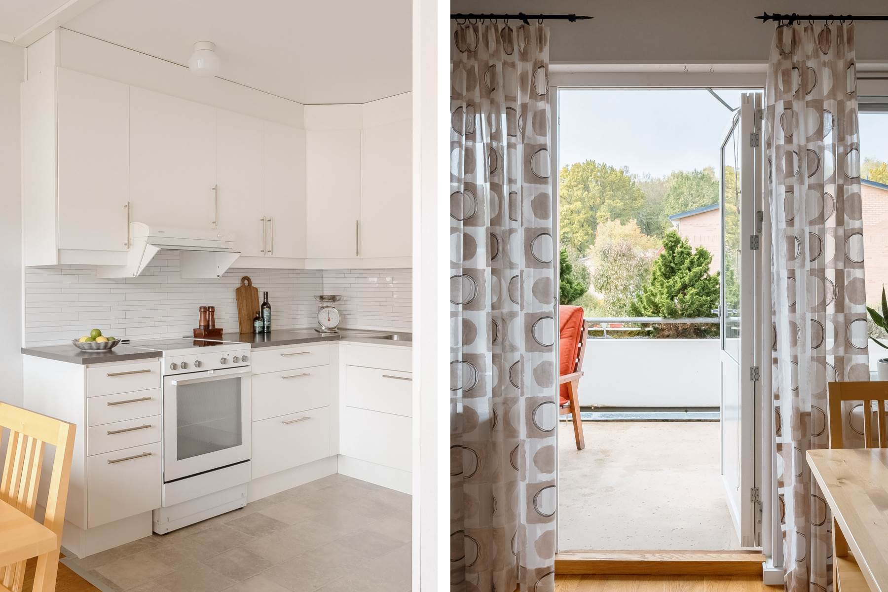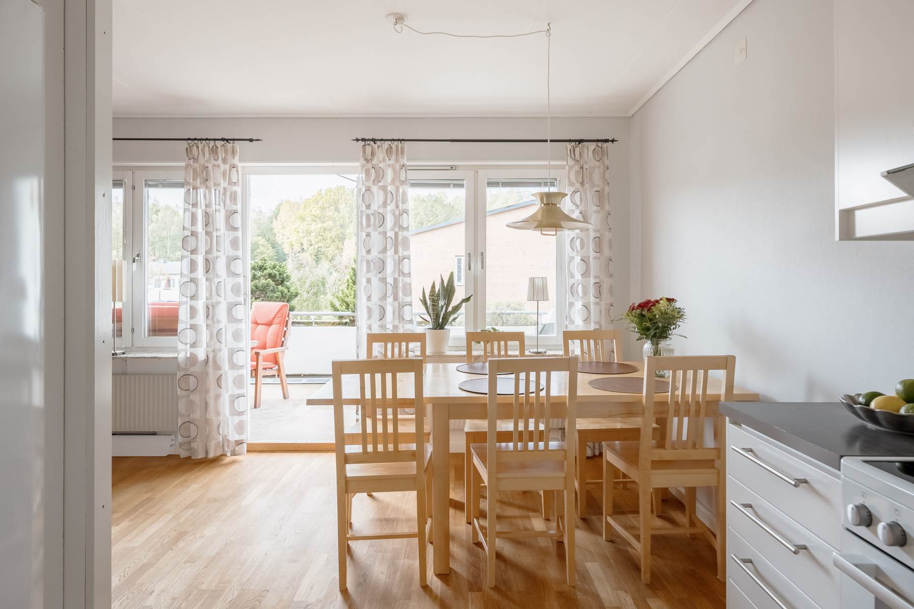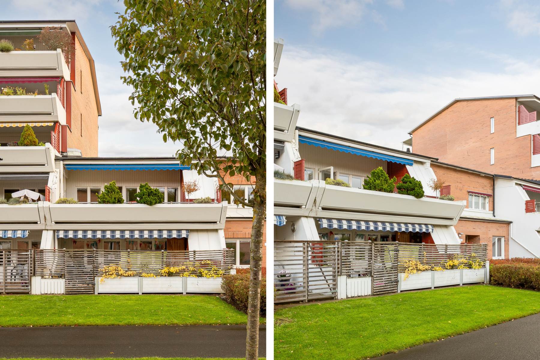Rumsbeskrivning Terrass: Stor och inbjudande terrass med gott om plats för både sociala ytor och solstolar – perfekt för umgänge, middagar och avkoppling i solen. Här finns även ett praktiskt förråd med extra förvaringsmöjligheter. Vardagsrum och kök: Lägenhetens hjärta består av ett ljust vardagsrum i öppen planlösning mot köket. Här finns plats för en matplats för sex personer samt en trivsam soffgrupp. Vardagsrummet har vacker ekparkett och tapetserade väggar. Köket har vita snickerier, kakel ovanför diskbänken och laminatbänkskiva. Utrustningen består av kyl och frys i fullhöjd, diskmaskin, inbyggd mikrovågsugn, spis med ugn samt spisfläkt. Gott om både arbetsyta och förvaring. Sovrum 1: Rofyllt sovrum med ekparkett, tapetserade väggar och stor garderob som ramar in sängen – garderoben i ek kan medfölja vid köp. Här finns gott om plats för förvaring och en harmonisk sovmiljö. Hall: Välkomnande hall med klinkergolv och tapetserade väggar. Här finns tre platsbyggda garderober samt ytterligare en fristående garderob – utmärkt för ordning och reda. Klädkammare: Rymlig klädkammare med plastmatta på golv och tapetserade väggar. Kan enkelt göras om till en framtida walk-in-closet. Badrum/tvättstuga (äldre ytskikt): Praktiskt badrum med tvättmaskin, arbetsbänk, wc-stol, handfat, förvaringsskåp och dusch. Väggarna är tapetserade och golvet har plastmatta – redo för den som vill sätta sin egen prägel vid en framtida renovering. Sovrum 2: Mysigt sovrum med laminatgolv, tapetserade väggar och fönsterbräda i marmor. Här finns plats för både säng och skrivbord – perfekt som barnrum, kontor eller gästrum. Sovrum 3: Något större än sovrum 2, med laminatgolv, tapetserade väggar och ett charmigt burspråk med marmorskiva. Ett ljust och luftigt rum som lämpar sig väl som master bedroom eller tonårsrum. Renoverat badrum: Fräscht och modernt badrum med handdukstork, väggskåp, spegelskåp, wc-stol och dusch med glasväggar.