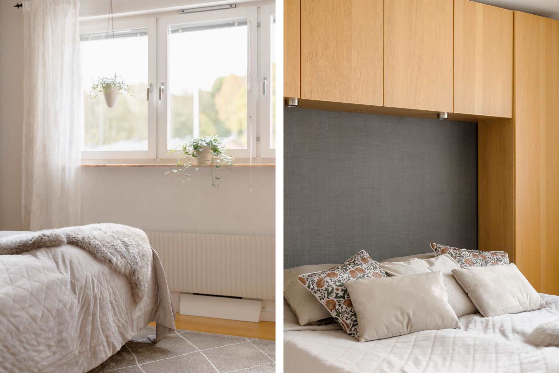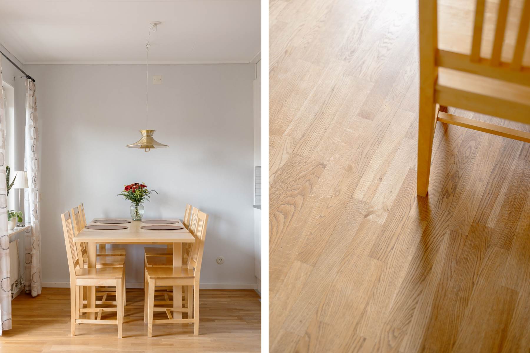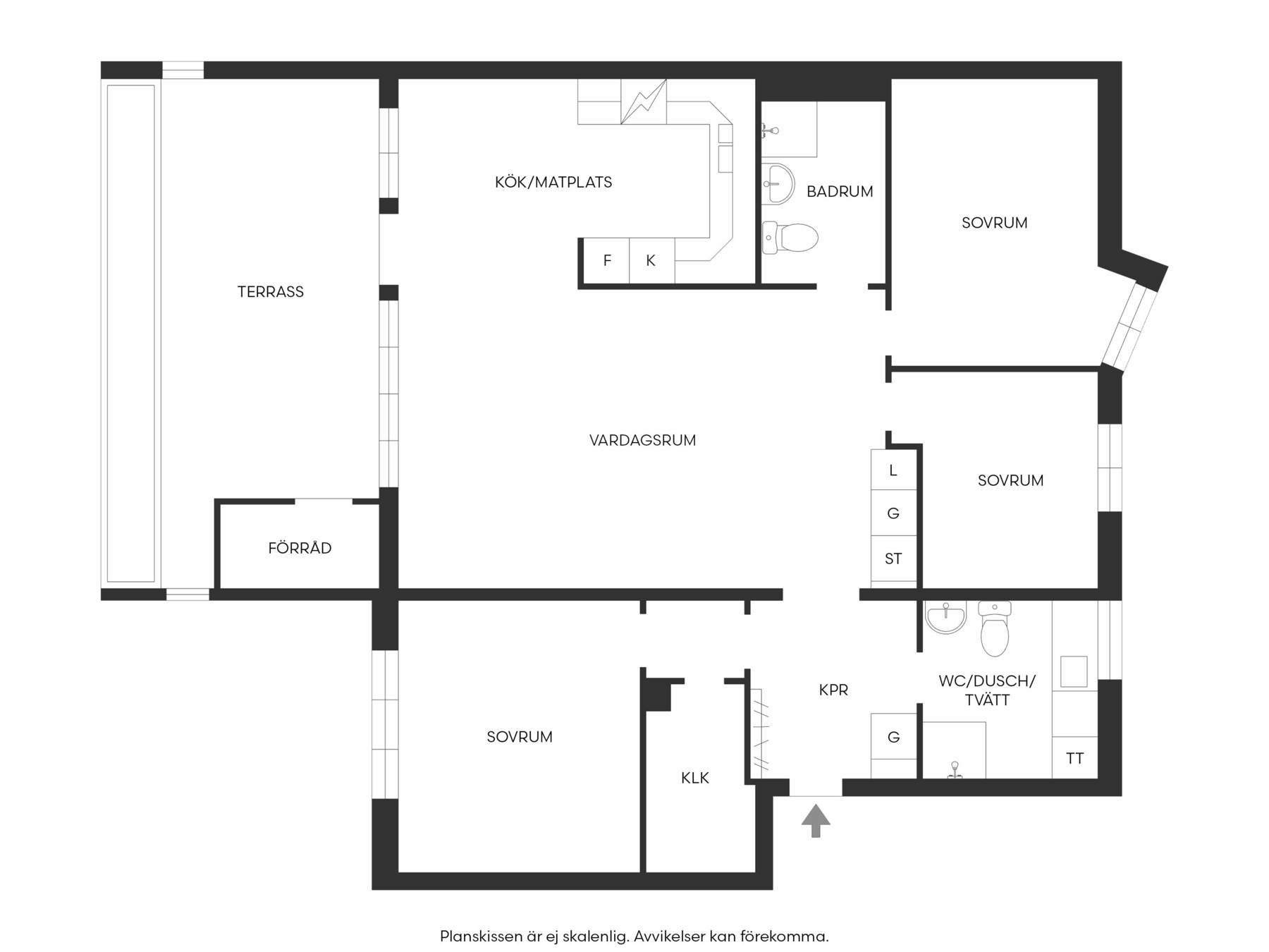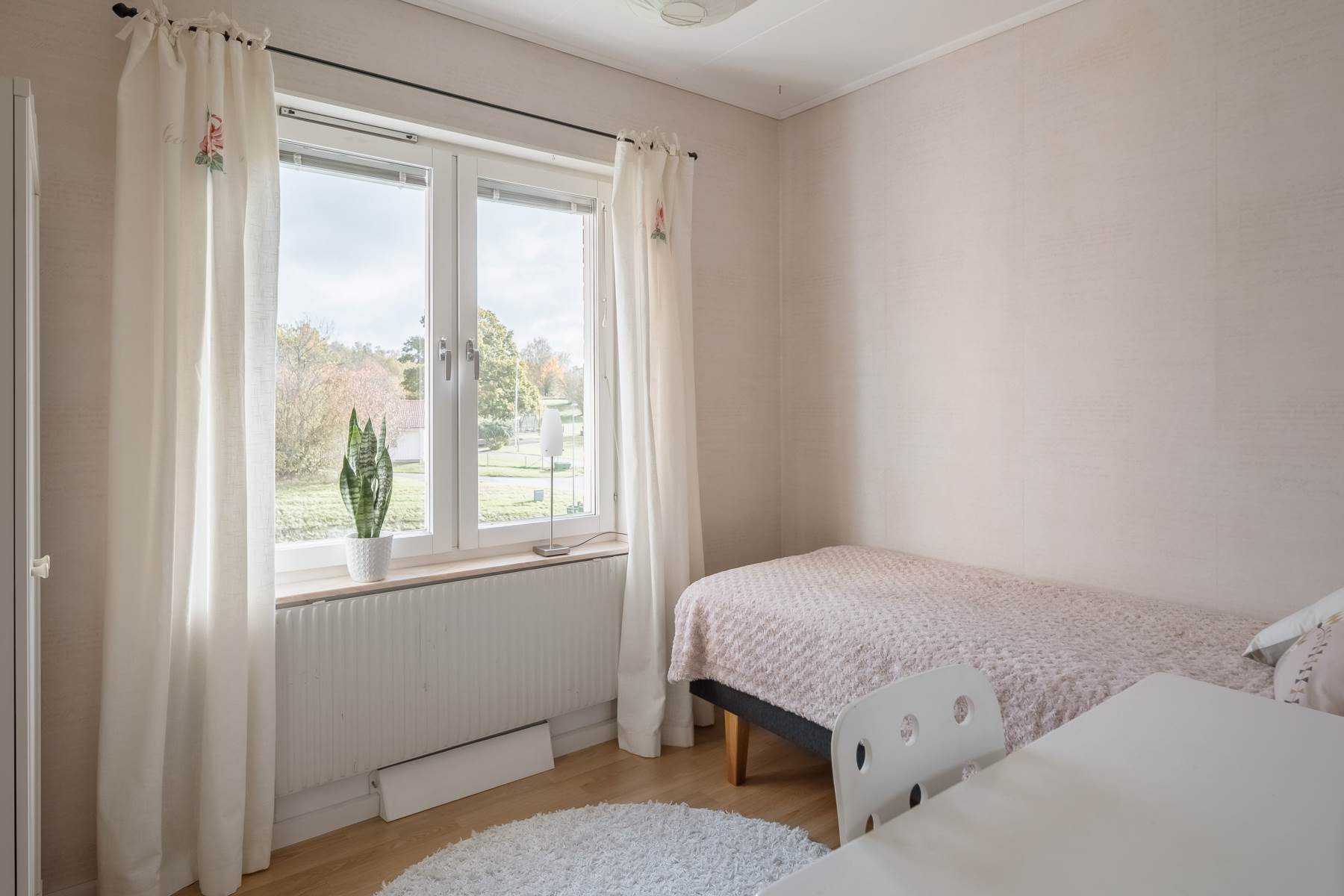 Rumsbeskrivning Terrass: Stor och inbjudande terrass med gott om plats för både sociala ytor och solstolar – perfekt för umgänge, middagar och avkoppling i solen. Här finns även ett praktiskt förråd med extra förvaringsmöjligheter. Vardagsrum och kök: Lägenhetens hjärta består av ett ljust vardagsrum i öppen planlösning mot köket. Här finns plats för en matplats för sex personer samt en trivsam soffgrupp. Vardagsrummet har vacker ekparkett och tapetserade väggar. Köket har vita snickerier, kakel ovanför diskbänken och laminatbänkskiva. Utrustningen består av kyl och frys i fullhöjd, diskmaskin, inbyggd mikrovågsugn, spis med ugn samt spisfläkt. Gott om både arbetsyta och förvaring. Sovrum 1: Rofyllt sovrum med ekparkett, tapetserade väggar och stor garderob som ramar in sängen – garderoben i ek kan medfölja vid köp. Här finns gott om plats för förvaring och en harmonisk sovmiljö. Hall: Välkomnande hall med klinkergolv och tapetserade väggar. Här finns tre platsbyggda garderober samt ytterligare en fristående garderob – utmärkt för ordning och reda. Klädkammare: Rymlig klädkammare med plastmatta på golv och tapetserade väggar. Kan enkelt göras om till en framtida walk-in-closet. Badrum/tvättstuga (äldre ytskikt): Praktiskt badrum med tvättmaskin, arbetsbänk, wc-stol, handfat, förvaringsskåp och dusch. Väggarna är tapetserade och golvet har plastmatta – redo för den som vill sätta sin egen prägel vid en framtida renovering. Sovrum 2: Mysigt sovrum med laminatgolv, tapetserade väggar och fönsterbräda i marmor. Här finns plats för både säng och skrivbord – perfekt som barnrum, kontor eller gästrum. Sovrum 3: Något större än sovrum 2, med laminatgolv, tapetserade väggar och ett charmigt burspråk med marmorskiva. Ett ljust och luftigt rum som lämpar sig väl som master bedroom eller tonårsrum. Renoverat badrum: Fräscht och modernt badrum med handdukstork, väggskåp, spegelskåp, wc-stol och dusch med glasväggar.