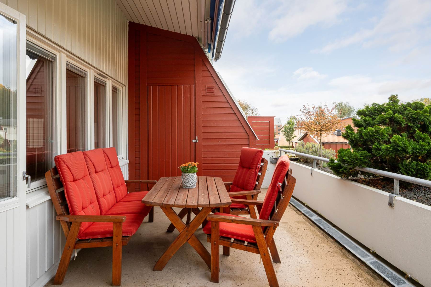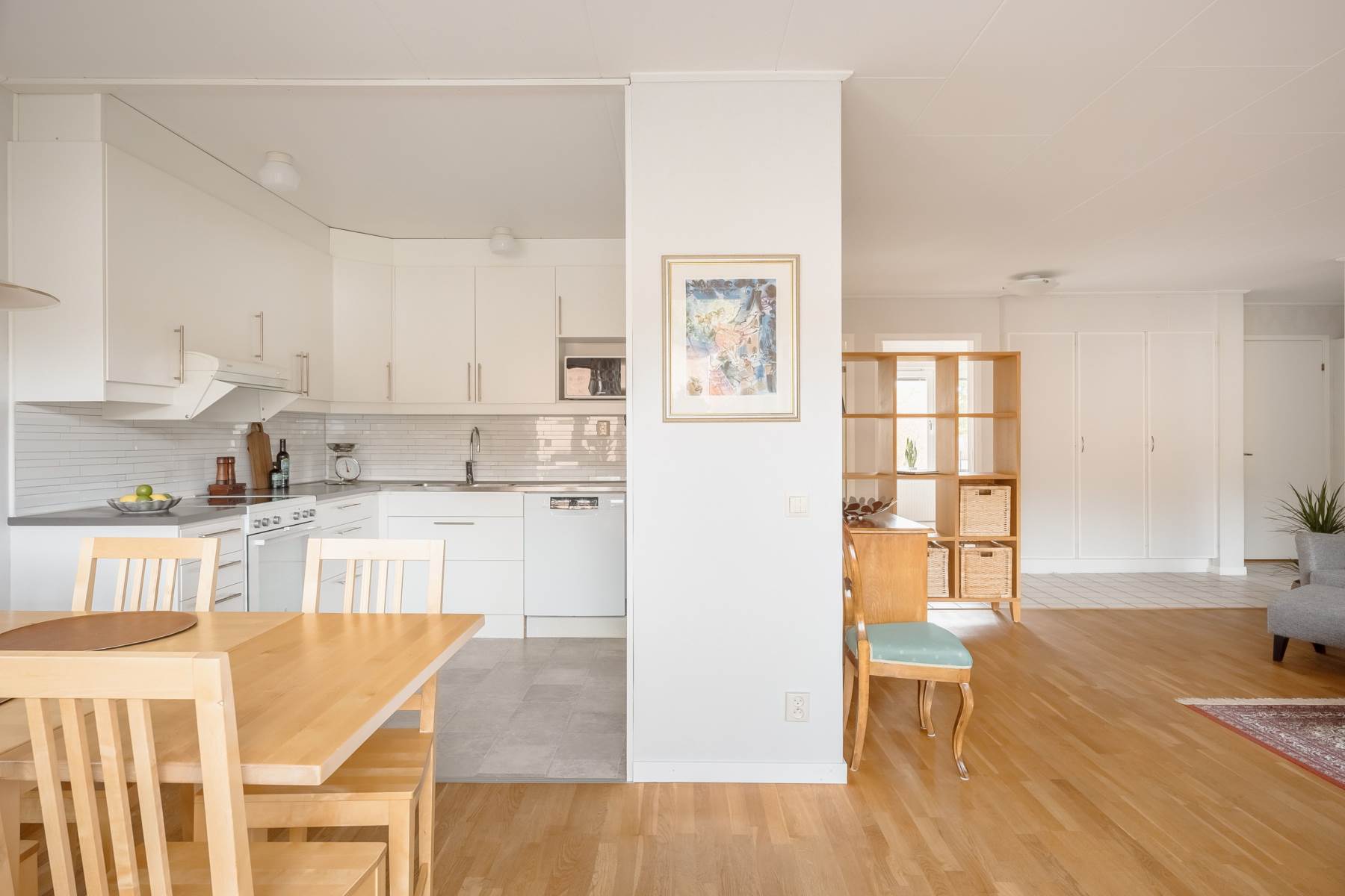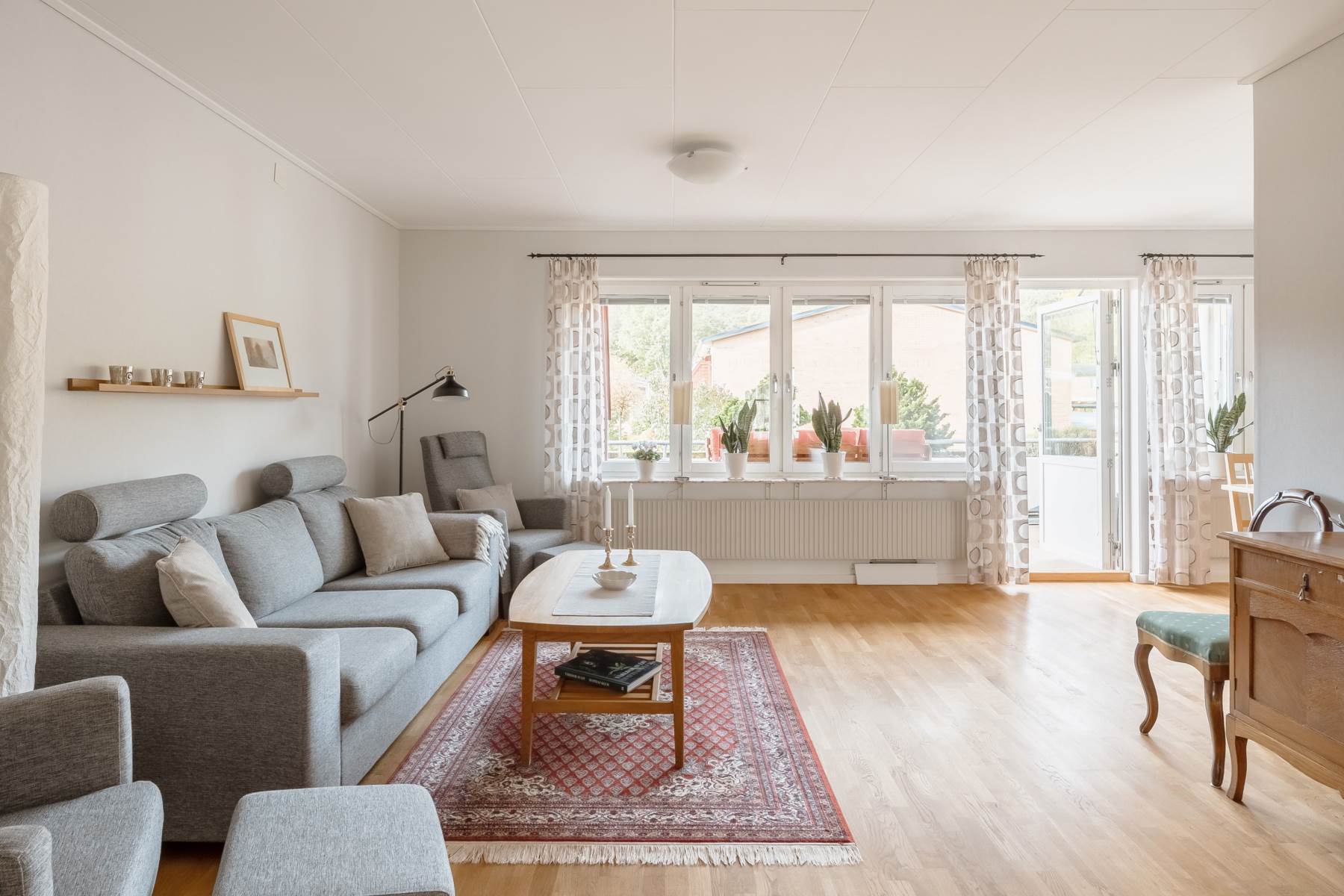 Bostaden erbjuder fyra välplanerade rum och kök med en härligt öppen planlösning mellan kök och vardagsrum – perfekt för sociala middagar, familjemys eller festliga kvällar med vänner. Från vardagsrummet kliver du rakt ut på den stora terrassen, en riktig oas med plats för både loungemöbler, grill och blomstrande växter. Här njuter du av soliga dagar och magiska kvällar med utsikt över det grönskande området.
