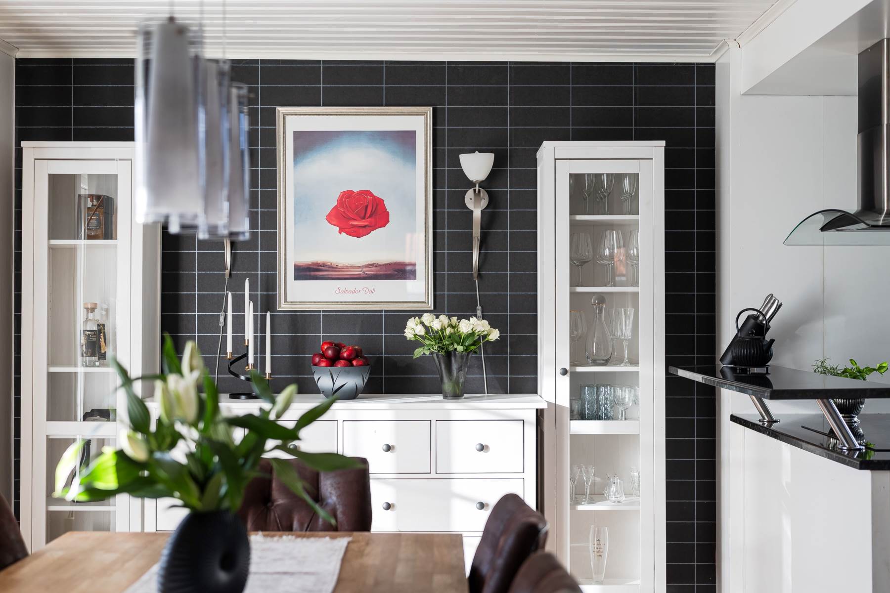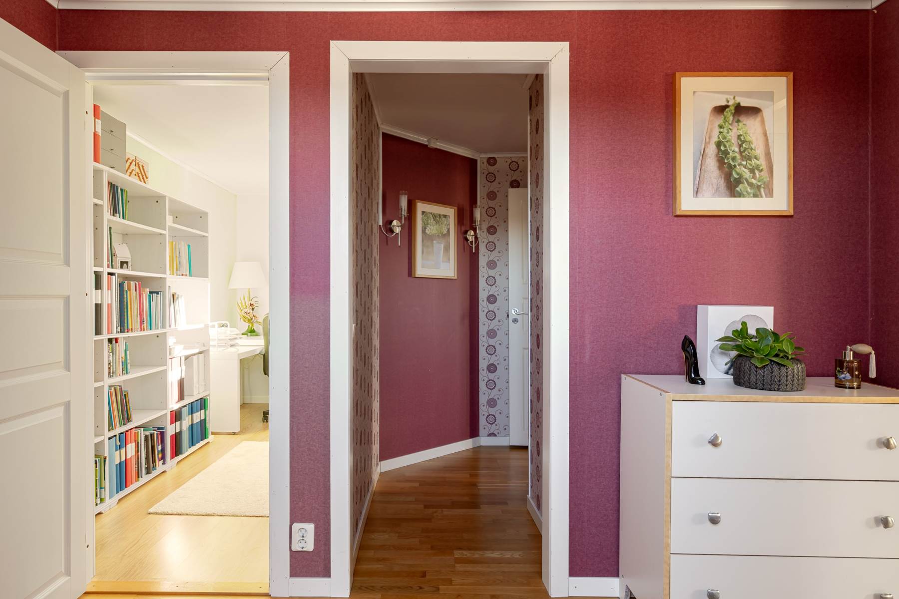 Ekparkett, målad och tapetserad vägg och utgång via dubbeldörrar till altandäck i soligt söderläge.