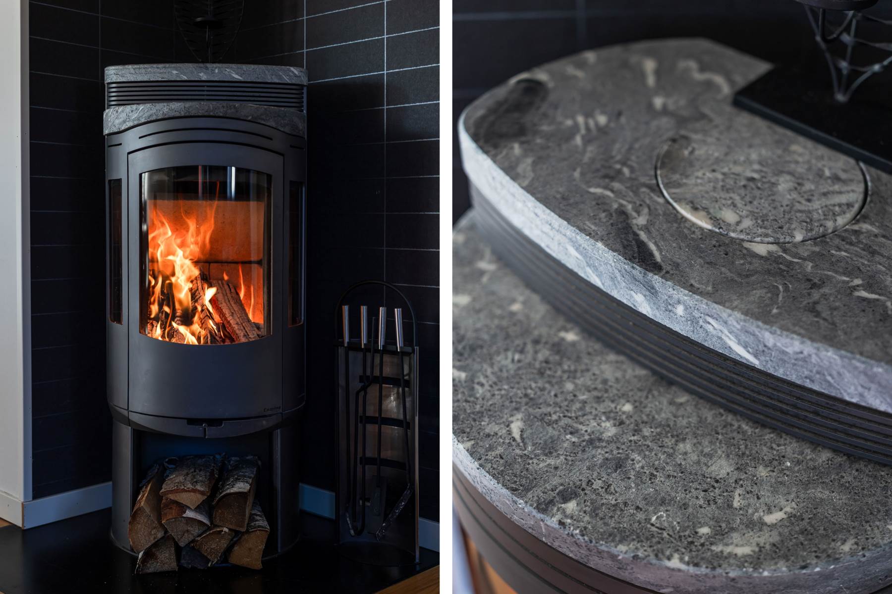 Ekparkett, målade väggar och värmande täljstenskamin.