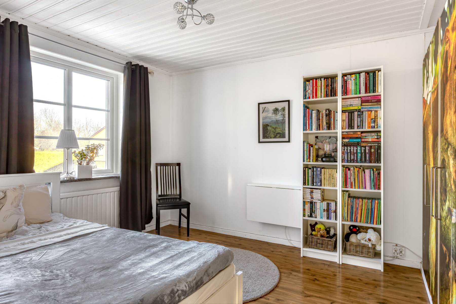 Rymligt sovrum med laminatgolv och putsade och målade väggar.