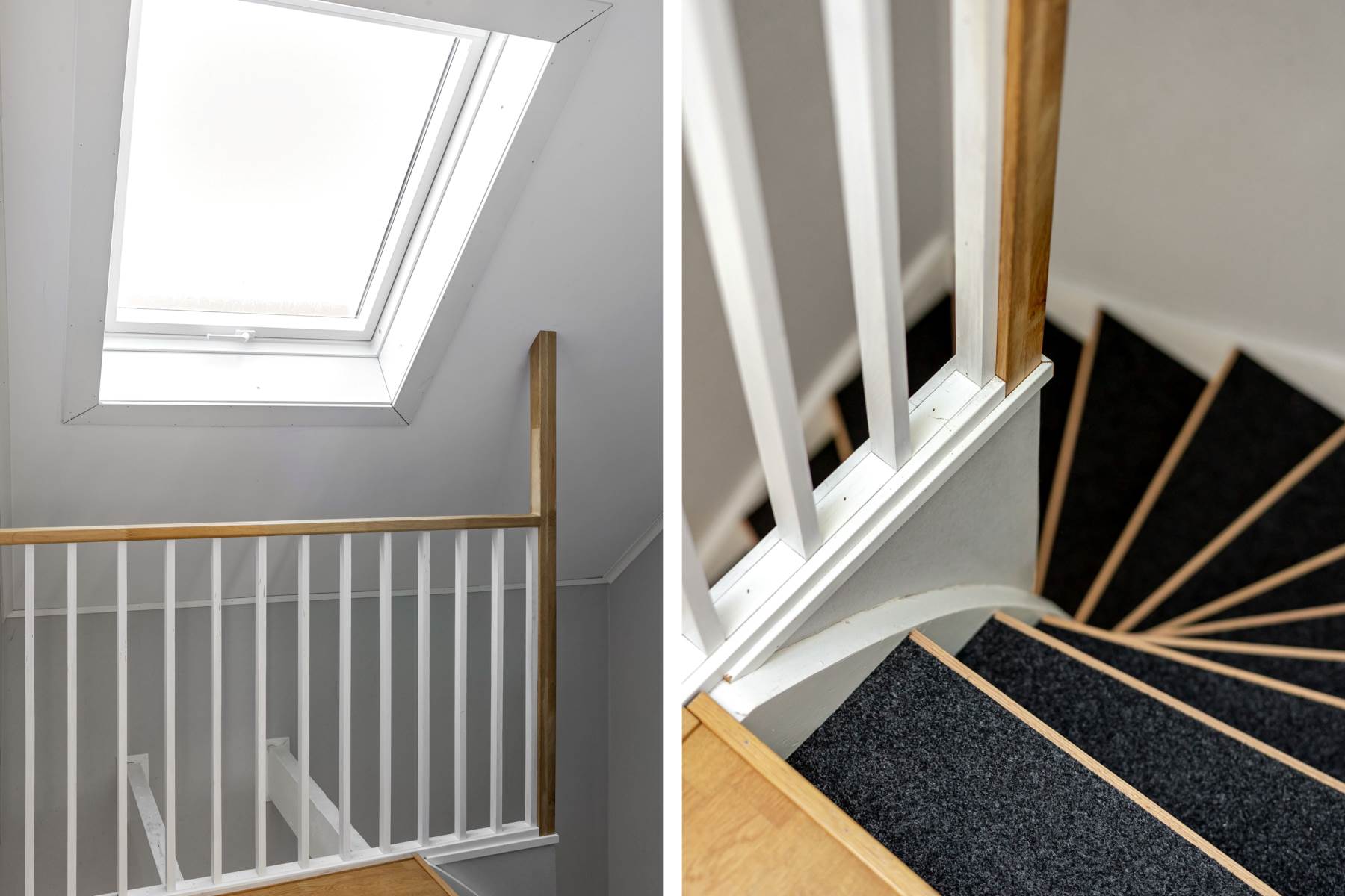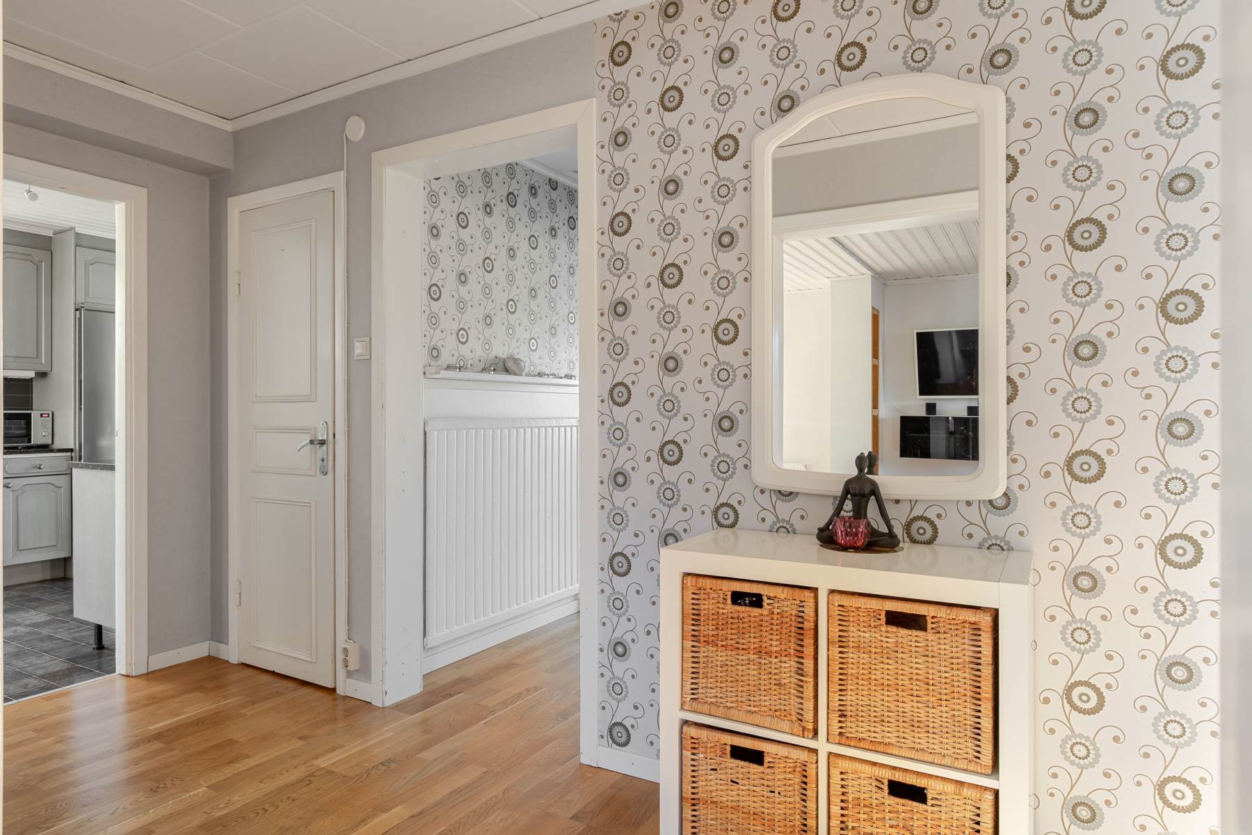 Laminatgolv och ljust tapetserade väggar