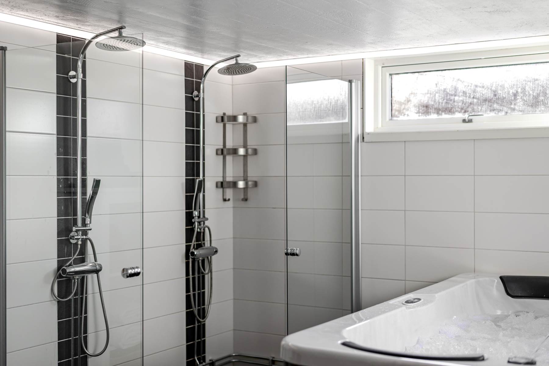 Klinkergolv med vattenburen golvvärme, kaklade väggar, dubbla duschar, spabad och separat toalett.