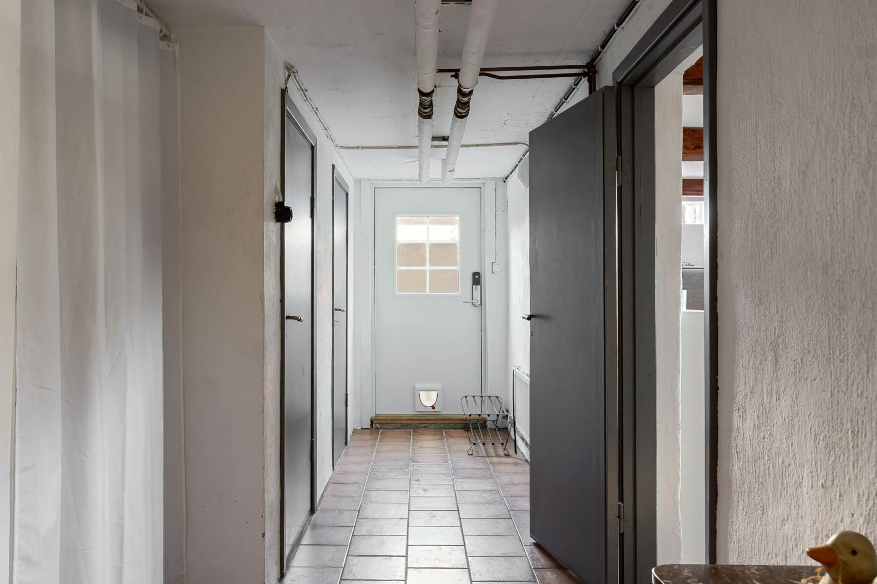 Klinkergolv med vattenburen golvvärme tapetserade väggar och hatthylla för avhängning.