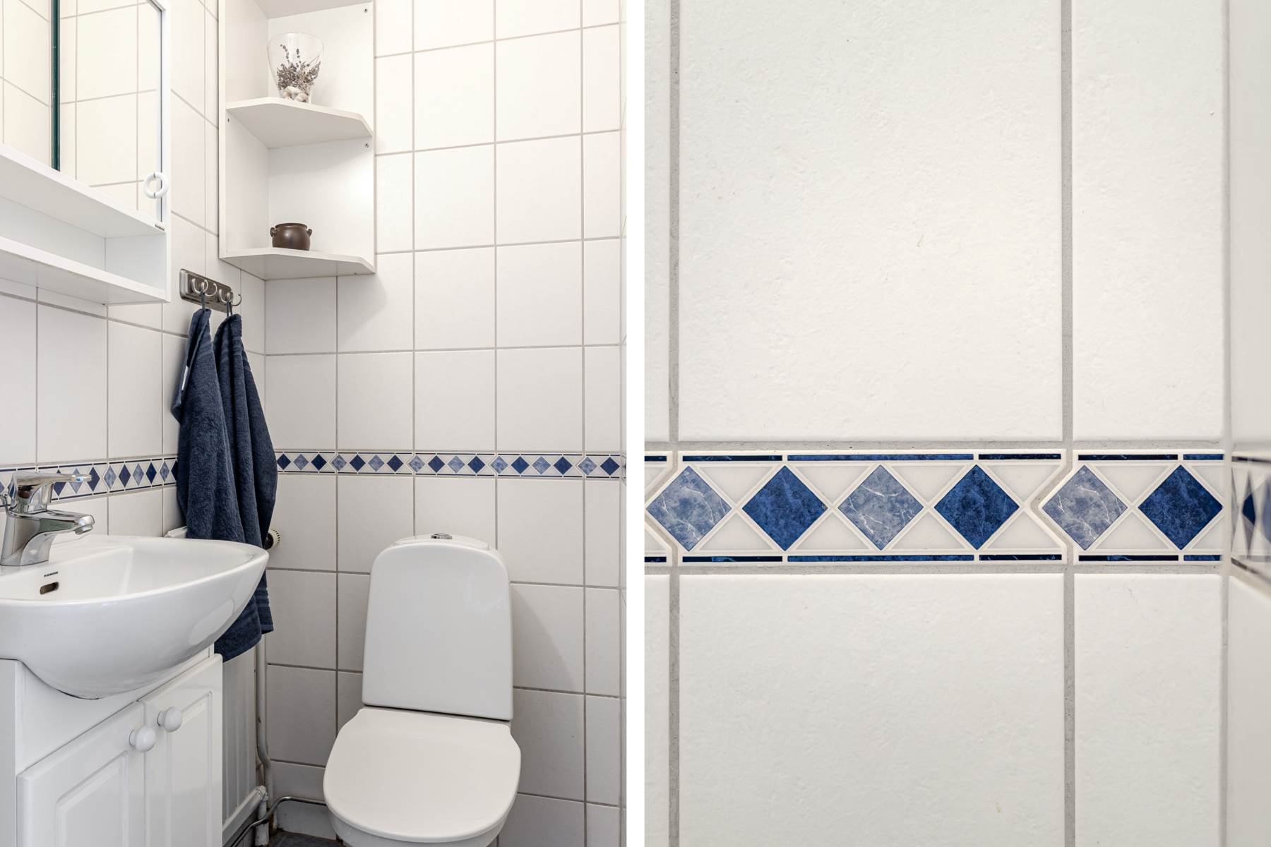 Klinkergolv, kaklade väggar, handfat i kommod och toalett.