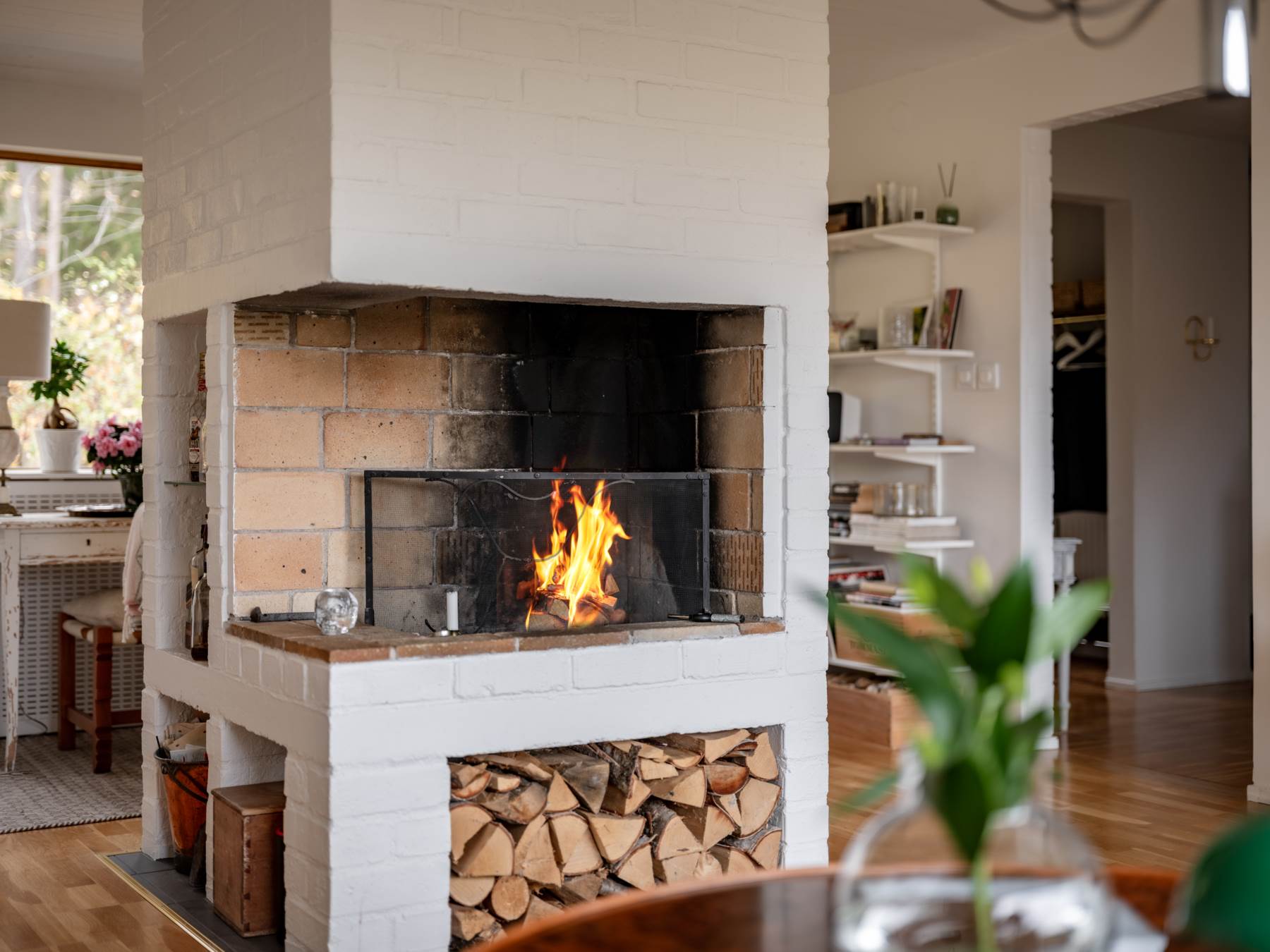 VARDAGSRUM: Stort rum med öppen spis i mitten och fönster i två väderstreck. Utgång till balkong med tak.