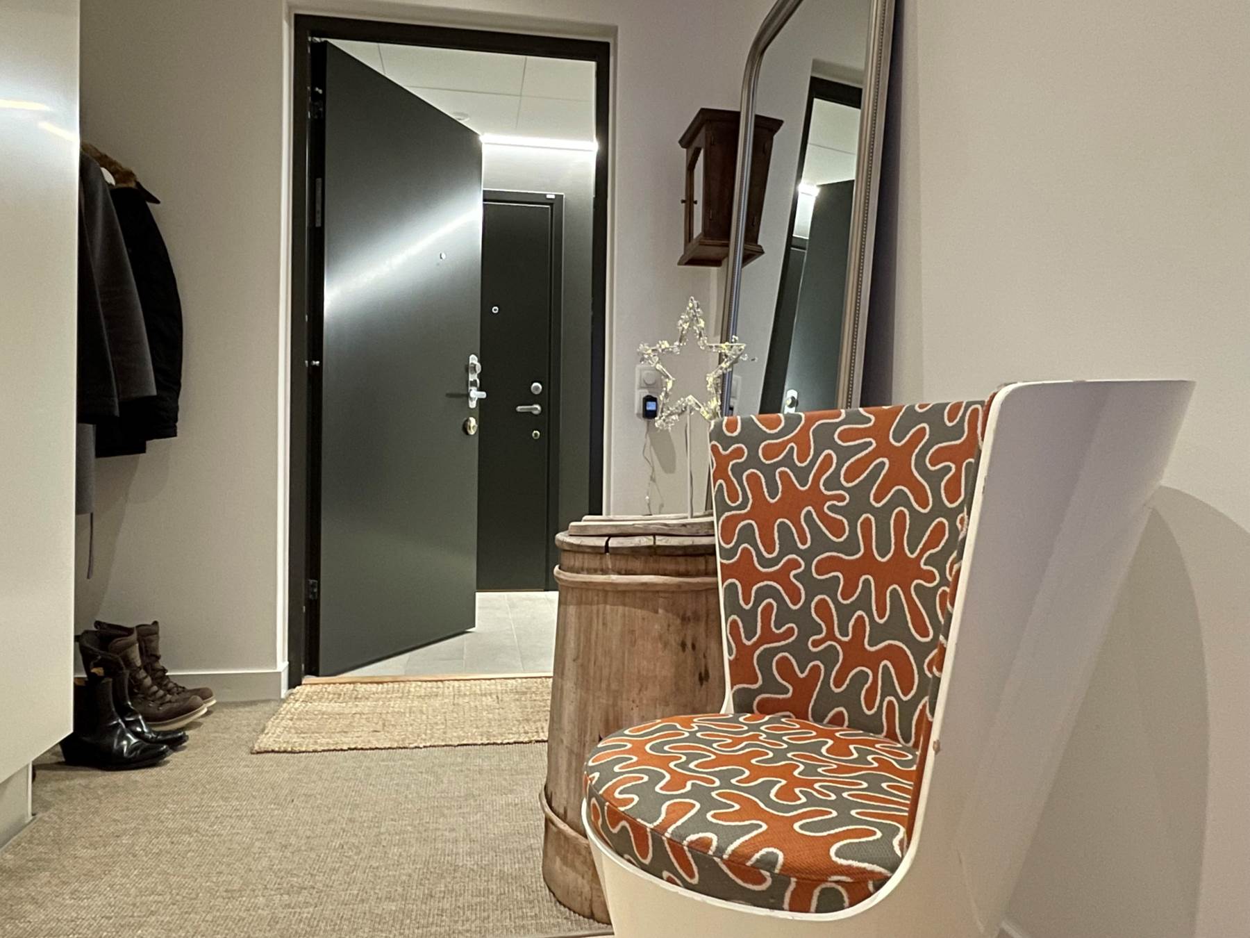 När du kliver in i bostaden möts du av en välkomnande hall med goda avhängningsmöjligheter och garderob för förvaring. Härifrån nås bostadens samtliga rum på ett naturligt och genomtänkt sätt.