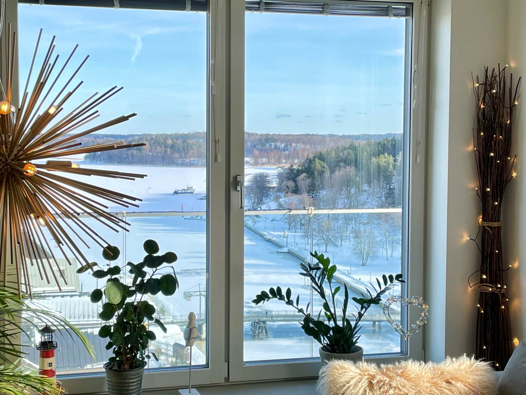 Det rymliga vardagsrummet har god kapacitet för placering av både soffgrupp och soffbord. Rummet är utrustat med tre stora fönster som erbjuder en panoramautsikt över Norrtäljeviken