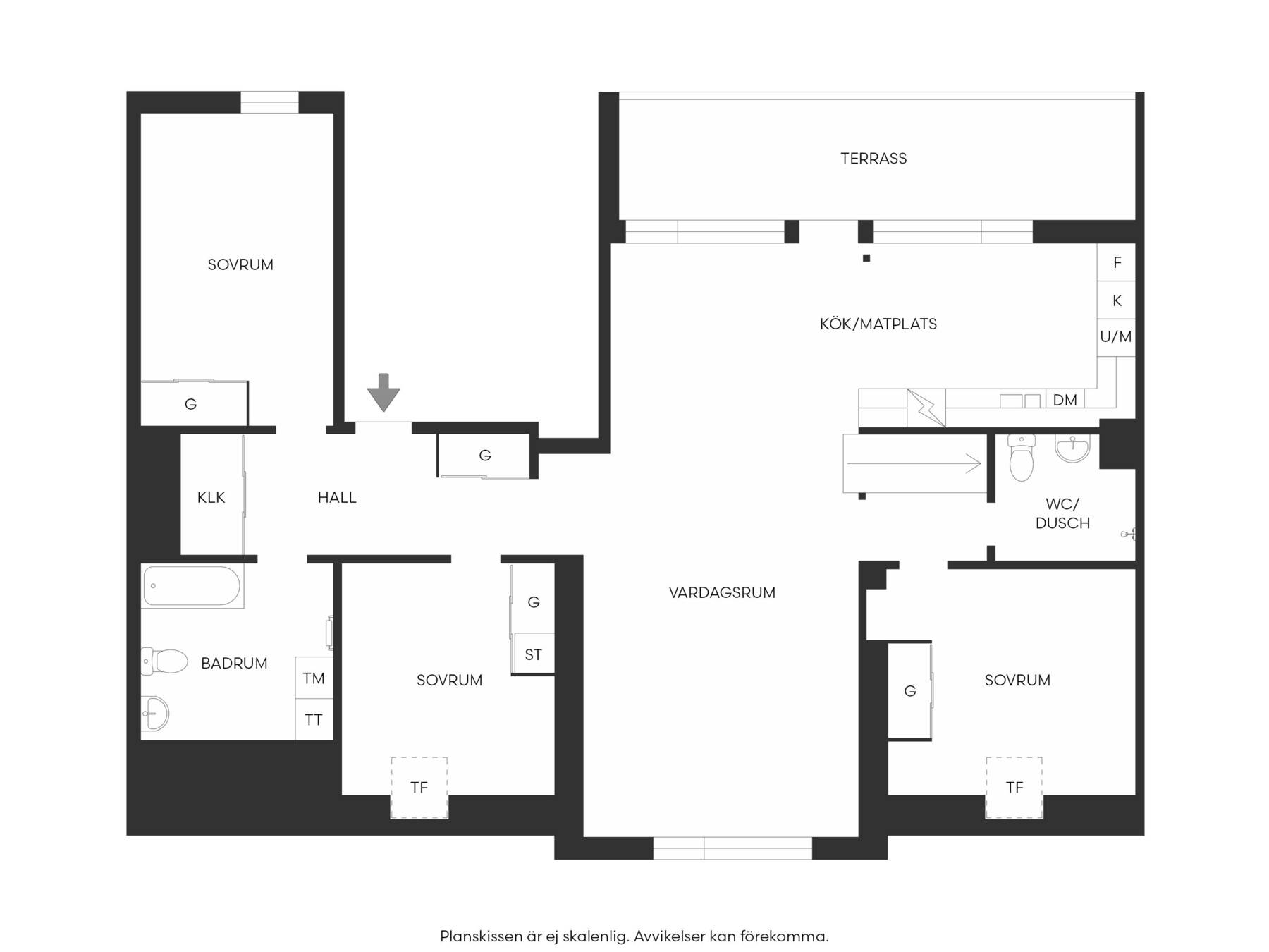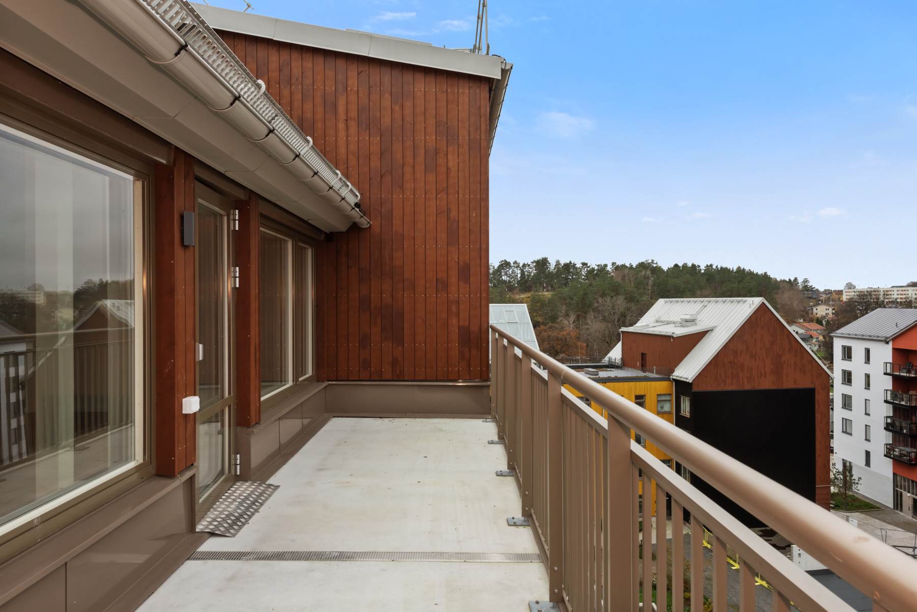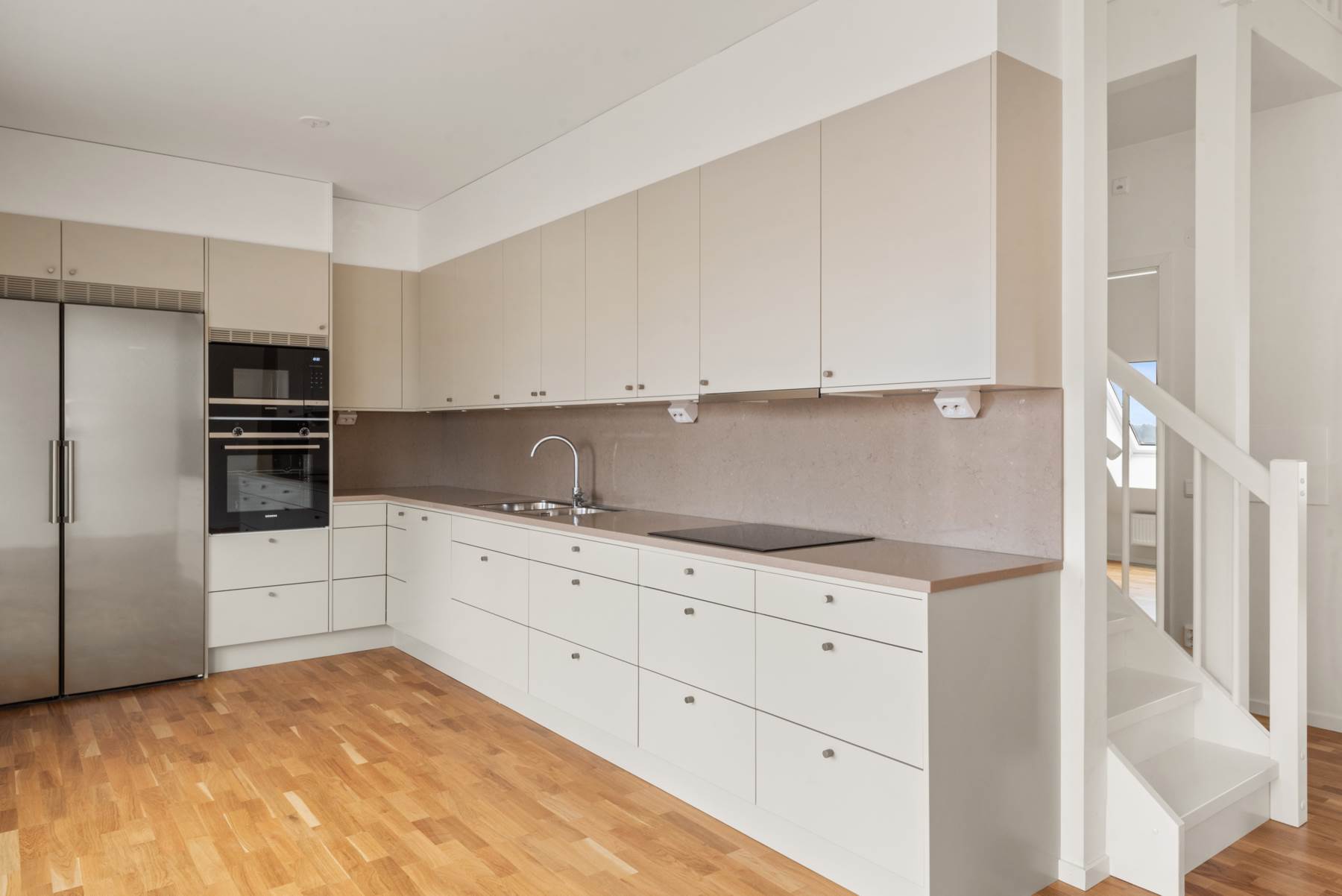 Det stilfulla och praktiska köket erbjuder generösa arbetsytor, modern utrustning och smarta lösningar för den matlagningsintresserade. Från vardagsrummet nås bostadens terrass i härligt västerläge – en perfekt plats för avkoppling eller middagar i kvällssolen.
