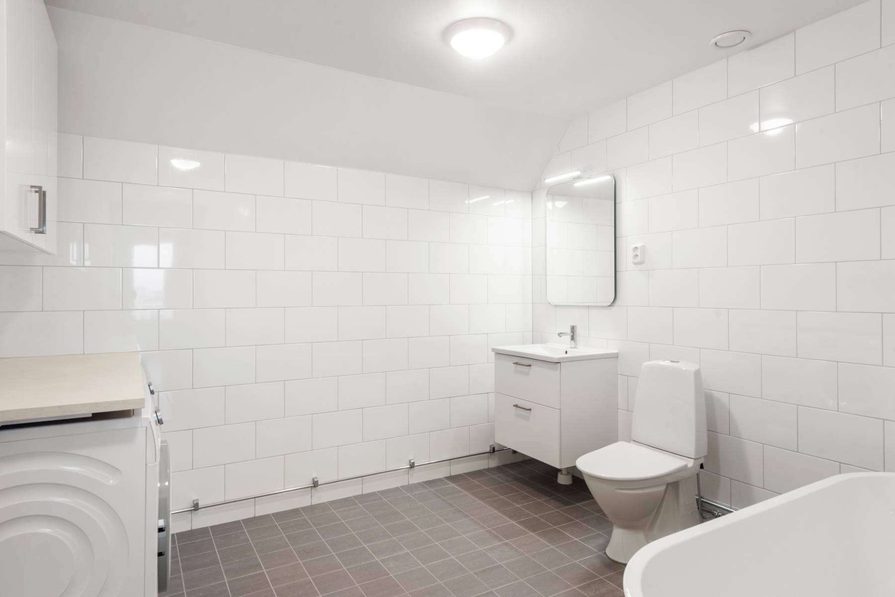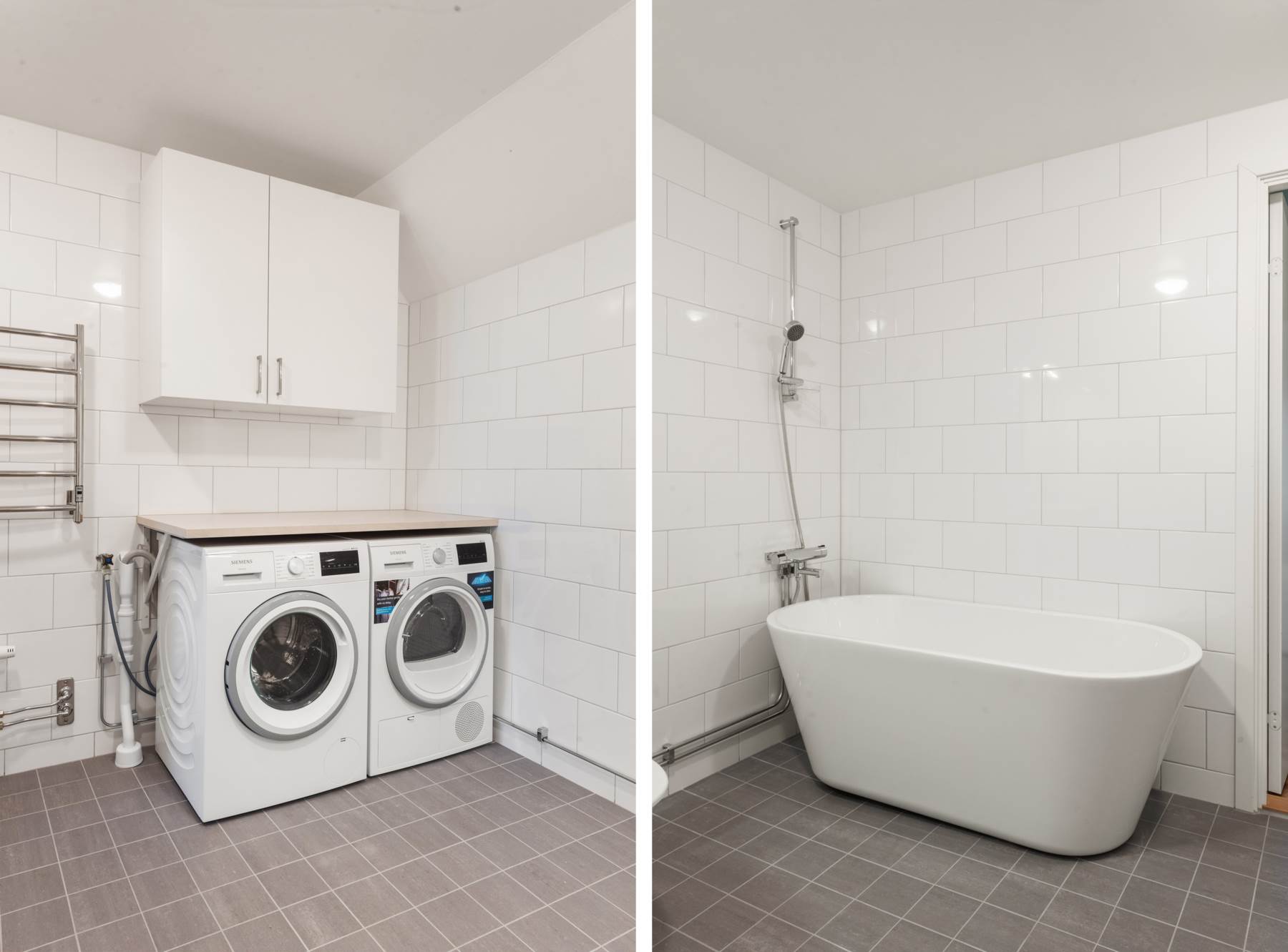 Helkaklade med grått klinkers och vitt kakel på väggarna. Golvvärme. Det mindre badrummet innehar wc, kommod från Vedum och dusch. Det stora badrummet har tvättmaskin och torktumlare, wc, kommod från Vedum samt dusch med badkar.