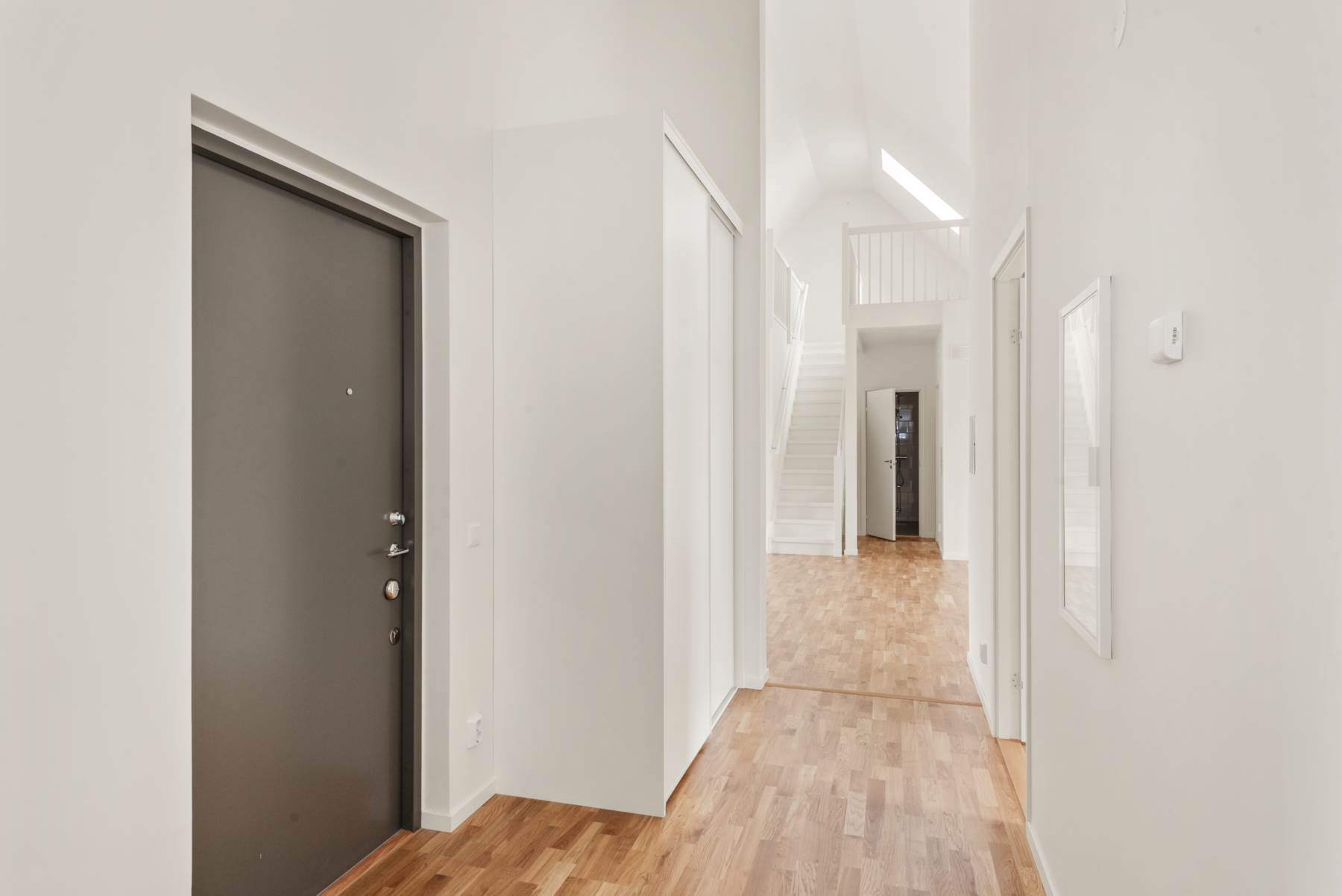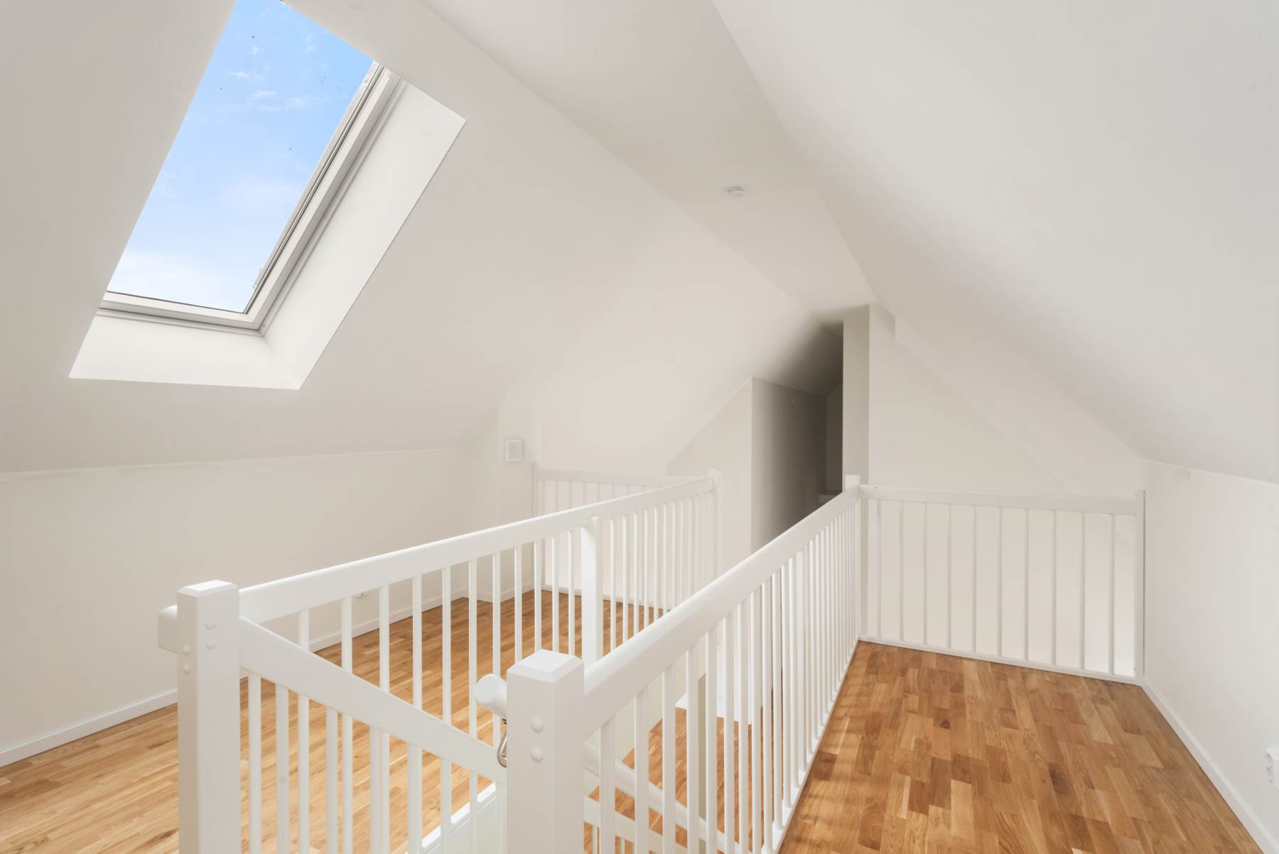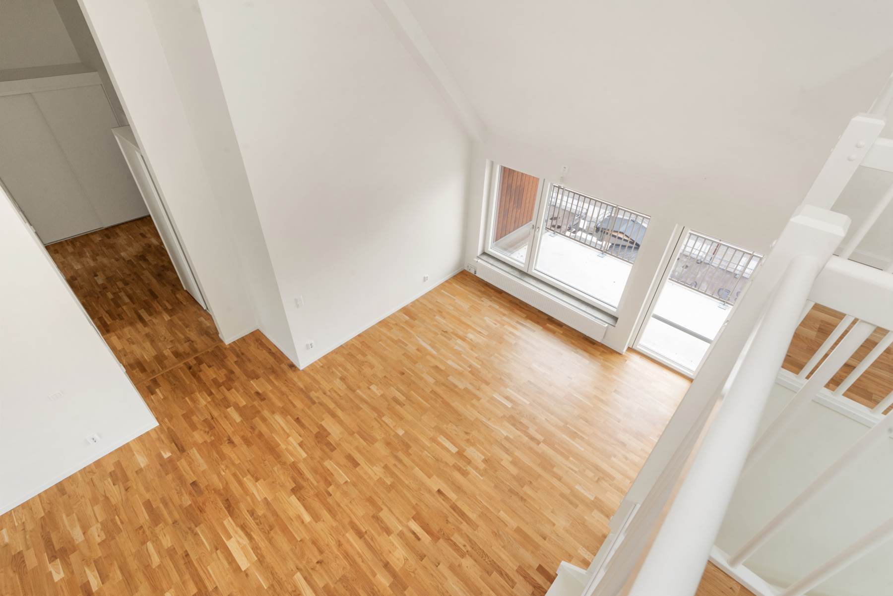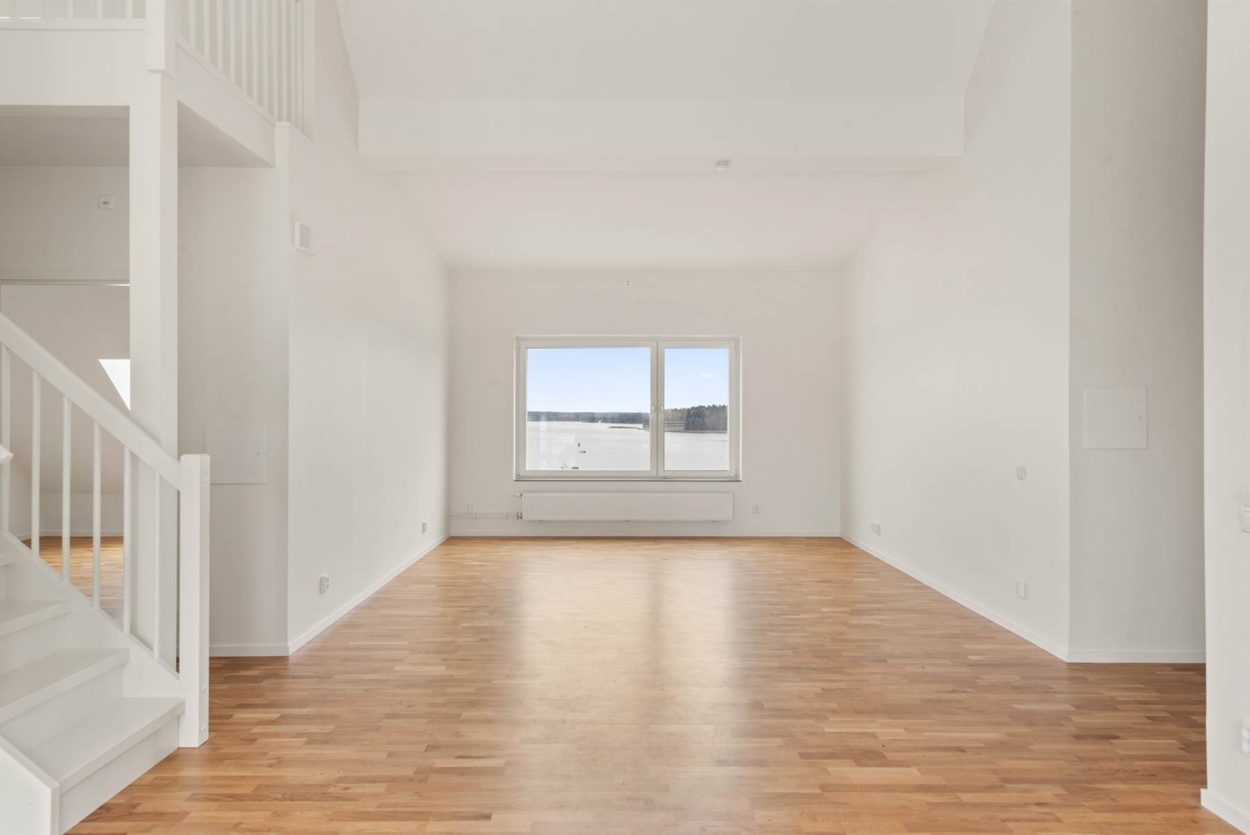 Trestavig ekparkett och vitmålade väggar.