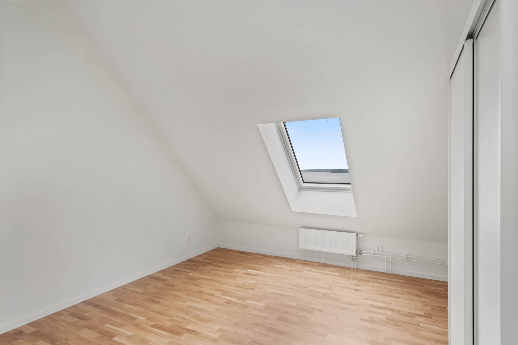 Trestavig ekparkett och vitmålade väggar. Garderob med skjutbara dörrar.