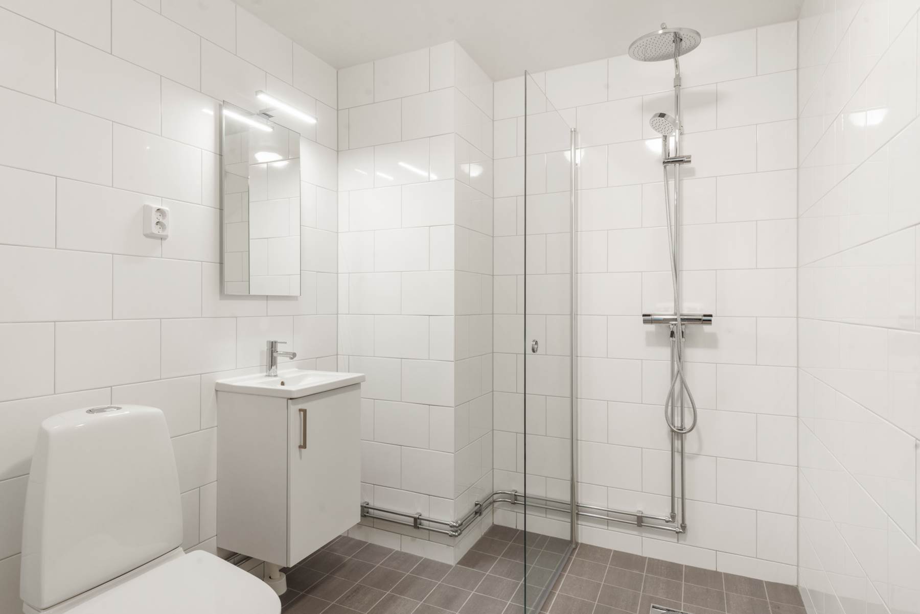 Två smakfulla och moderna badrum förstärker känslan av kvalitet. De är utrustade med genomtänkta materialval och stilren design, vilket ger en behaglig vardagslyx.