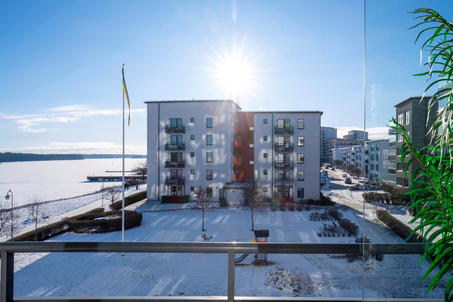 Lägenheten har ytterligare en balkong där man njuter av kvällssolen samt utsikt mot Hägernäsviken.