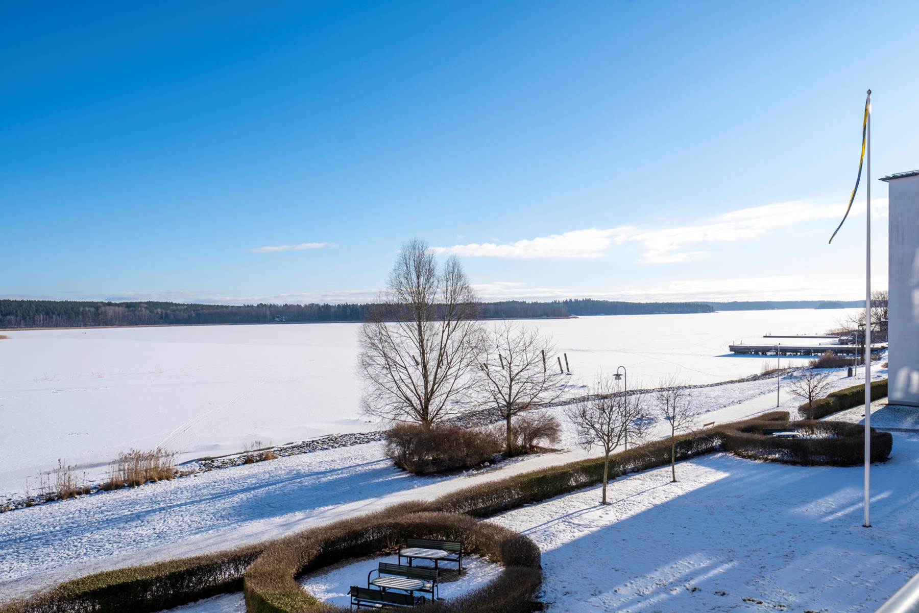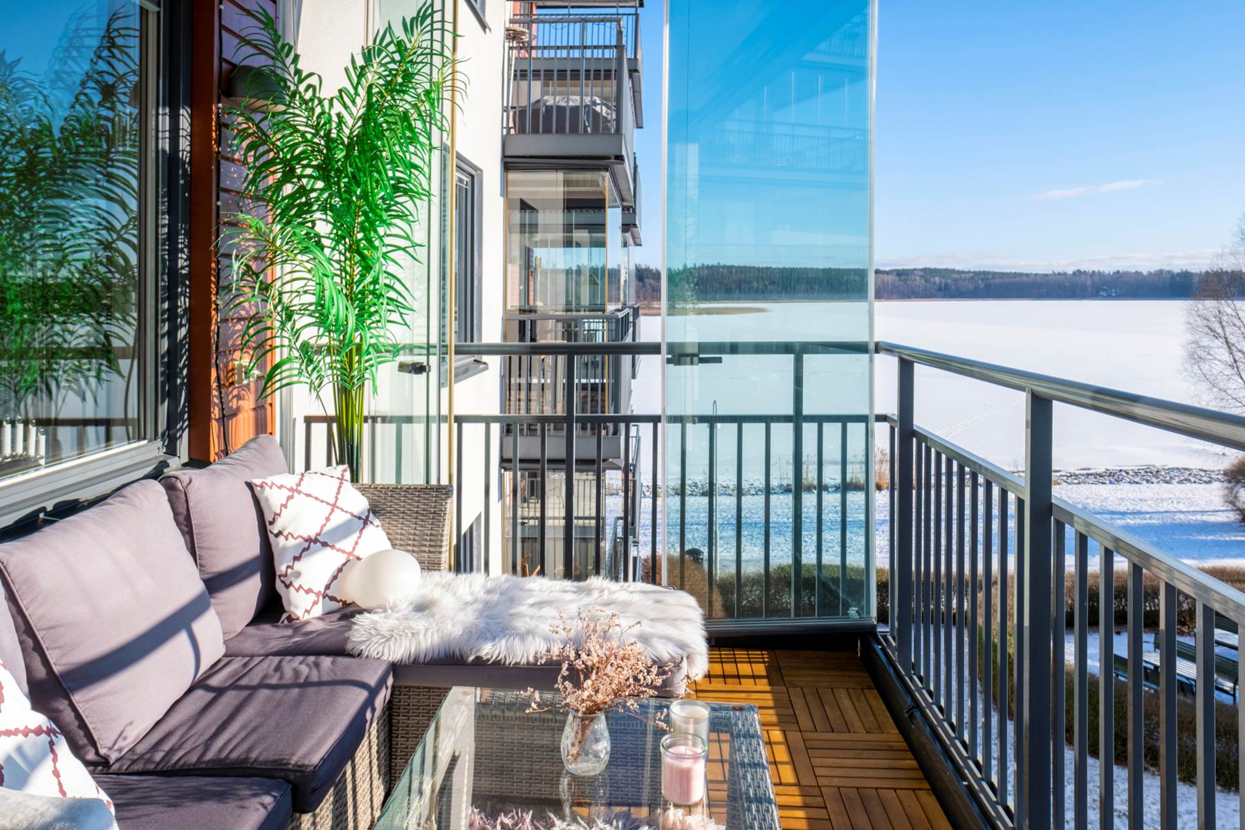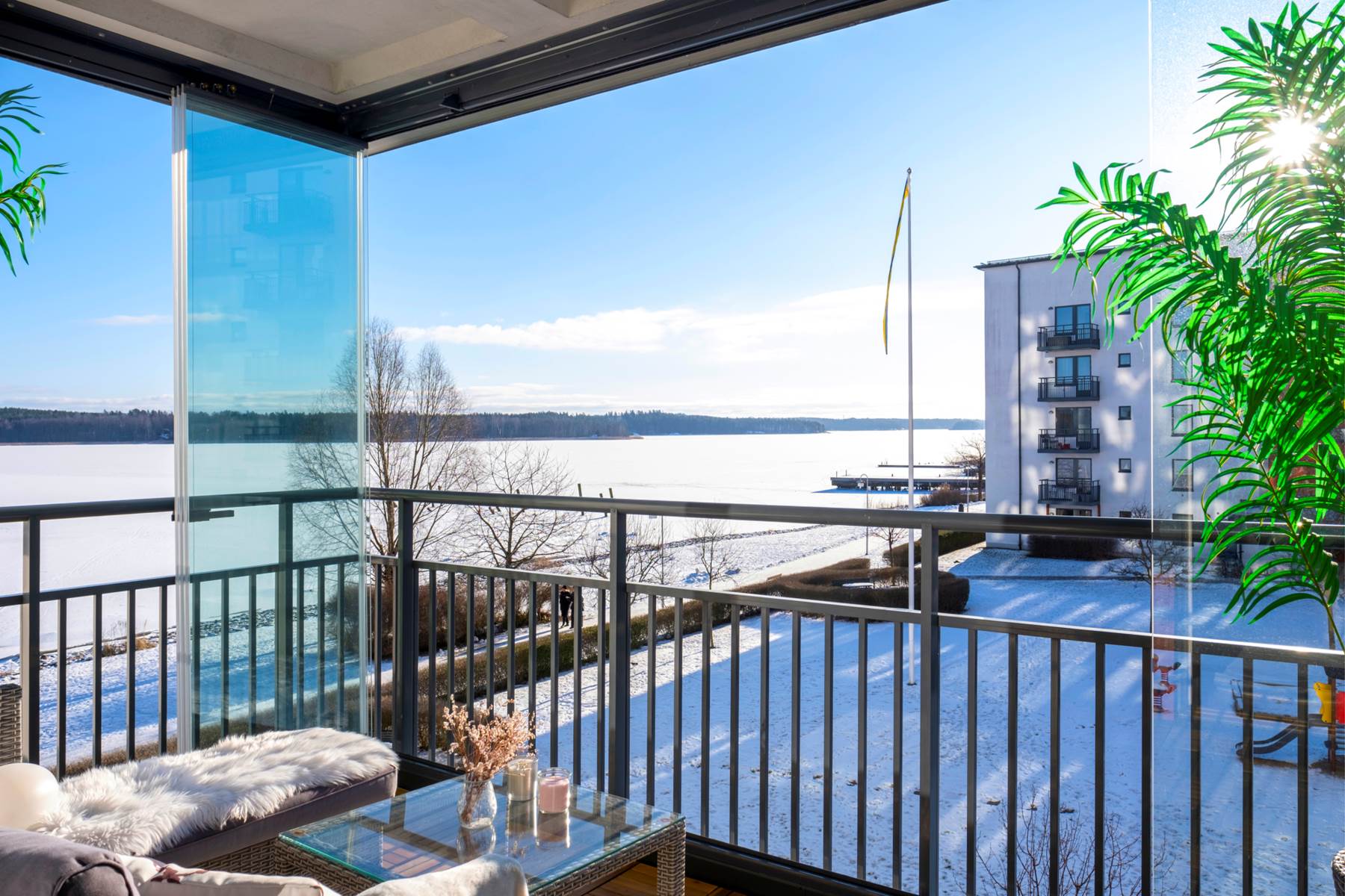 Rymlig balkong i ett perfekt söderläge där man njuter av solen i stort sett hela dagen samt den magiska utsikten över Hägernäsviken.