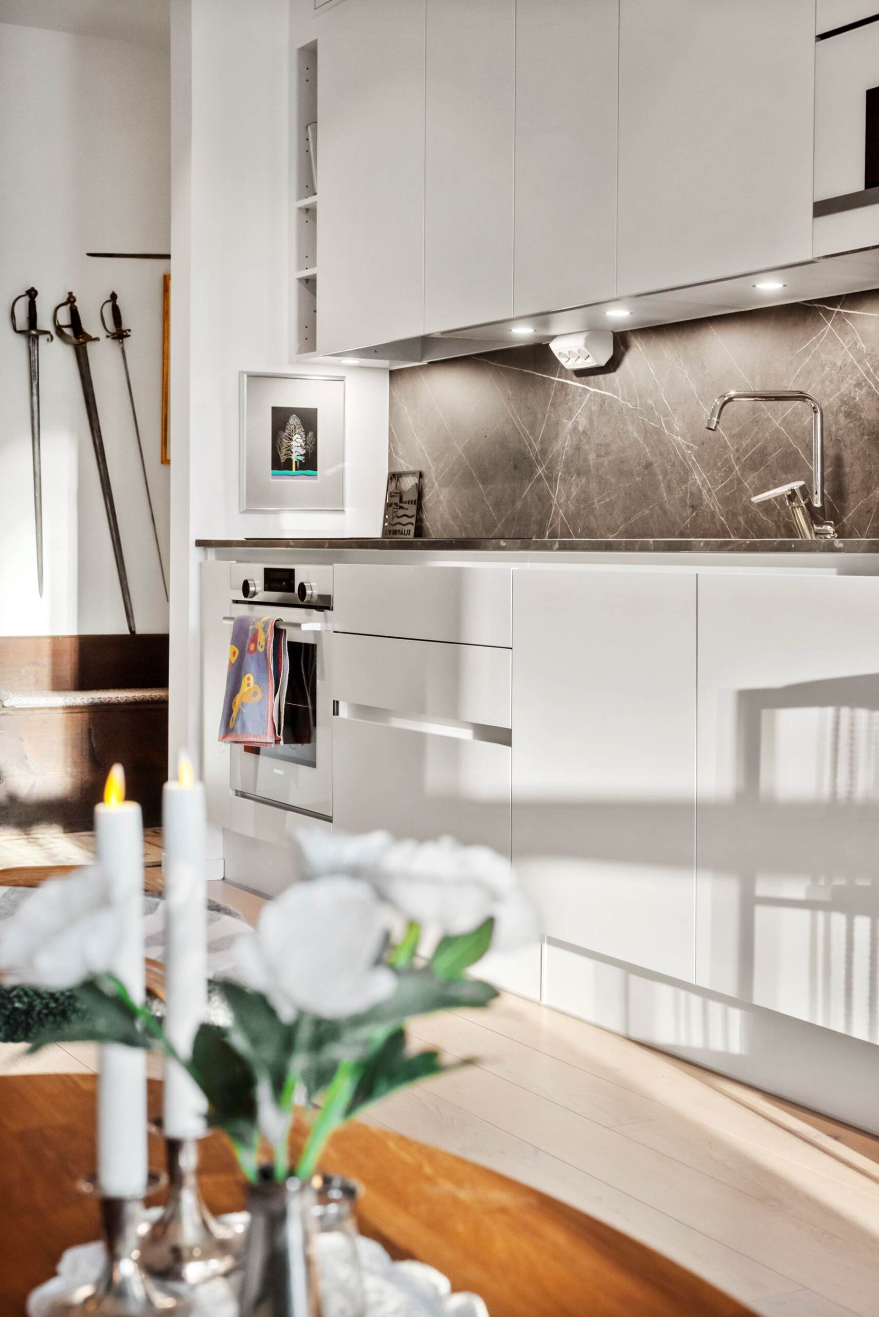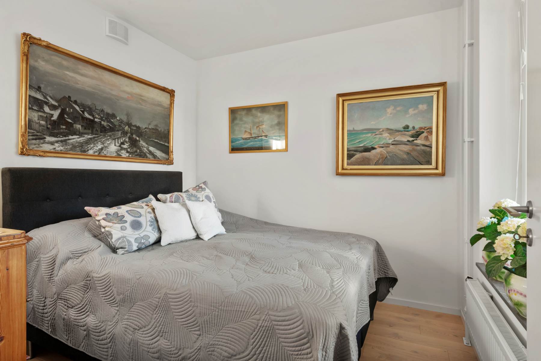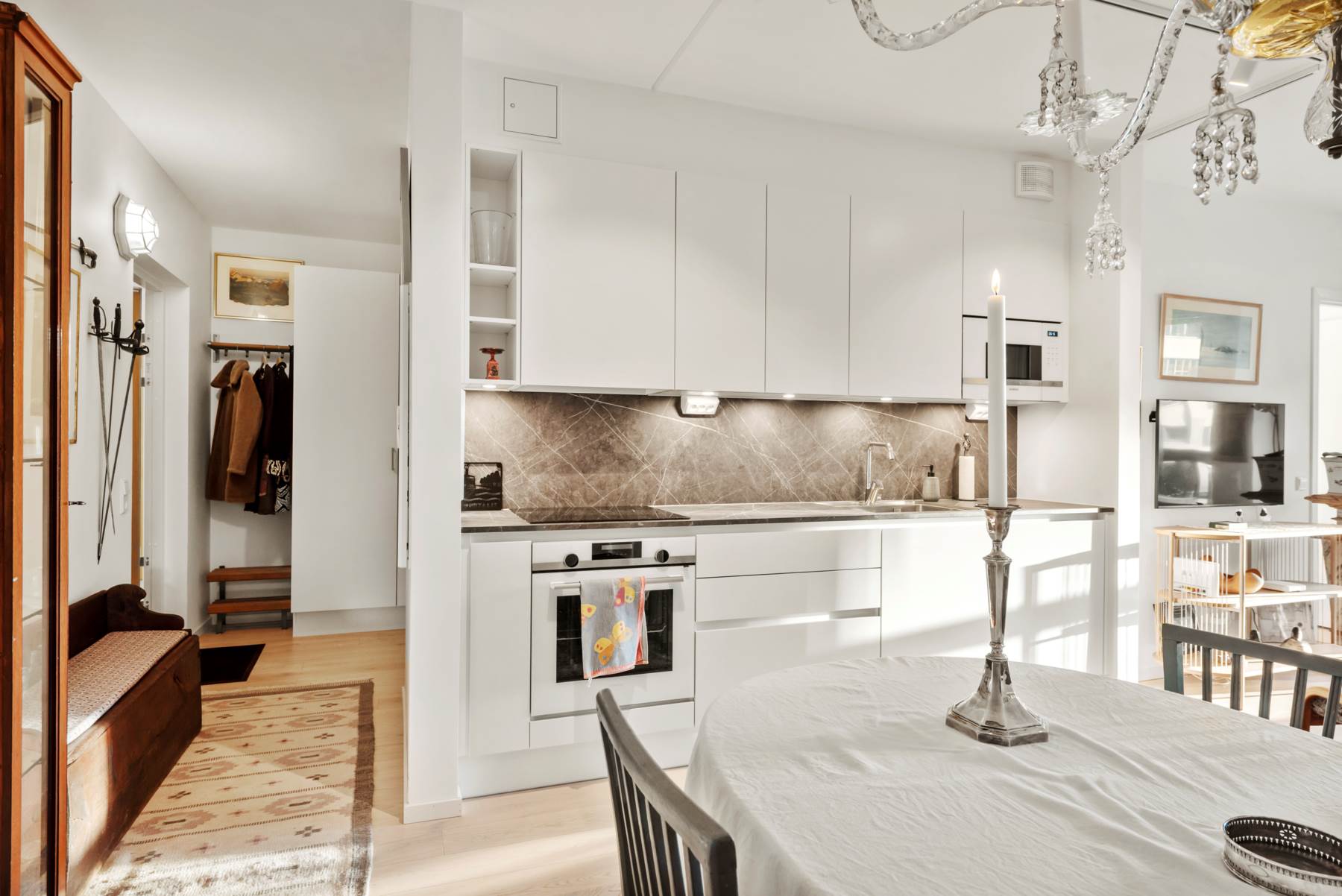 Köket är både funktionellt och trivsamt med gott om arbetsytor och plats för matbord, vilket gör det enkelt att bjuda in vänner eller njuta av lugna vardagsmiddagar. Sovrummet är rofyllt och väl tilltaget för nattens goda drömmar, och det stilrena badrummet bidrar till en bekväm och praktisk vardag. Här har du både torktumlare och tvättmaskin med avlastningsytor.
